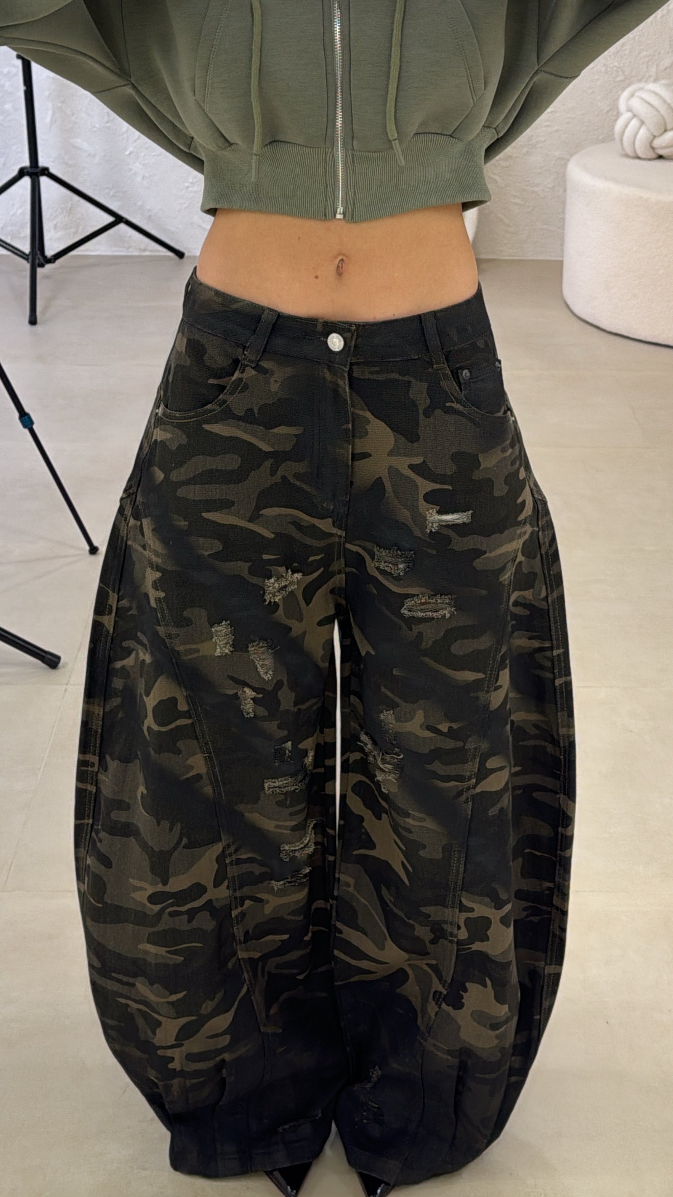 Jeans a vita media modello balloon con sfumature a contrasto. Cerniera frontale con bottone. La modella indossa taglia S.