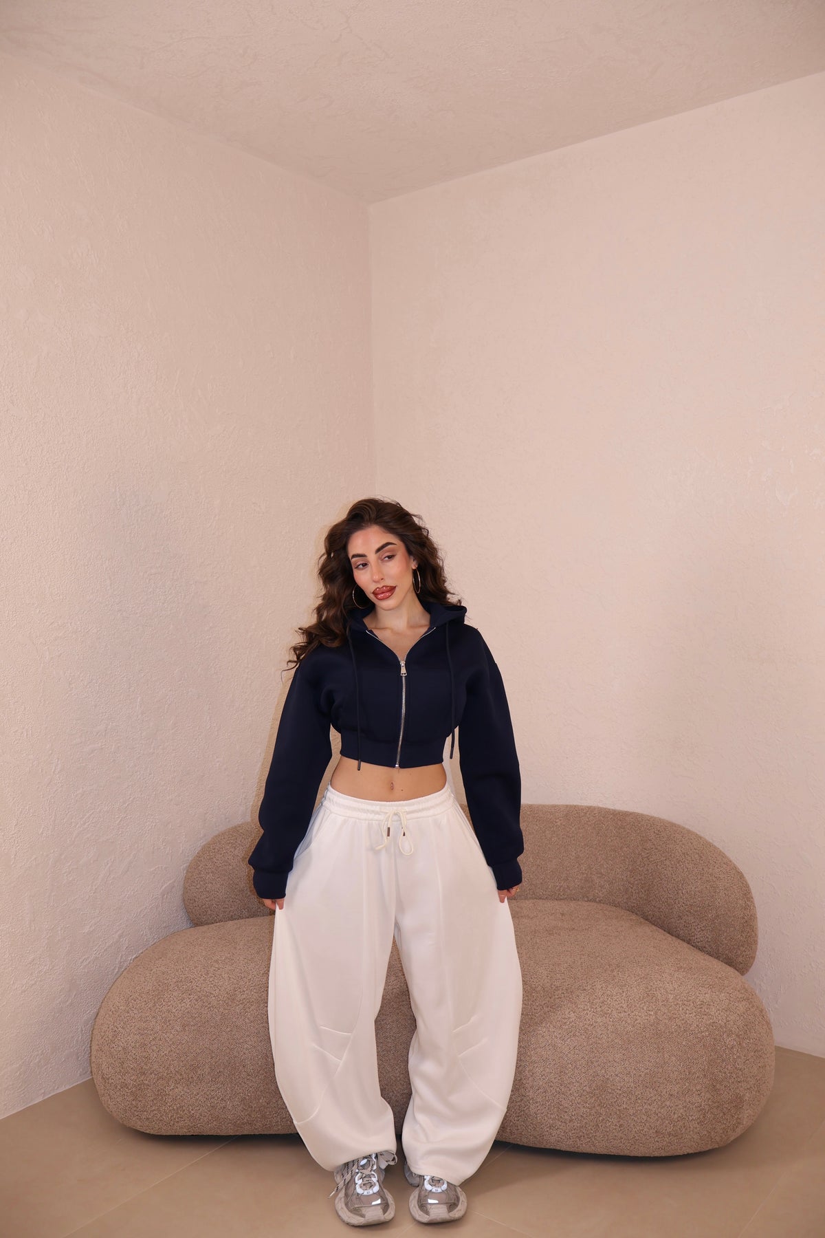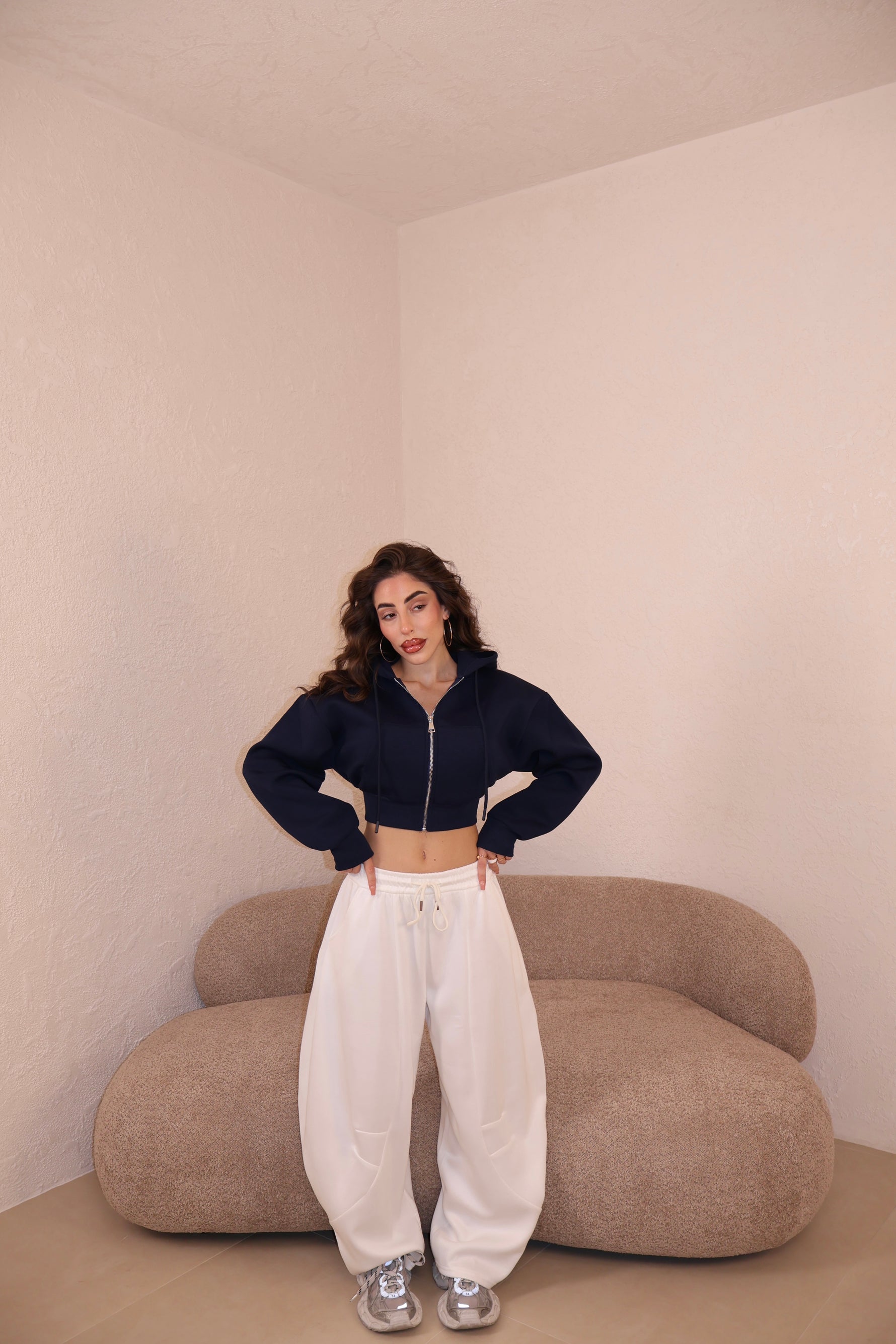 Pantaloni di tuta modello balloon con elastico e laccetti regolabili.