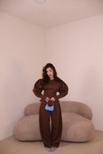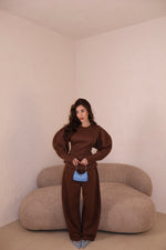 Pantatura modello balloon con elastico in vita e laccetti regolabili. La modella indossa taglia S/M.
