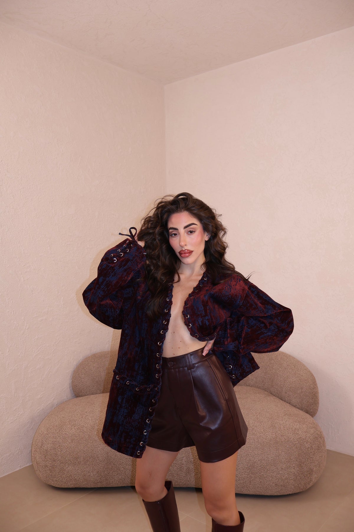 Prezzo unitario / perShorts in similpelle vita alta con bottone. La modella indossa taglia XS.
