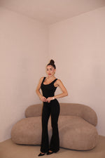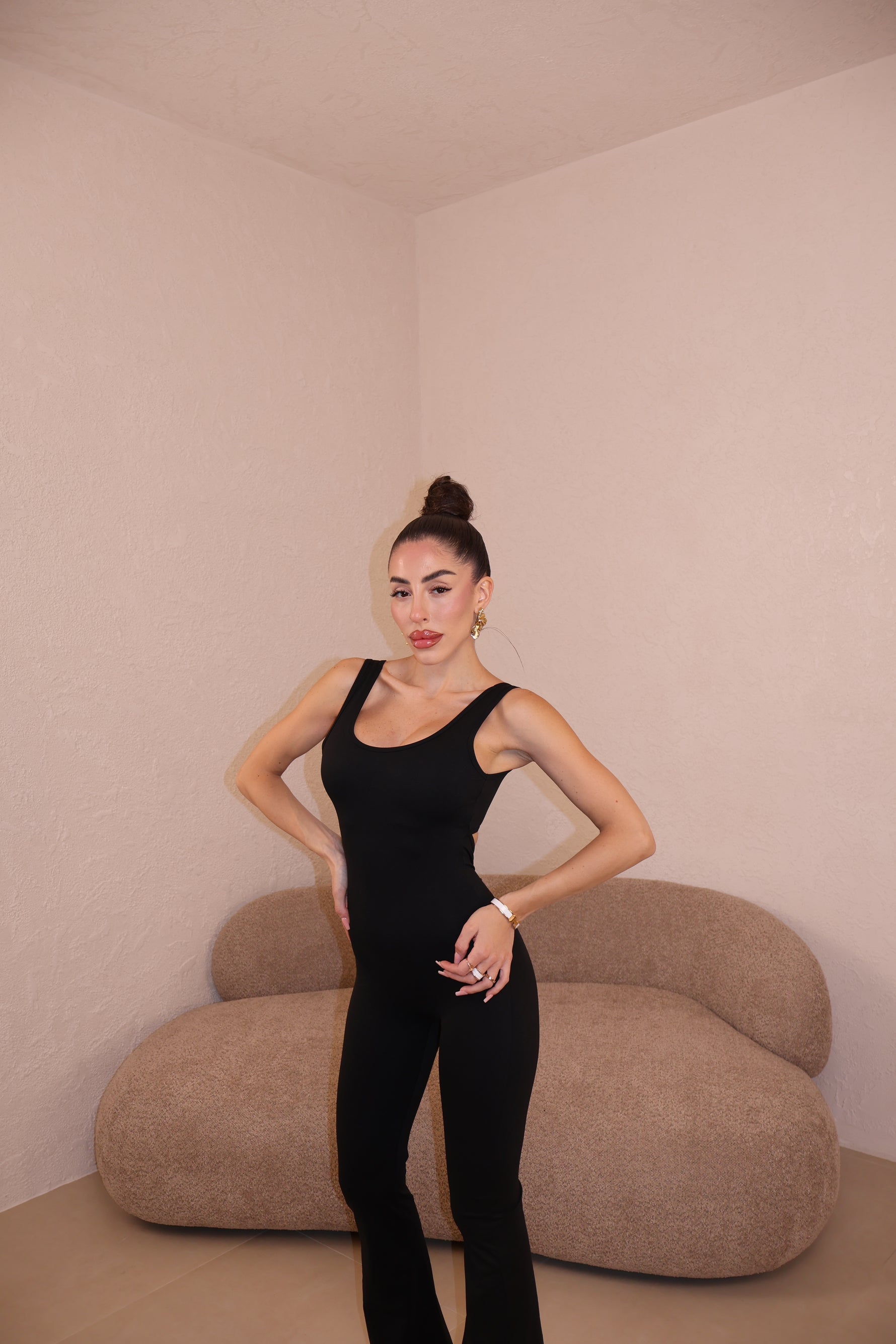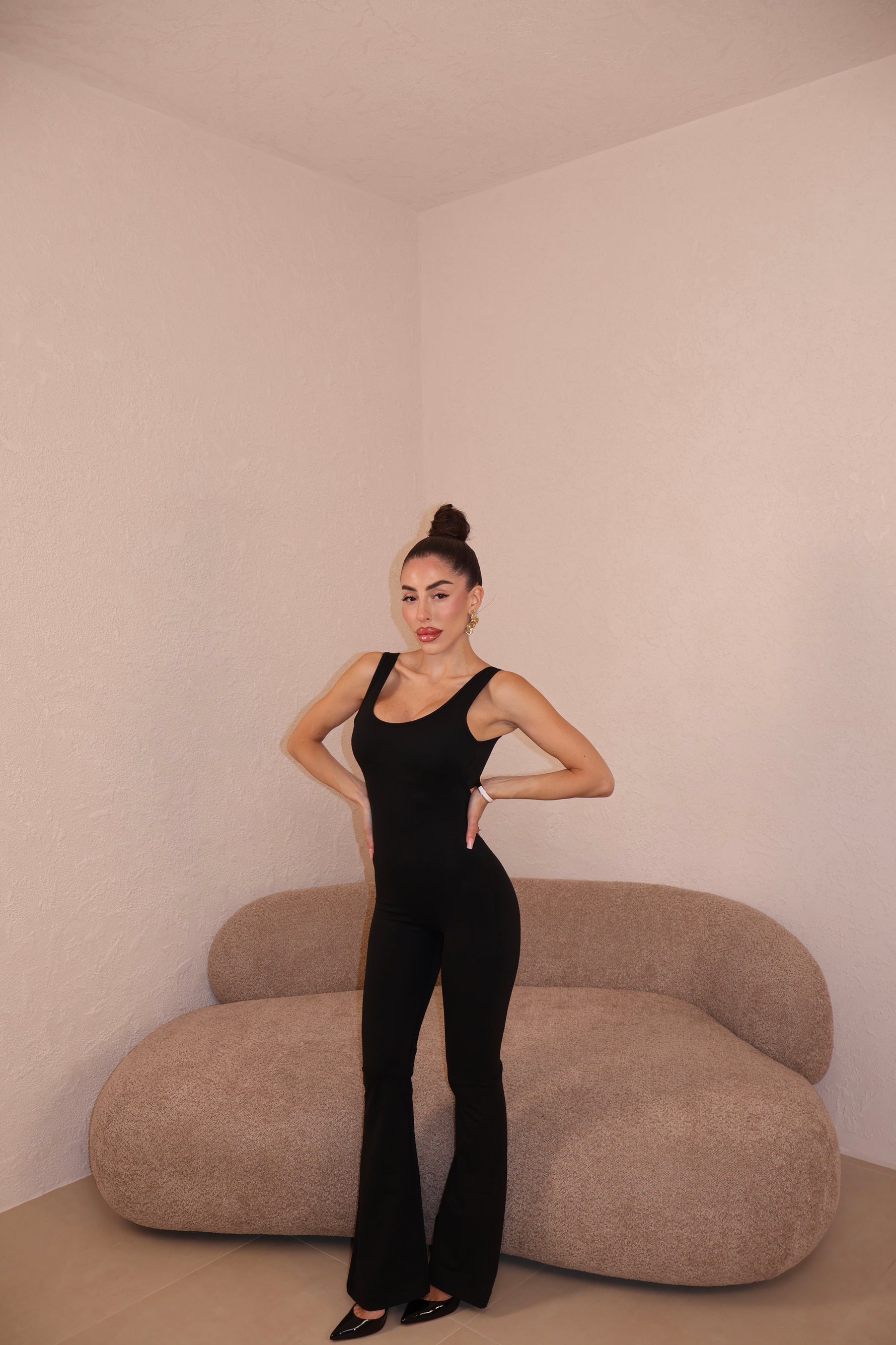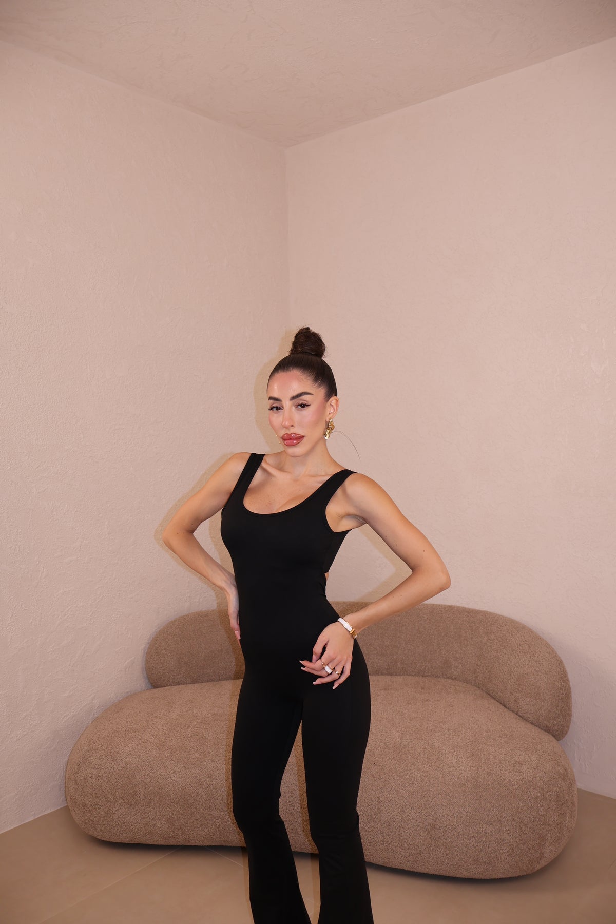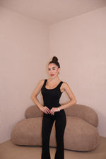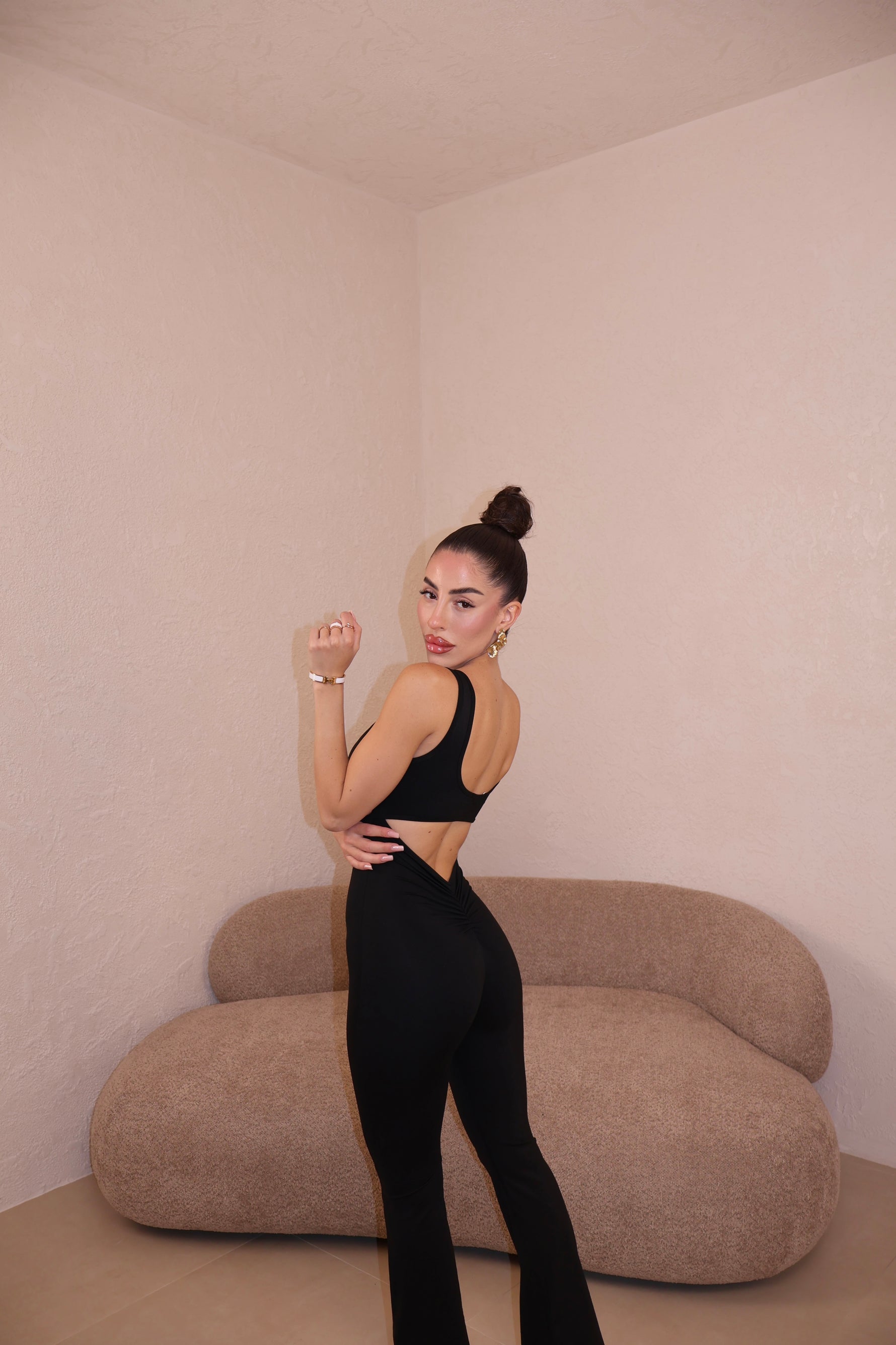 Jumpsuit in licra a zampa. Effetto pushup sul retro. Coppe imbottite. Tessuto contenitivo.