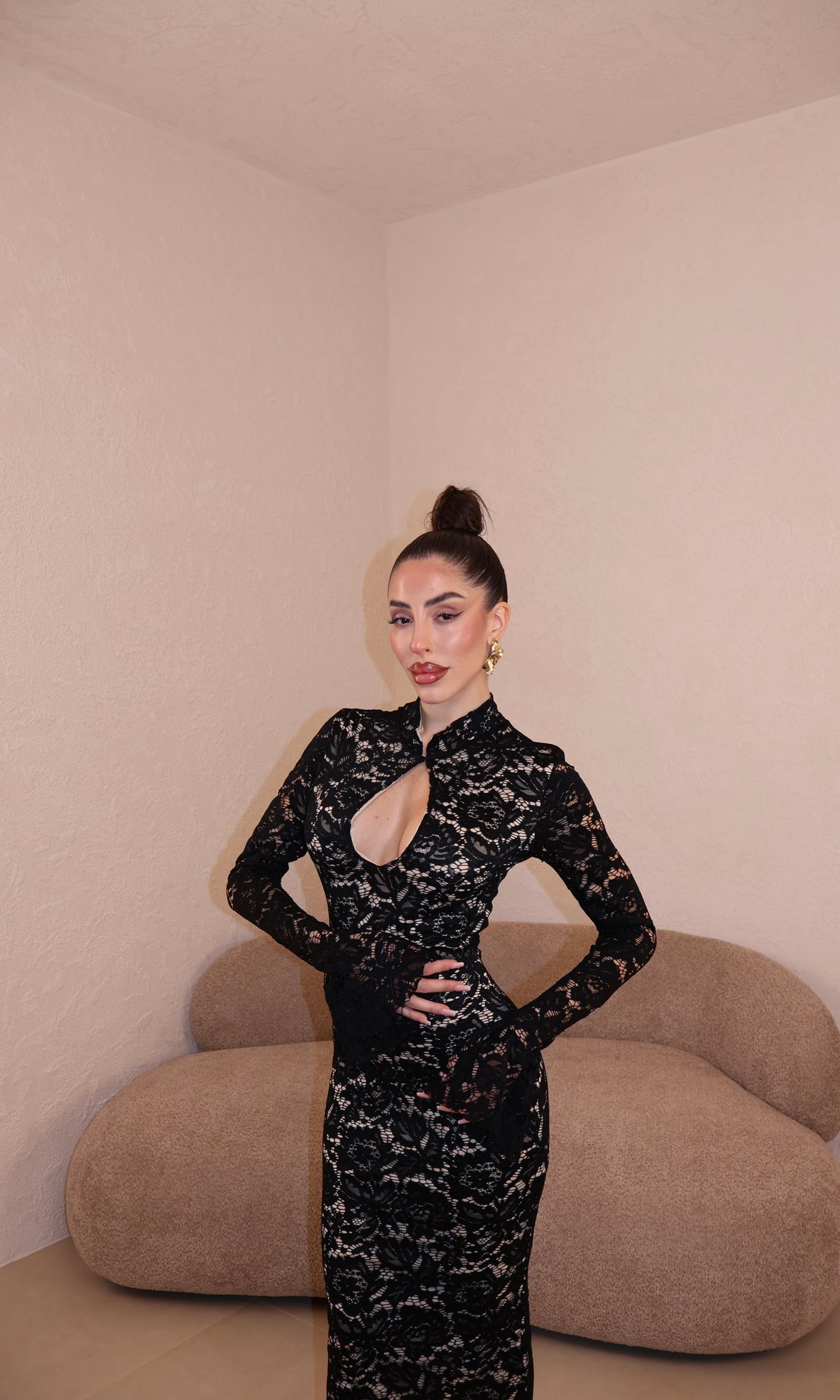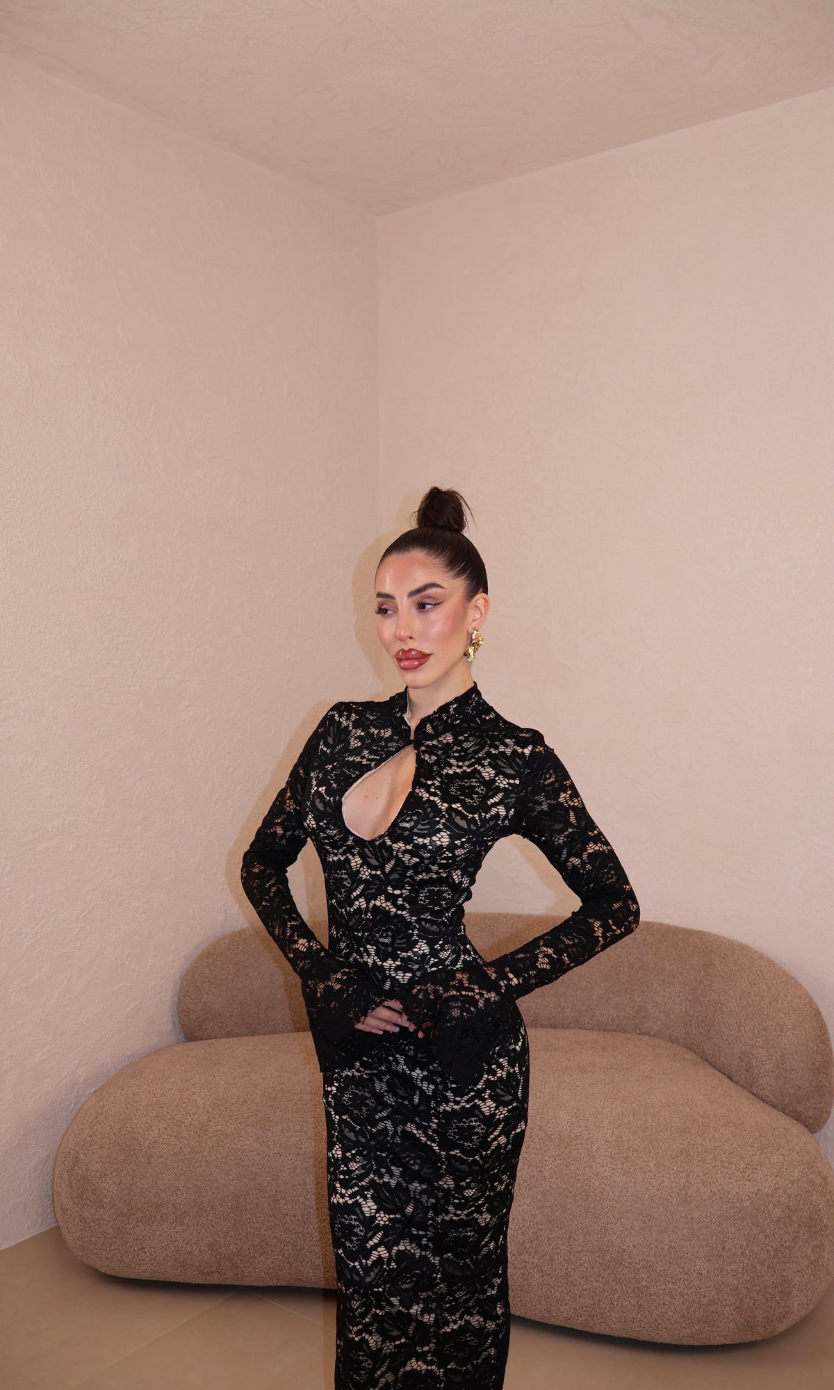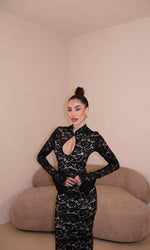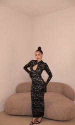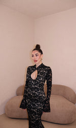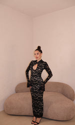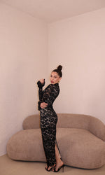 Abito lungo in pizzo con apertura frontale. Taglia unica.