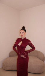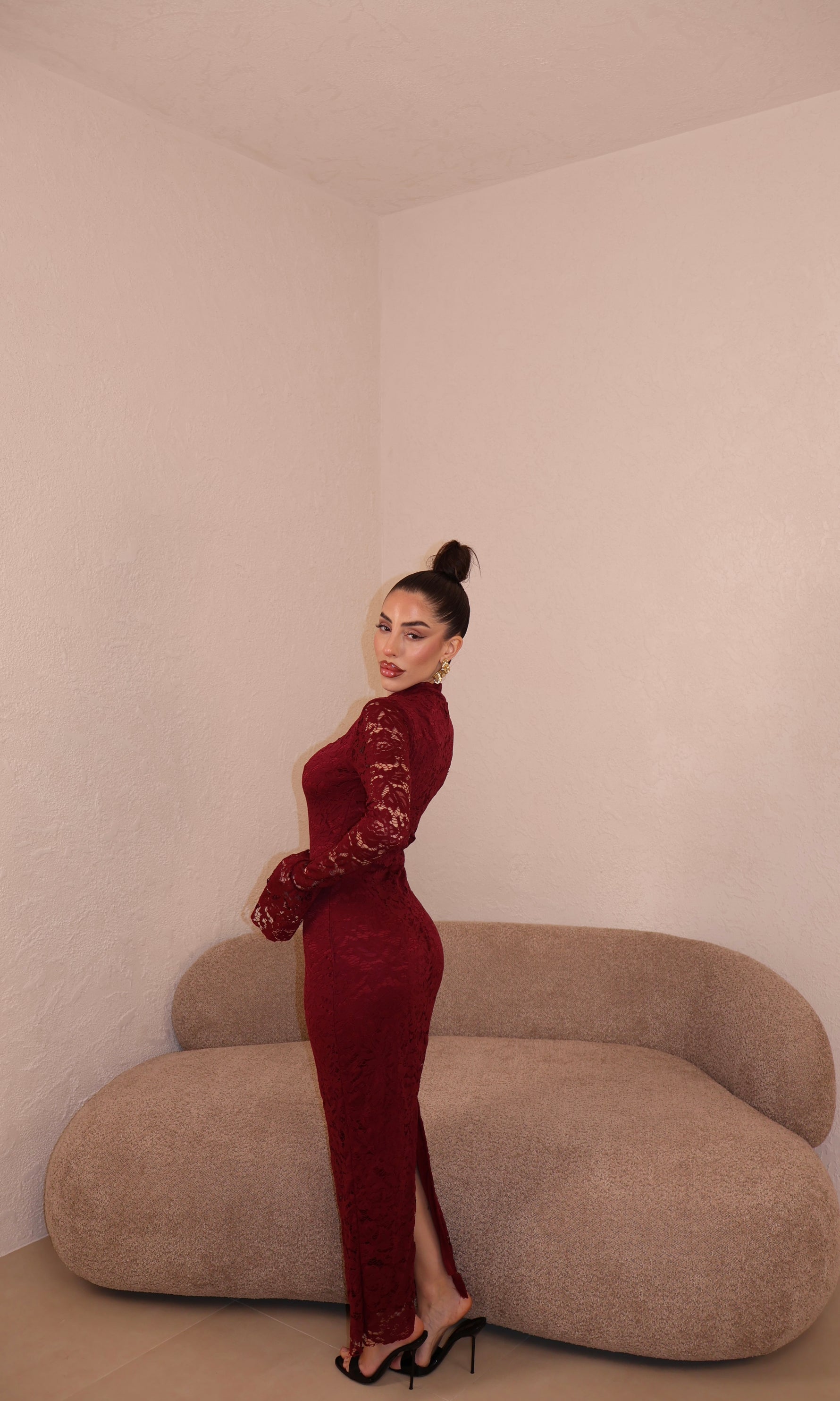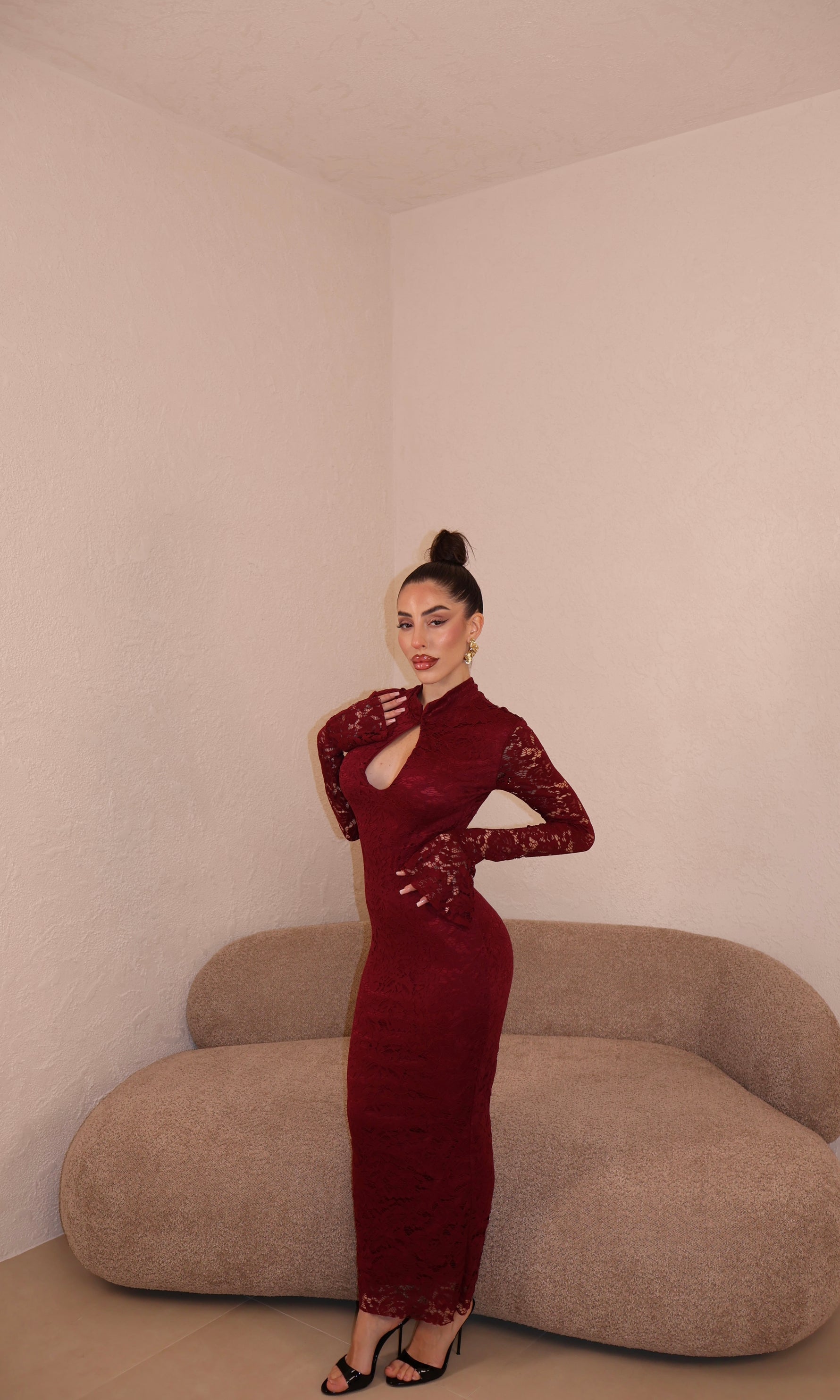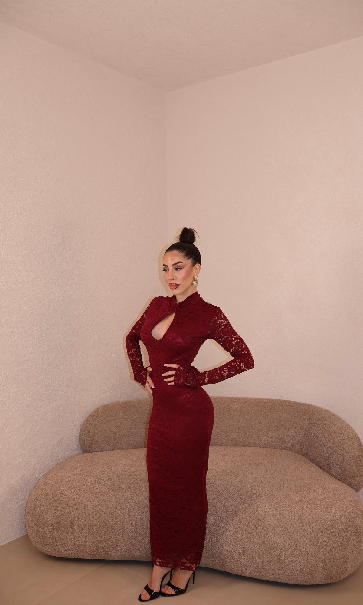 Abito lungo in pizzo con apertura frontale. Taglia unica.
