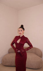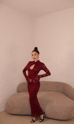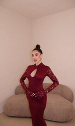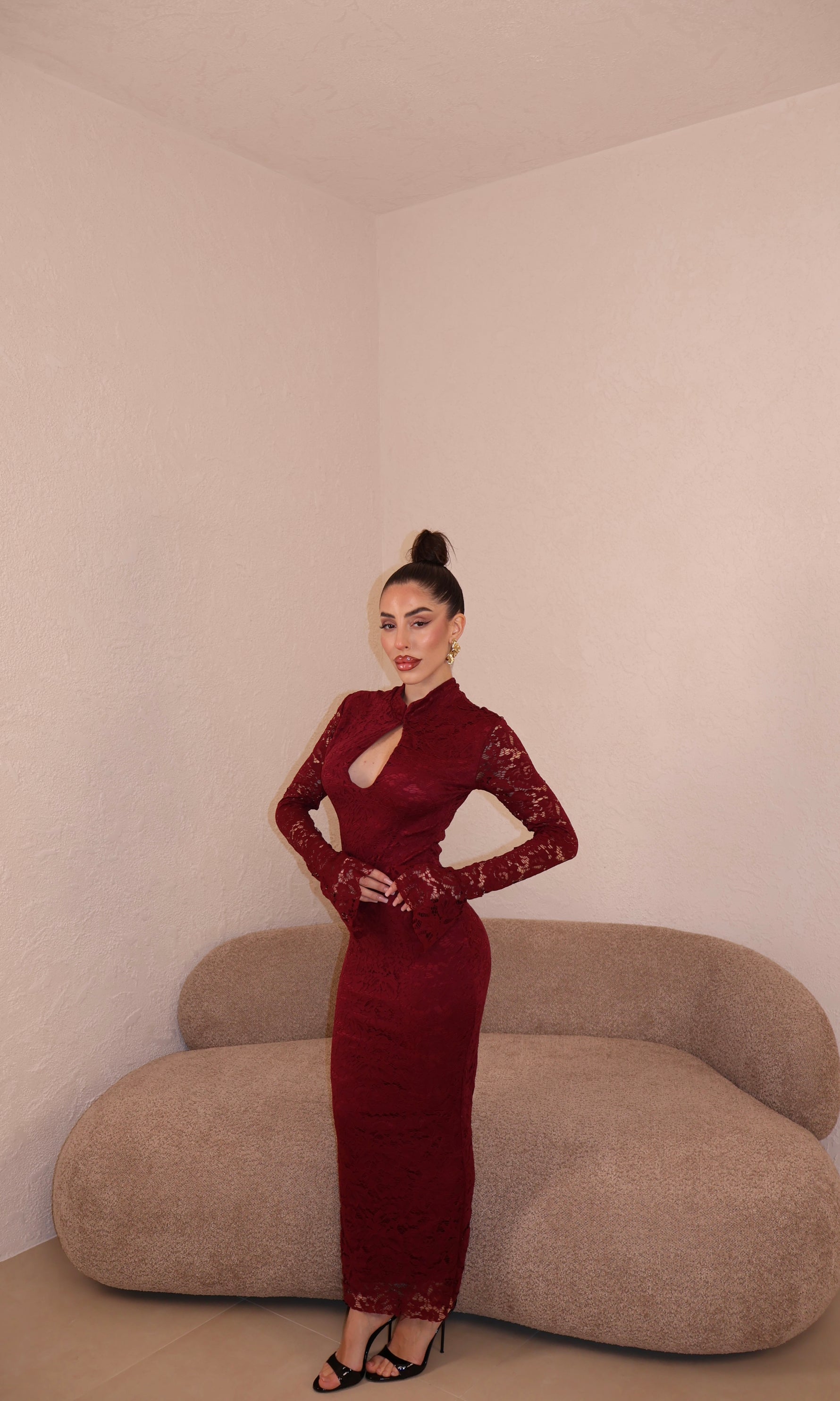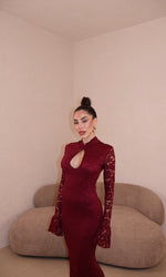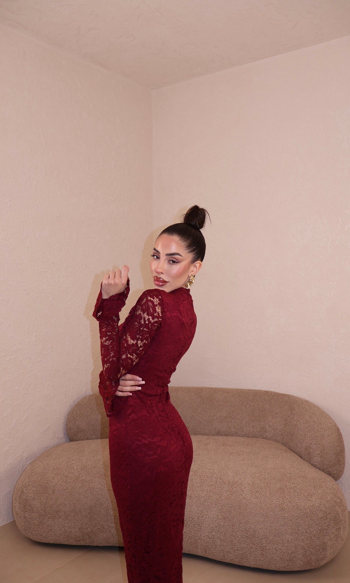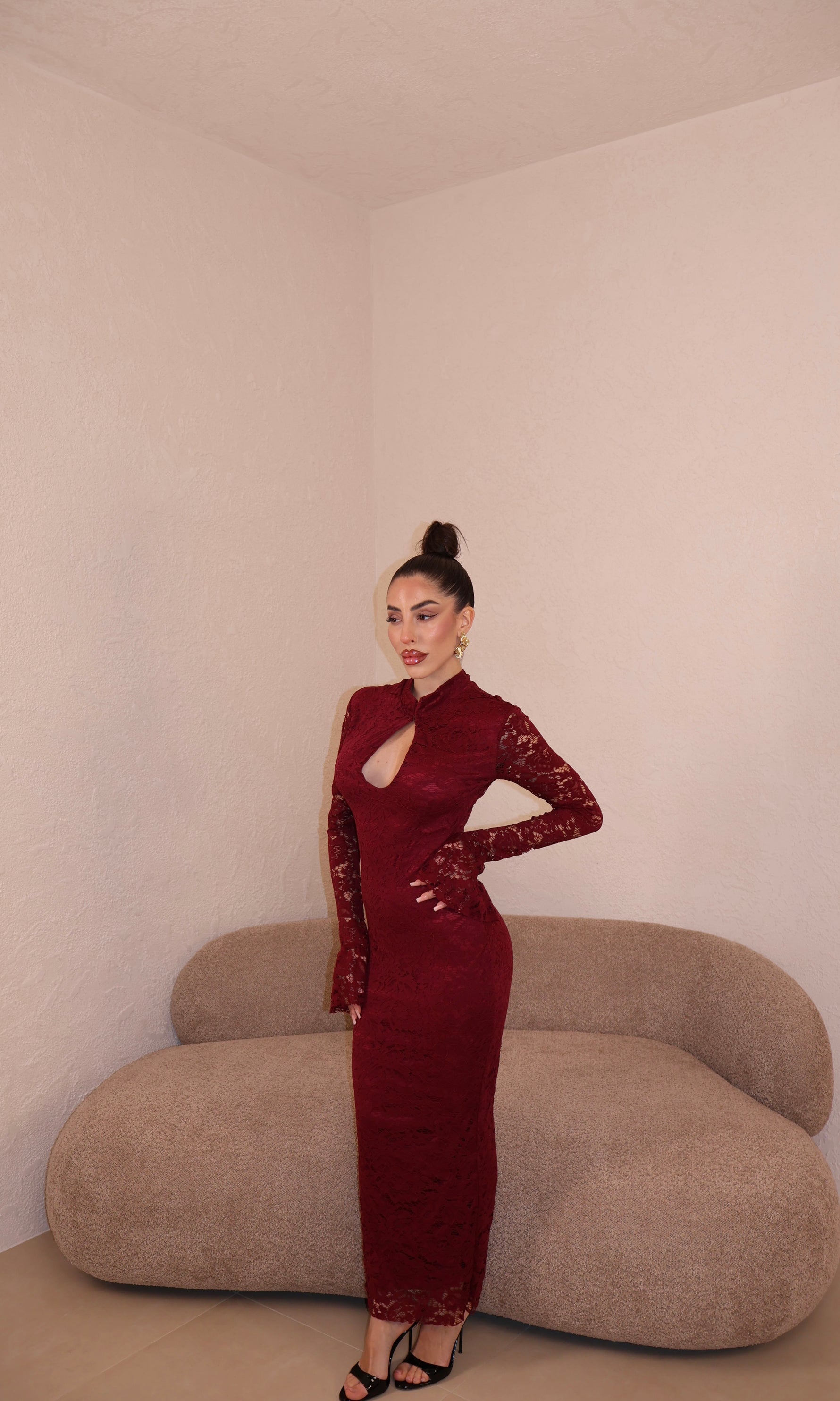 Abito lungo in pizzo con apertura frontale. Taglia unica.
