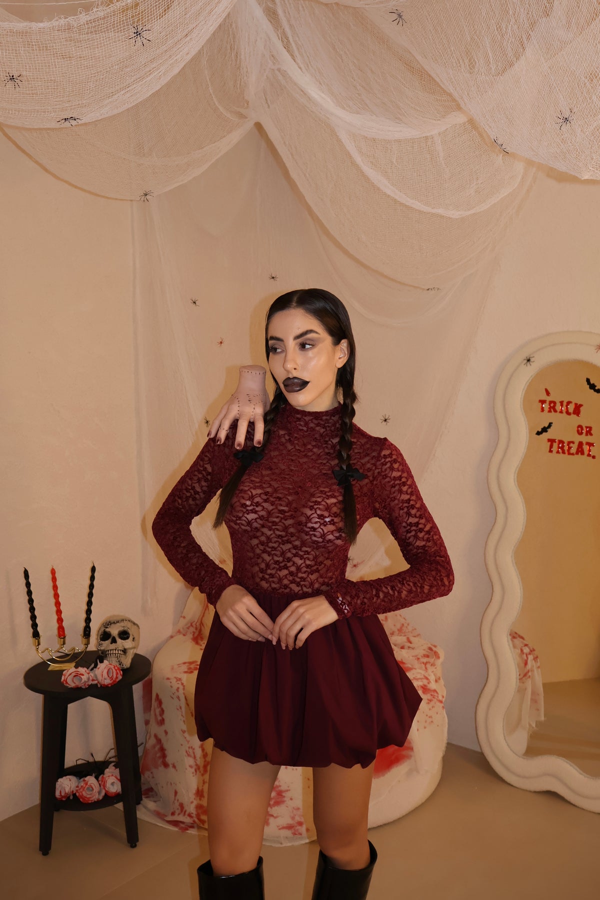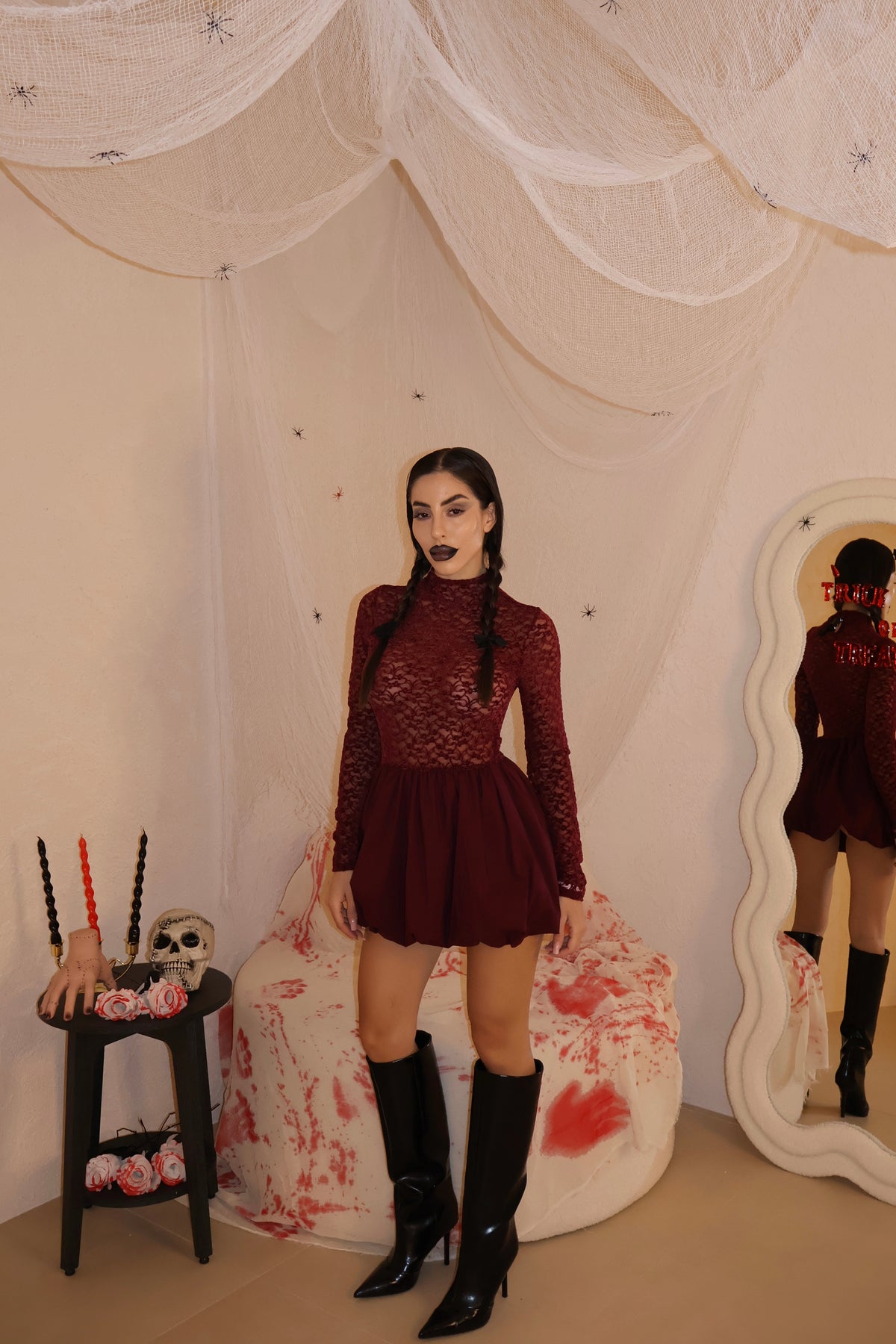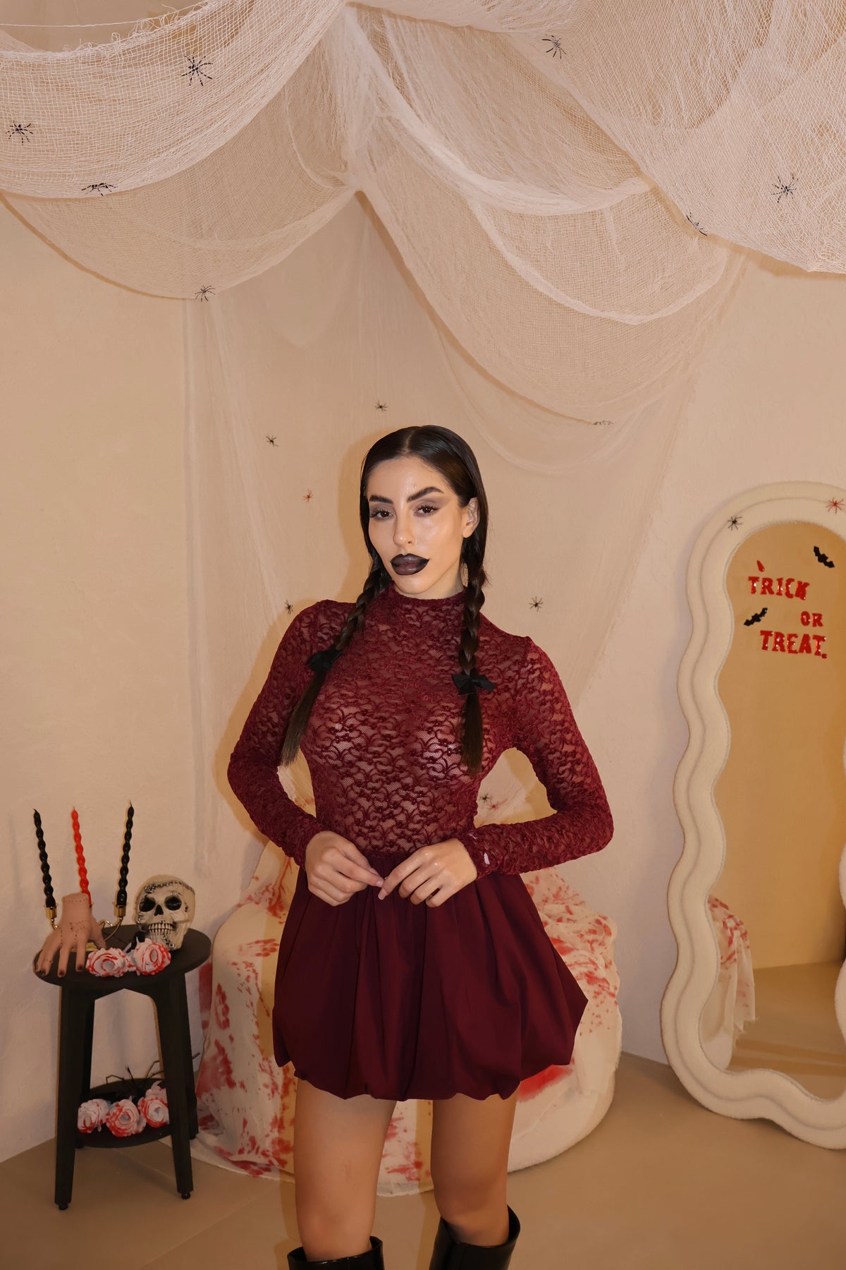 Abito corto composto da gonna balloon e maglia in pizzo uniti. Taglia unica.