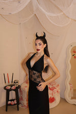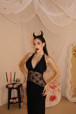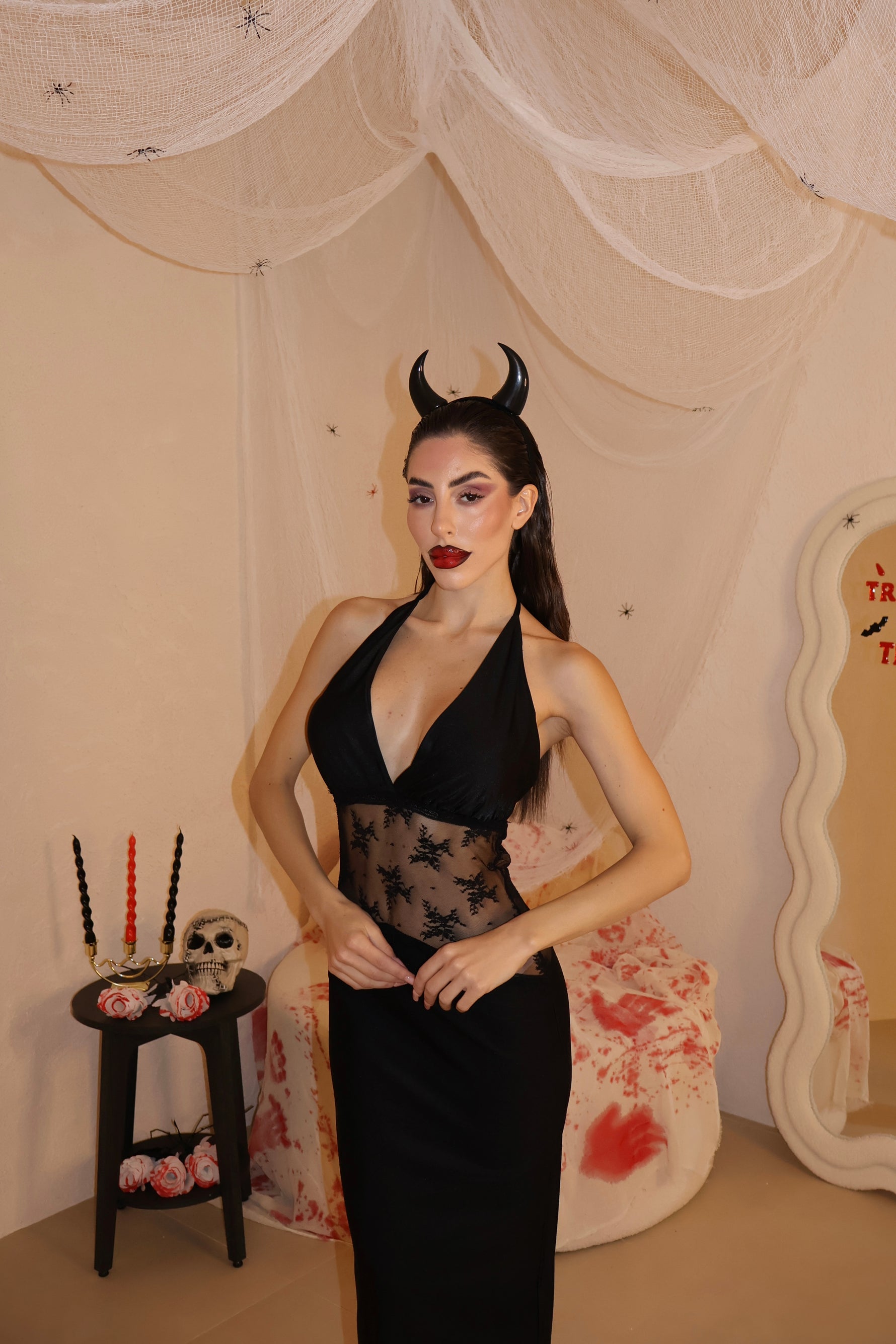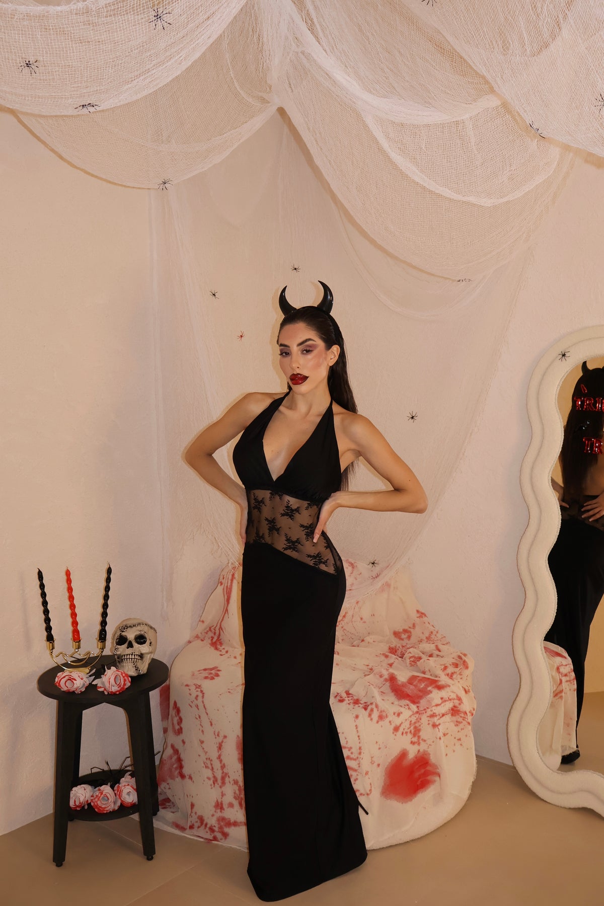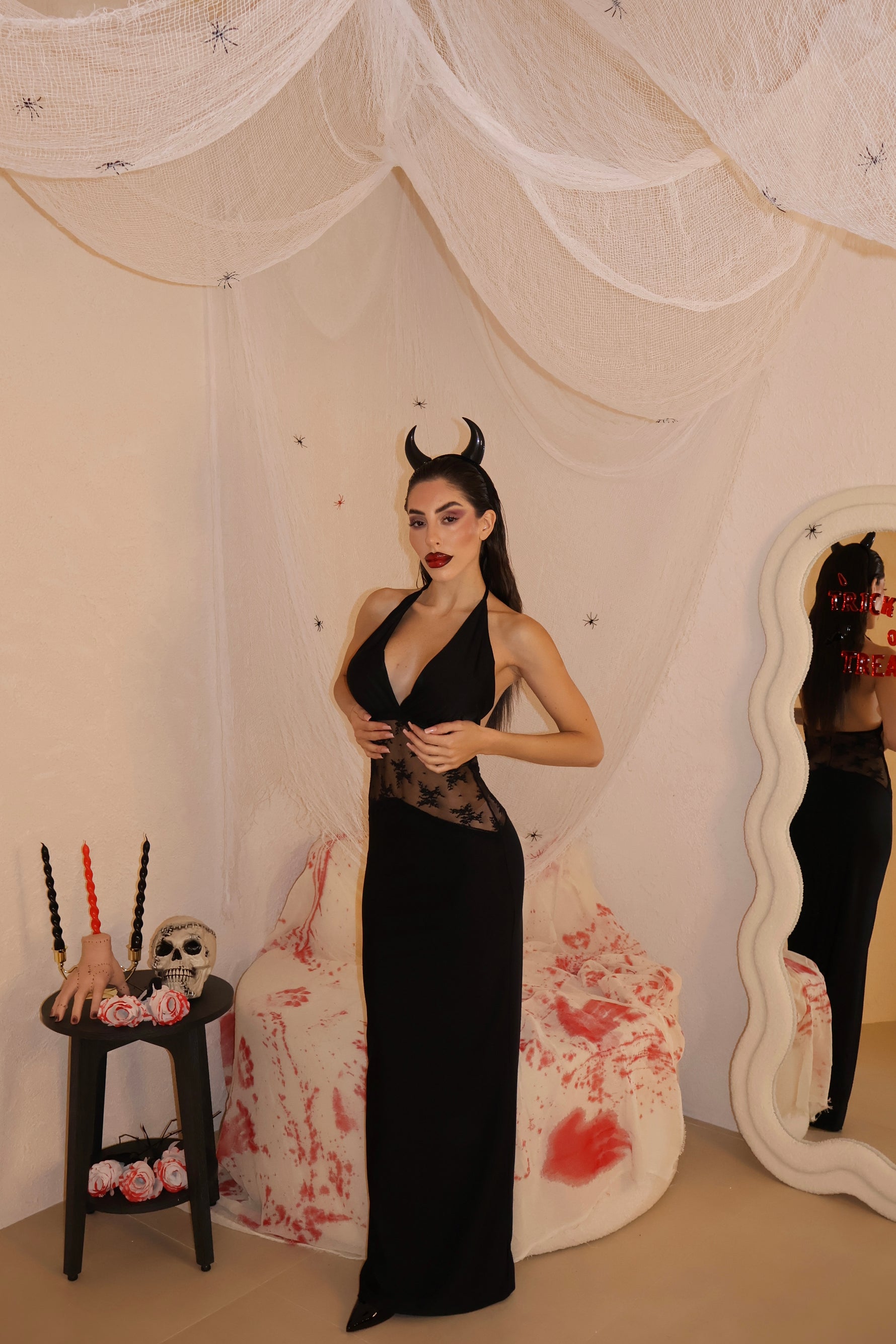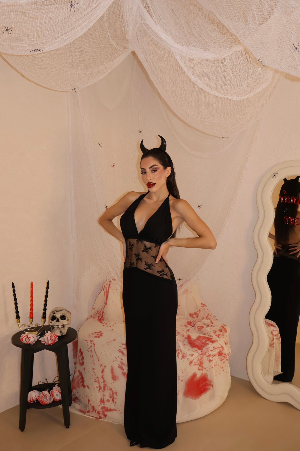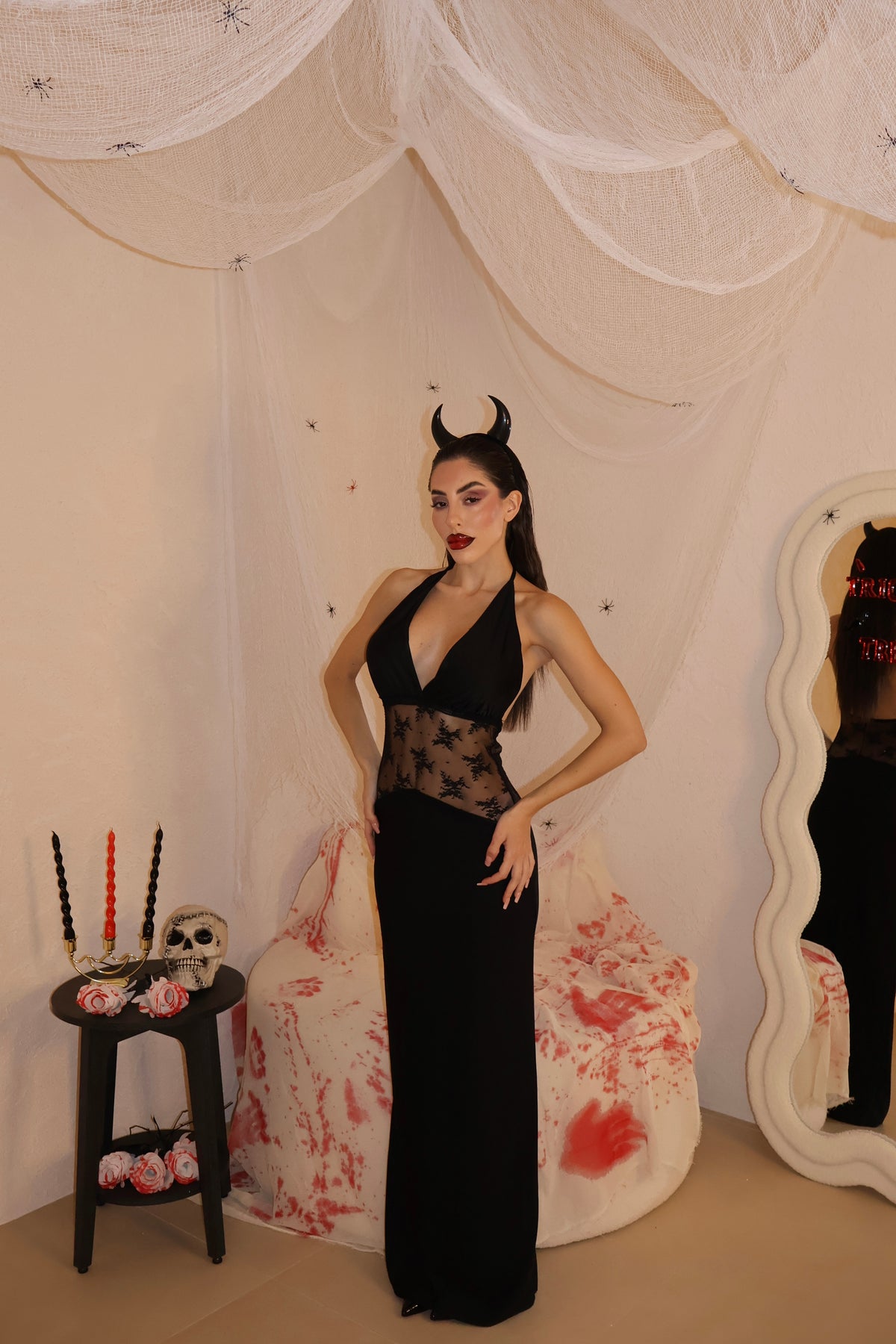 Abito lungo in lycra con fascia in pizzo. Coppe imbottite. Taglia unica.