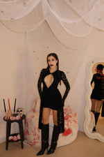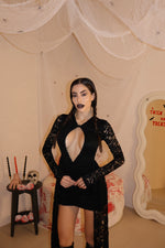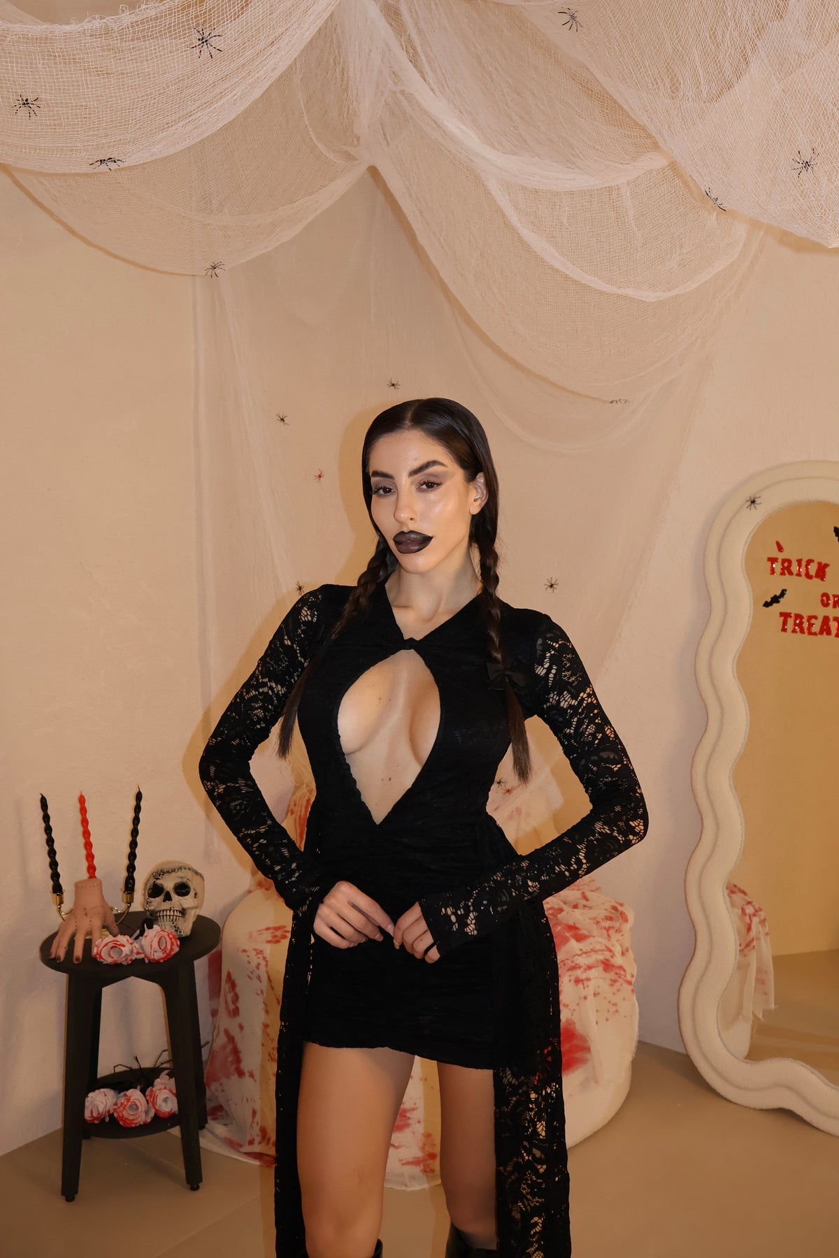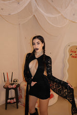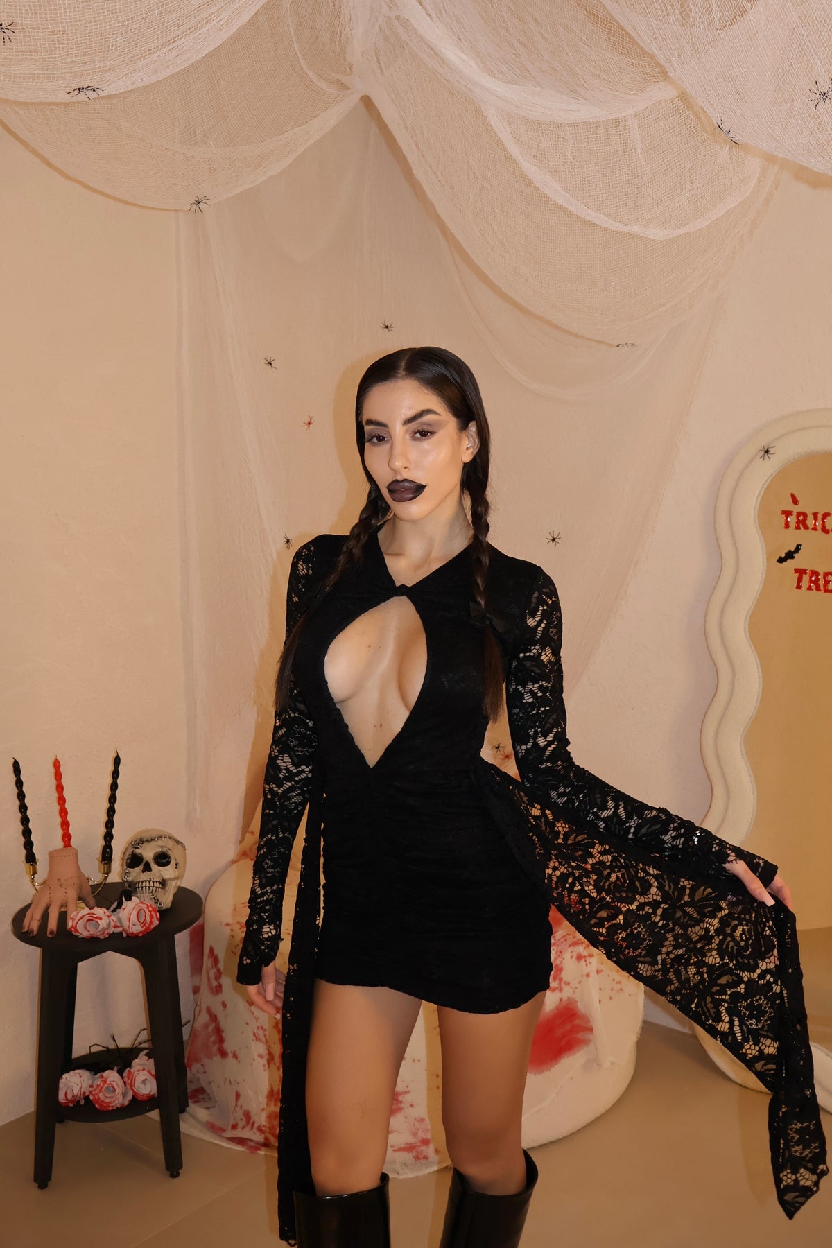 Abito corto in pizzo con apertura frontale e drappeggio. Maniche a guanto. Taglia unica.