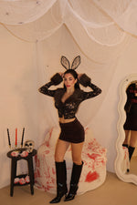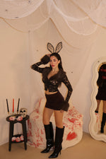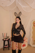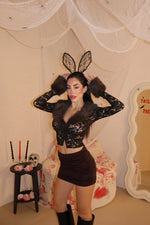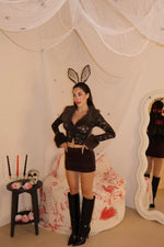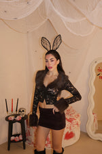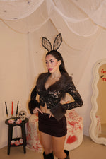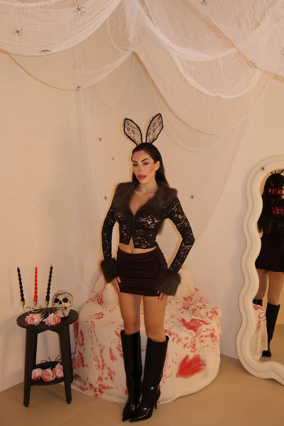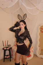 Coordinato composto da gonna in lycra e cardigan in pizzo con collo e polsi in pelliccia. Taglia Unica.