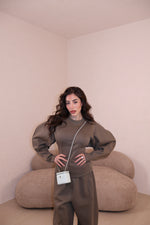 Felpa stretta in vita con maniche larghe e cerniera laterale. La modella indossa taglia S/M.