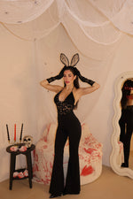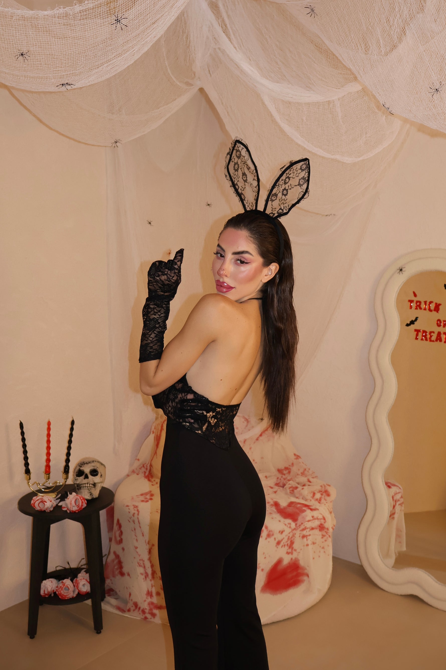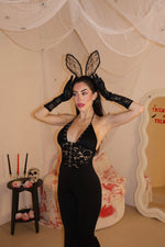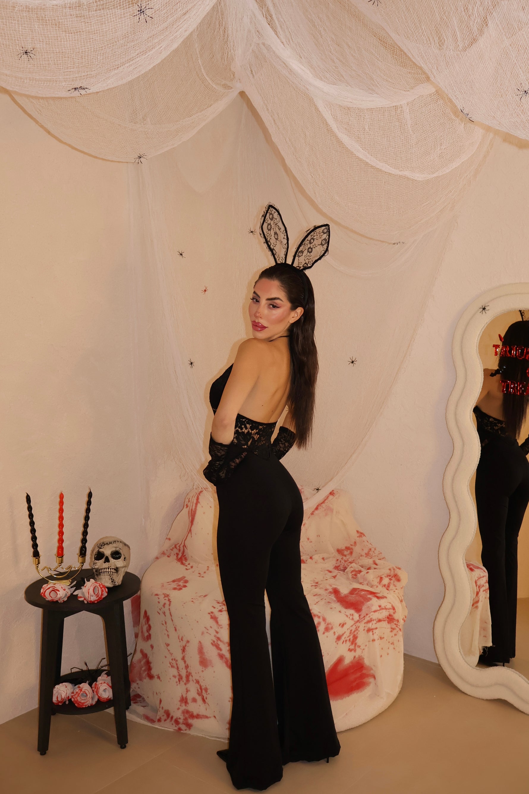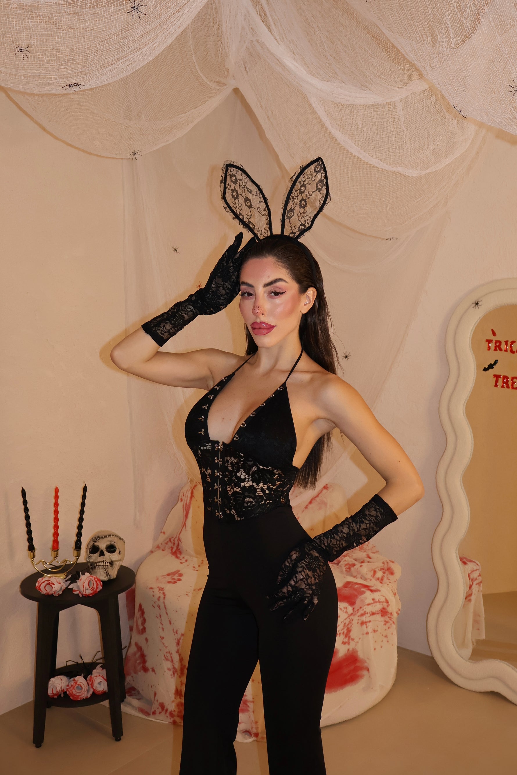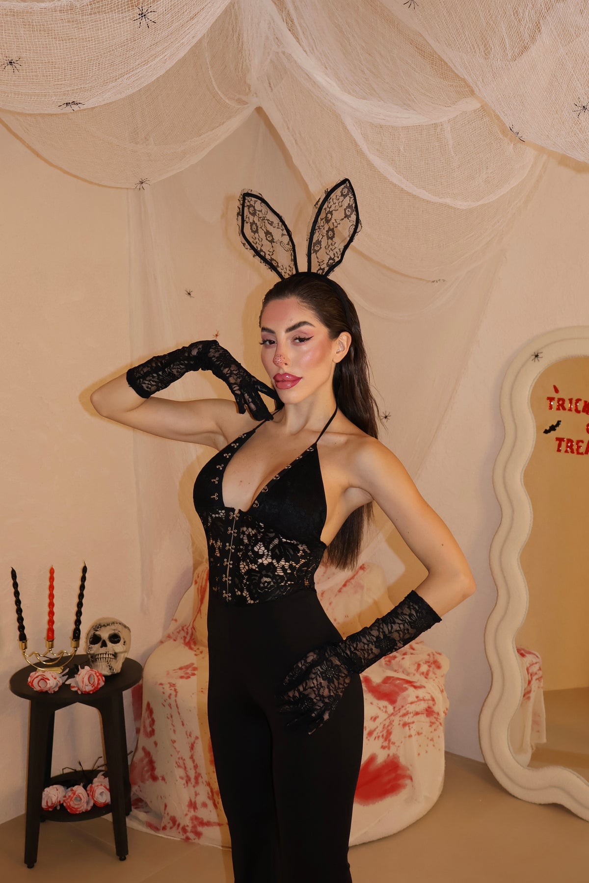 Jumpsuit in lycra con bustino in pizzo. Taglia Unica.