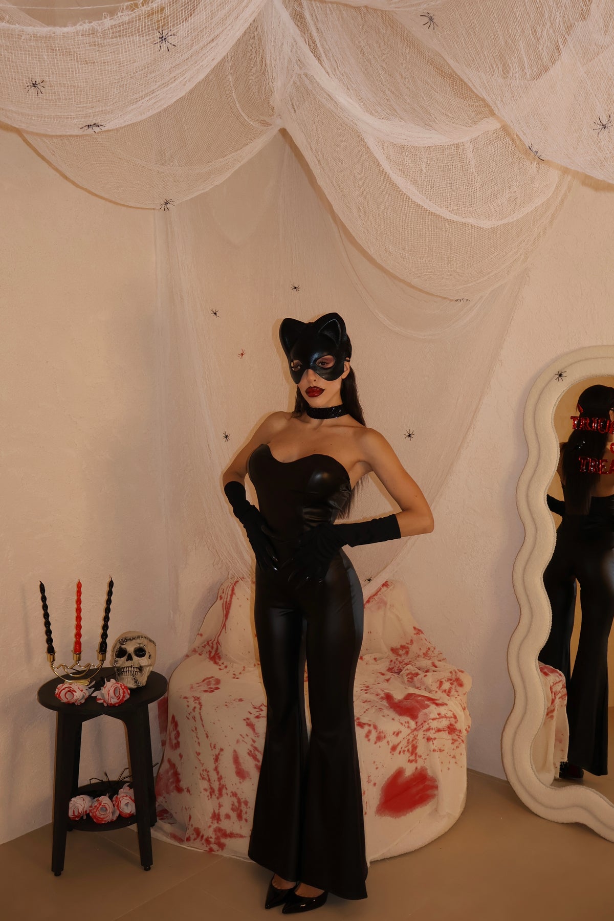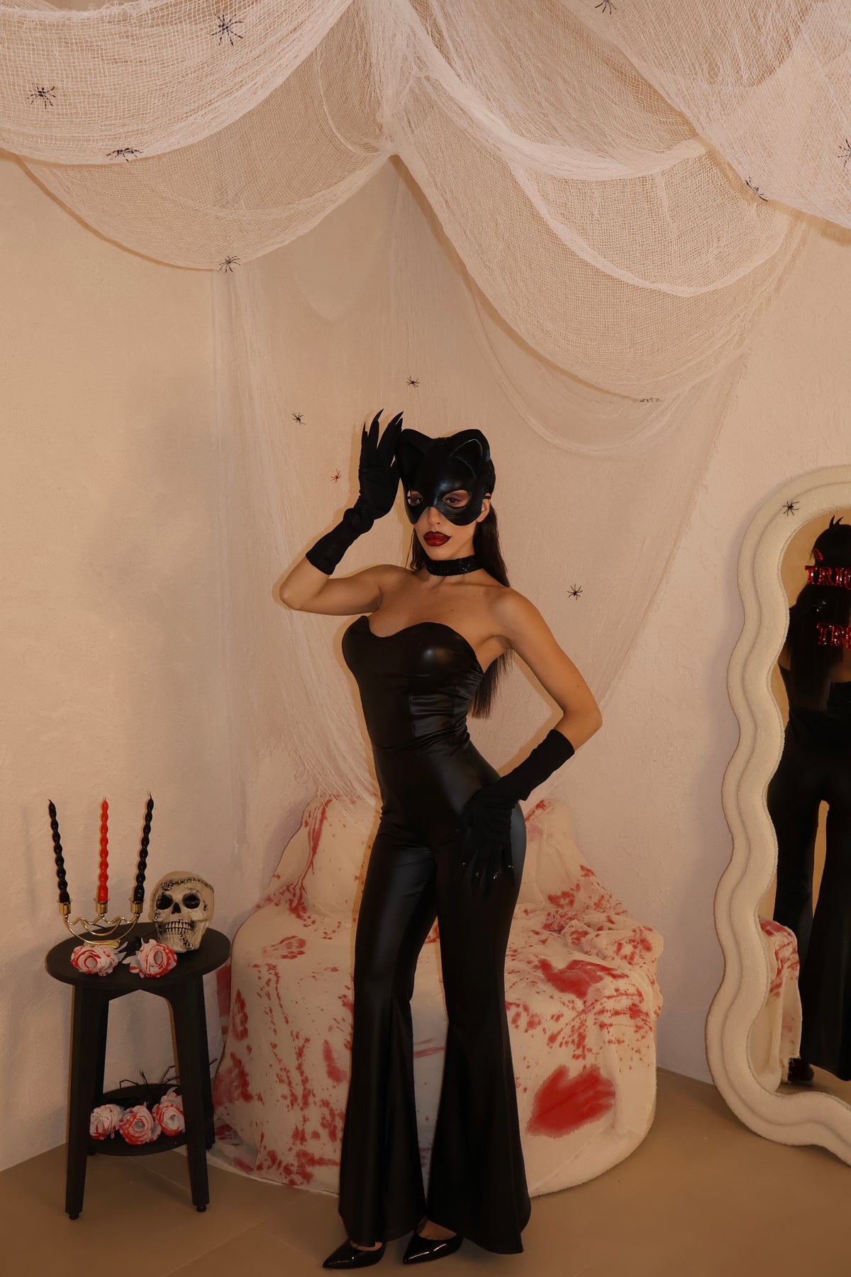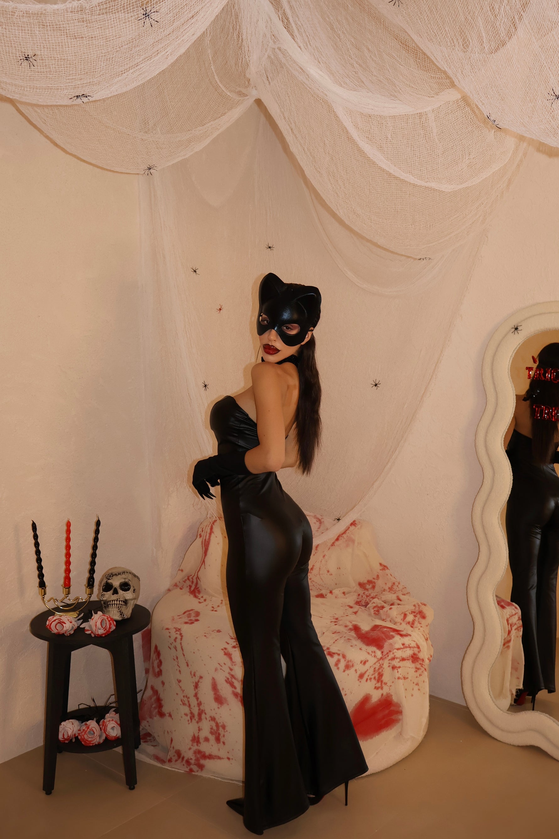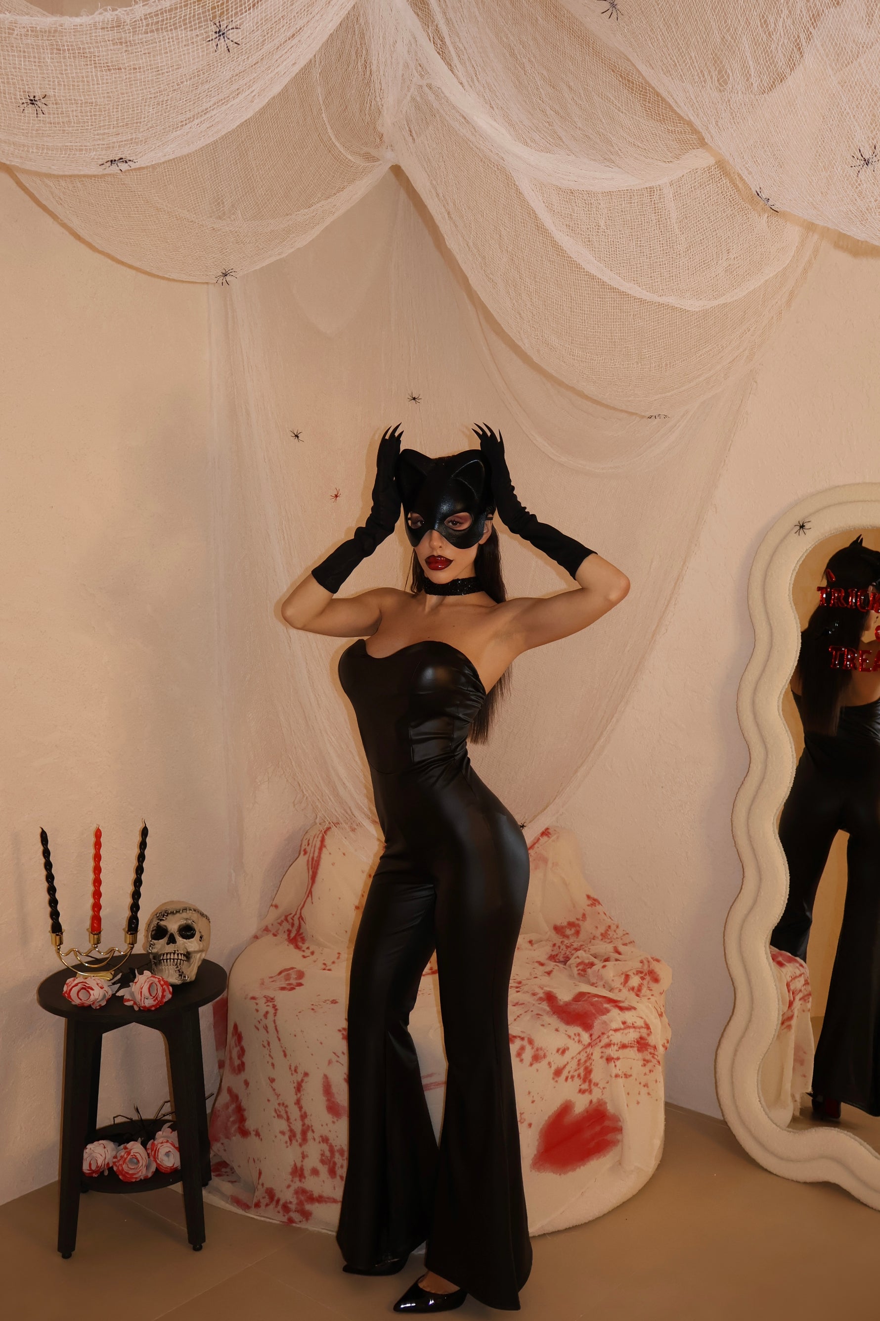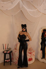 Jumpsuit a zampa in ecopelle con zip posteriore. Taglia Unica.