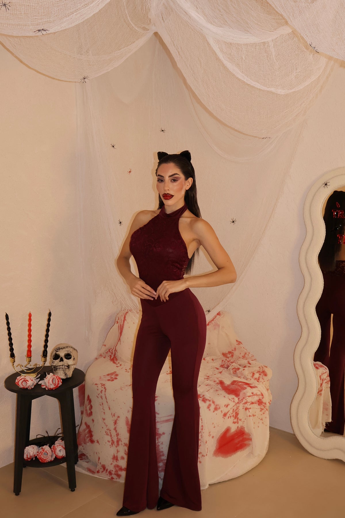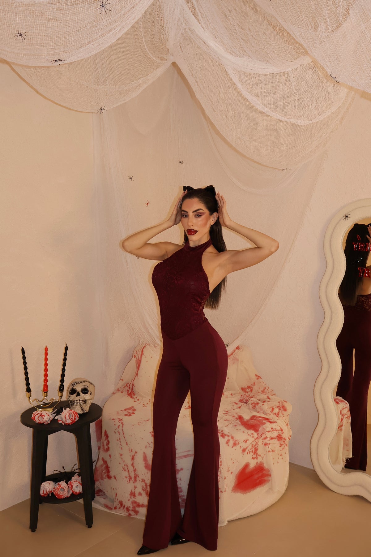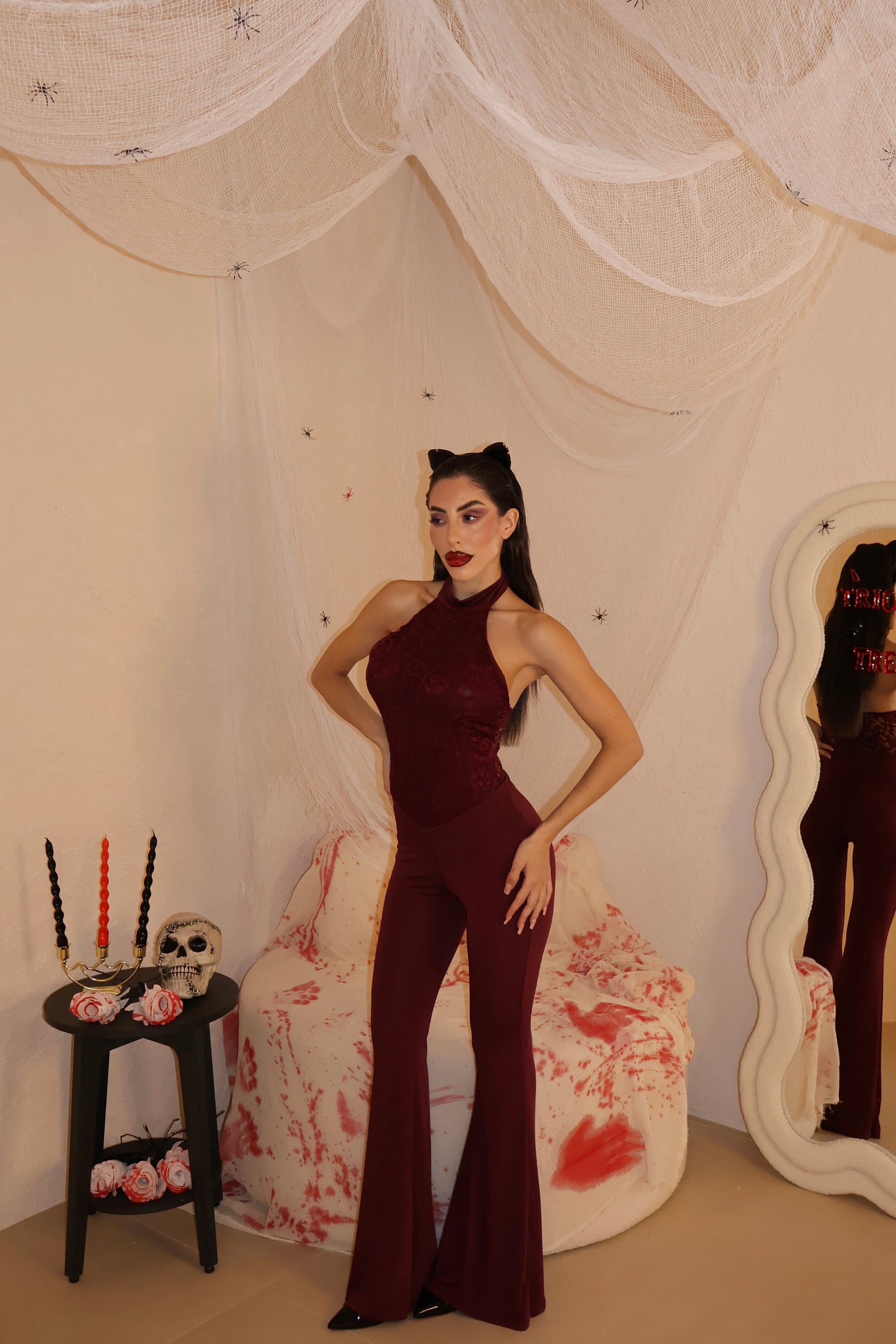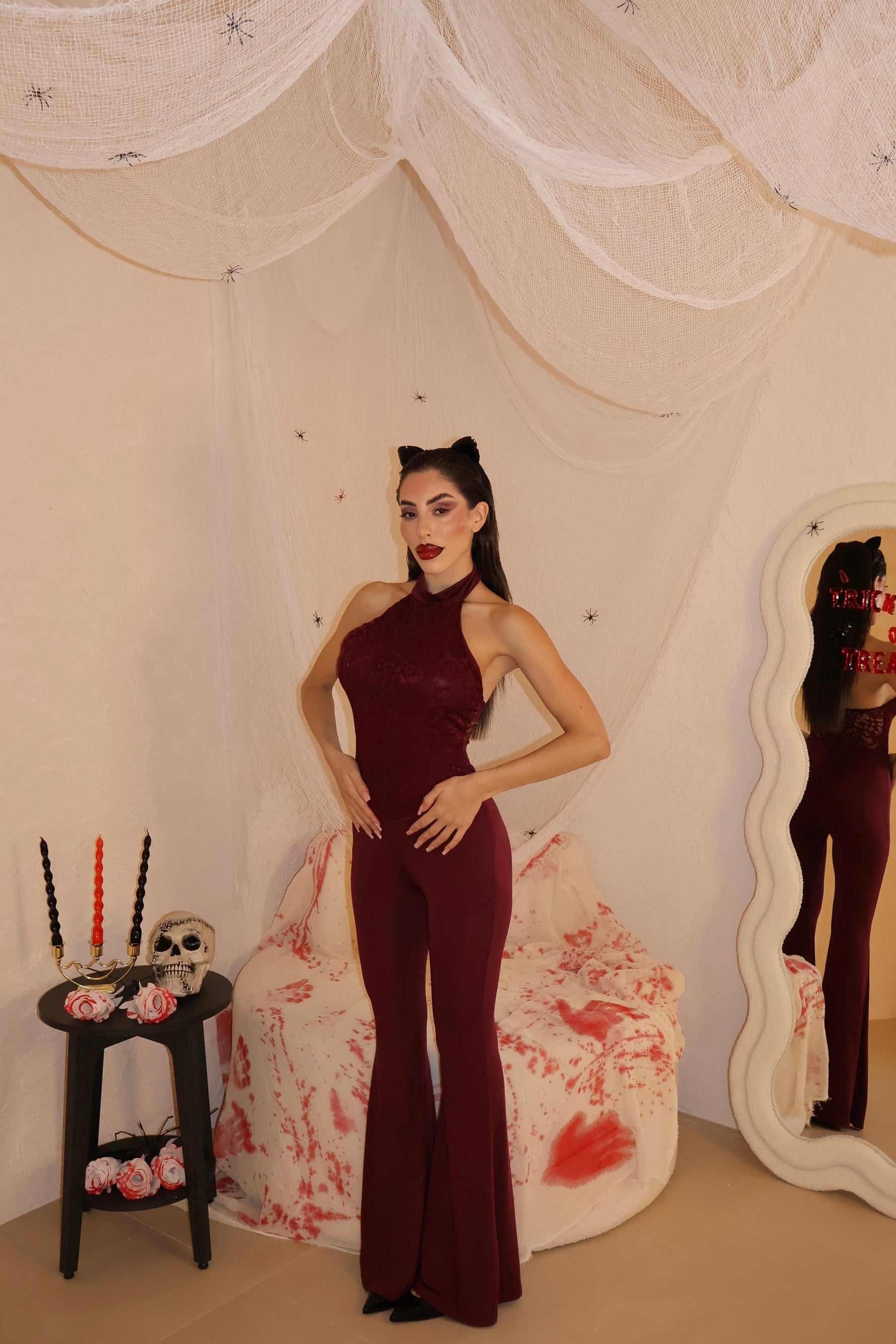 Jumpsuit a zampa in lycra e pizzo. Taglia Unica.