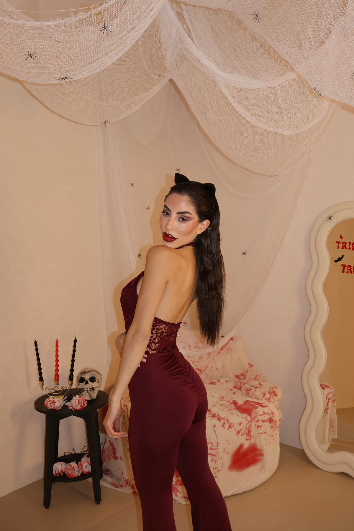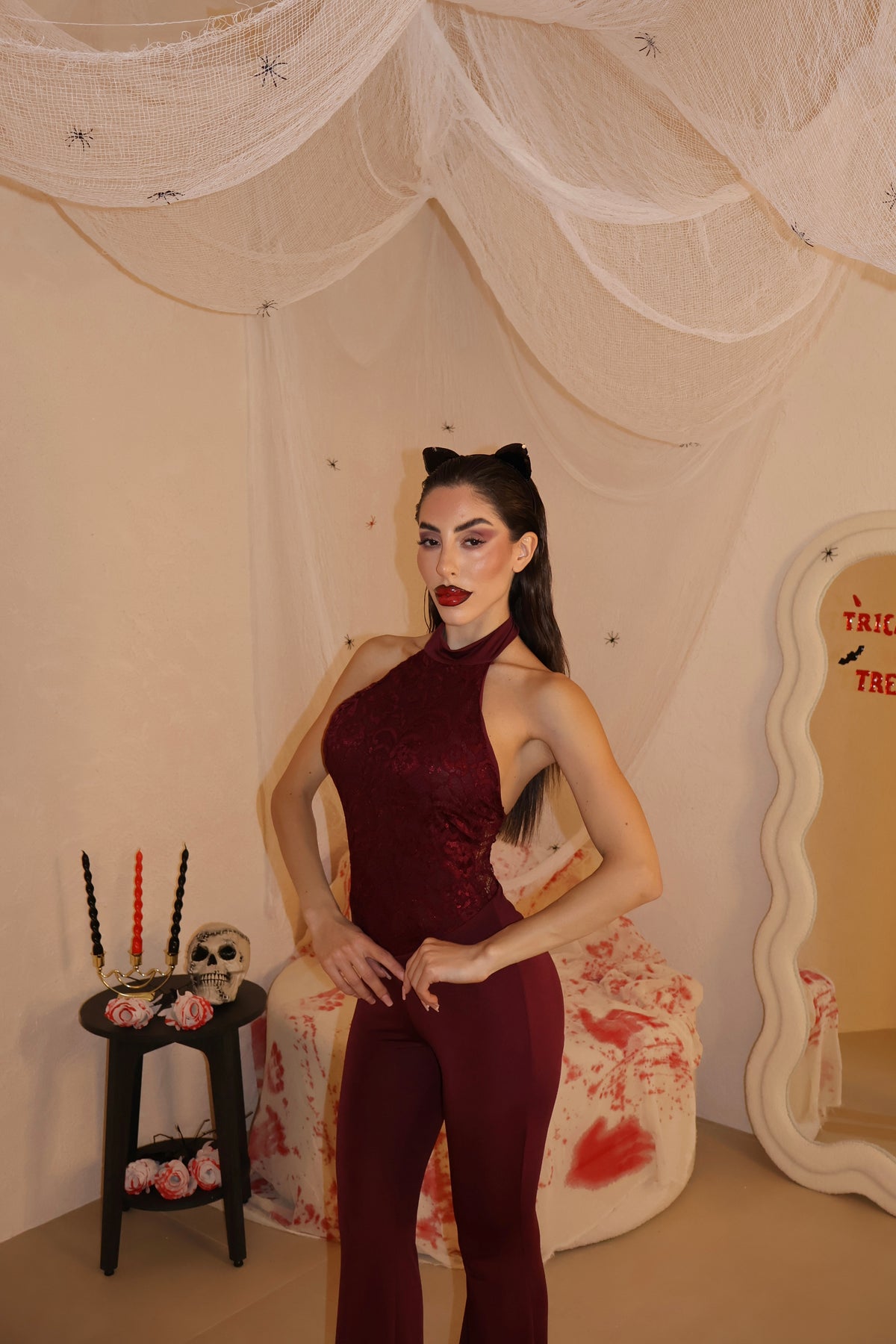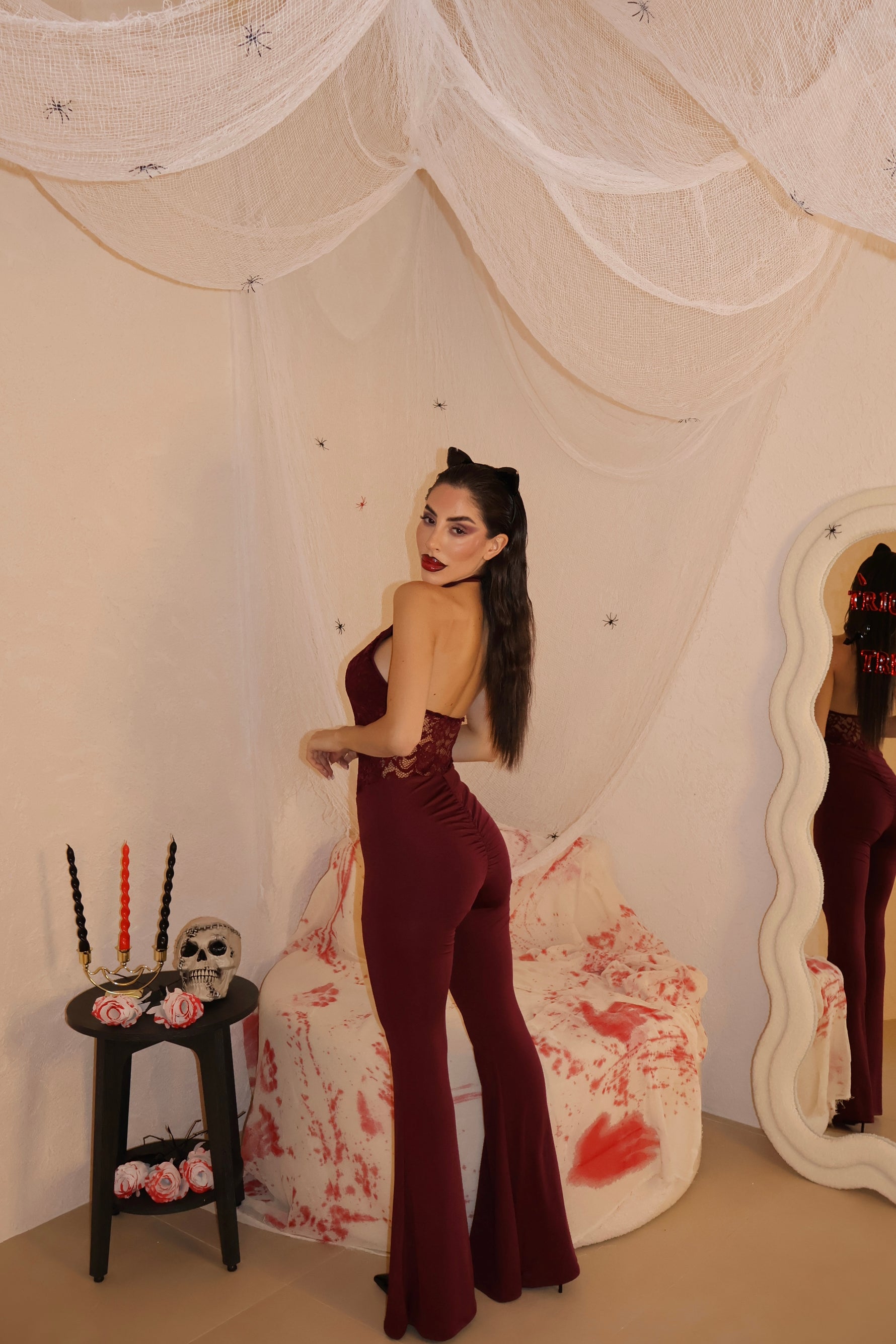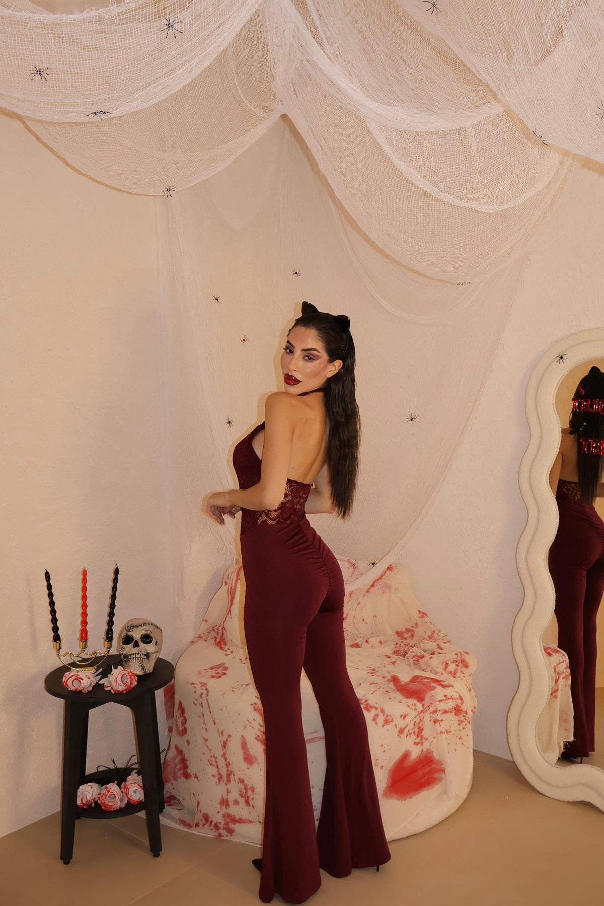 Jumpsuit a zampa in lycra e pizzo. Taglia Unica.