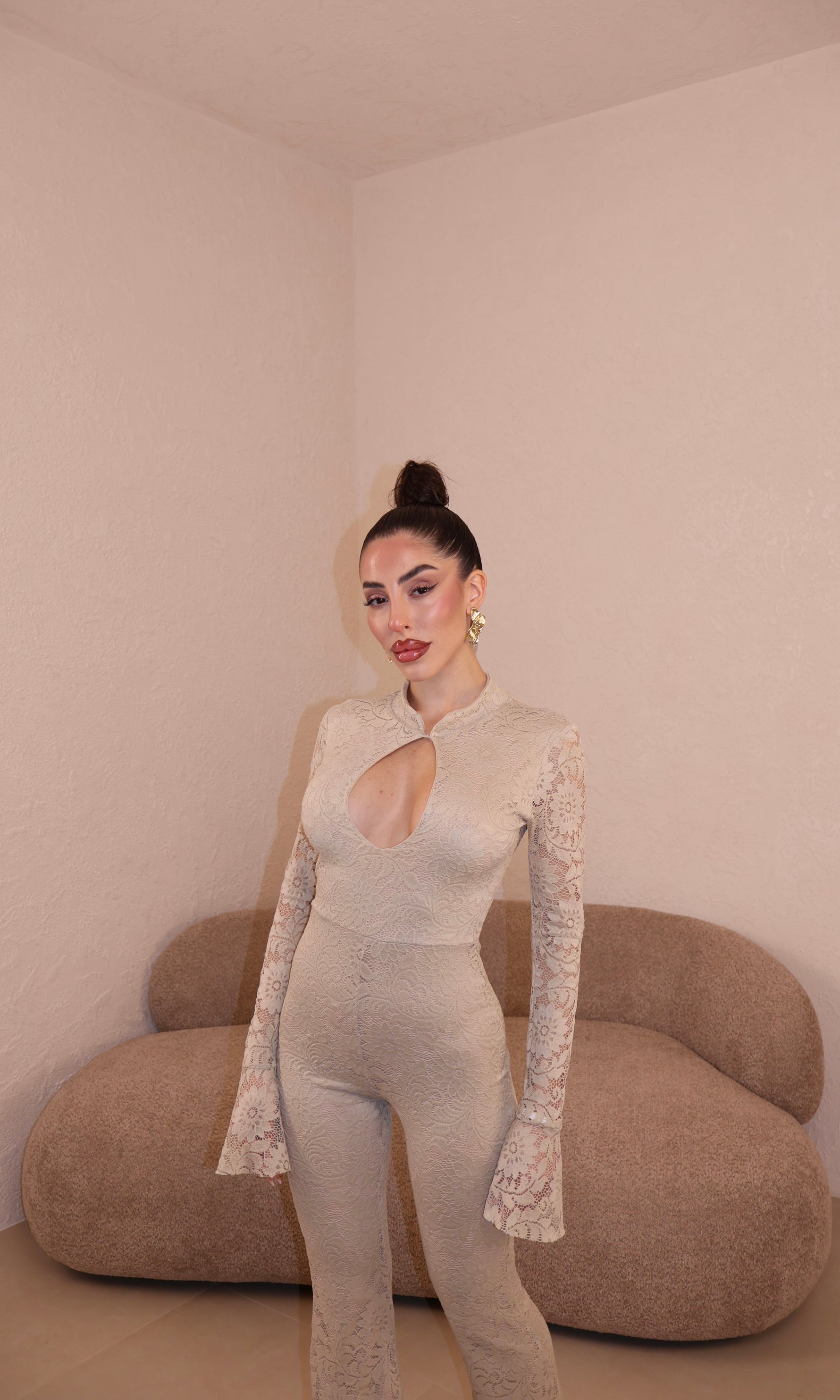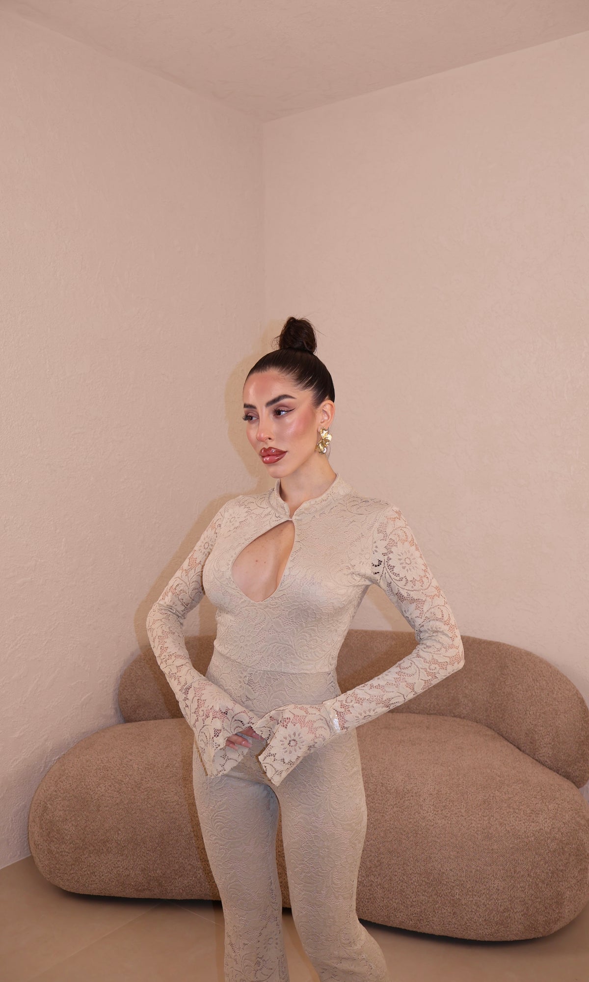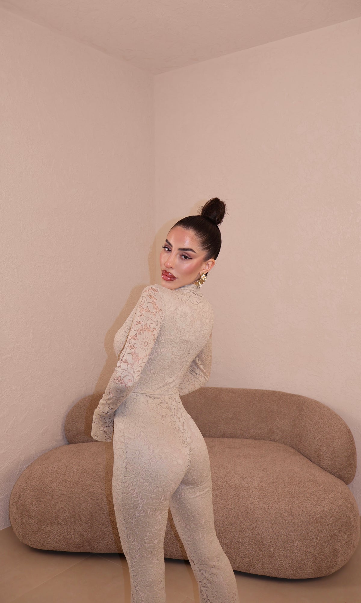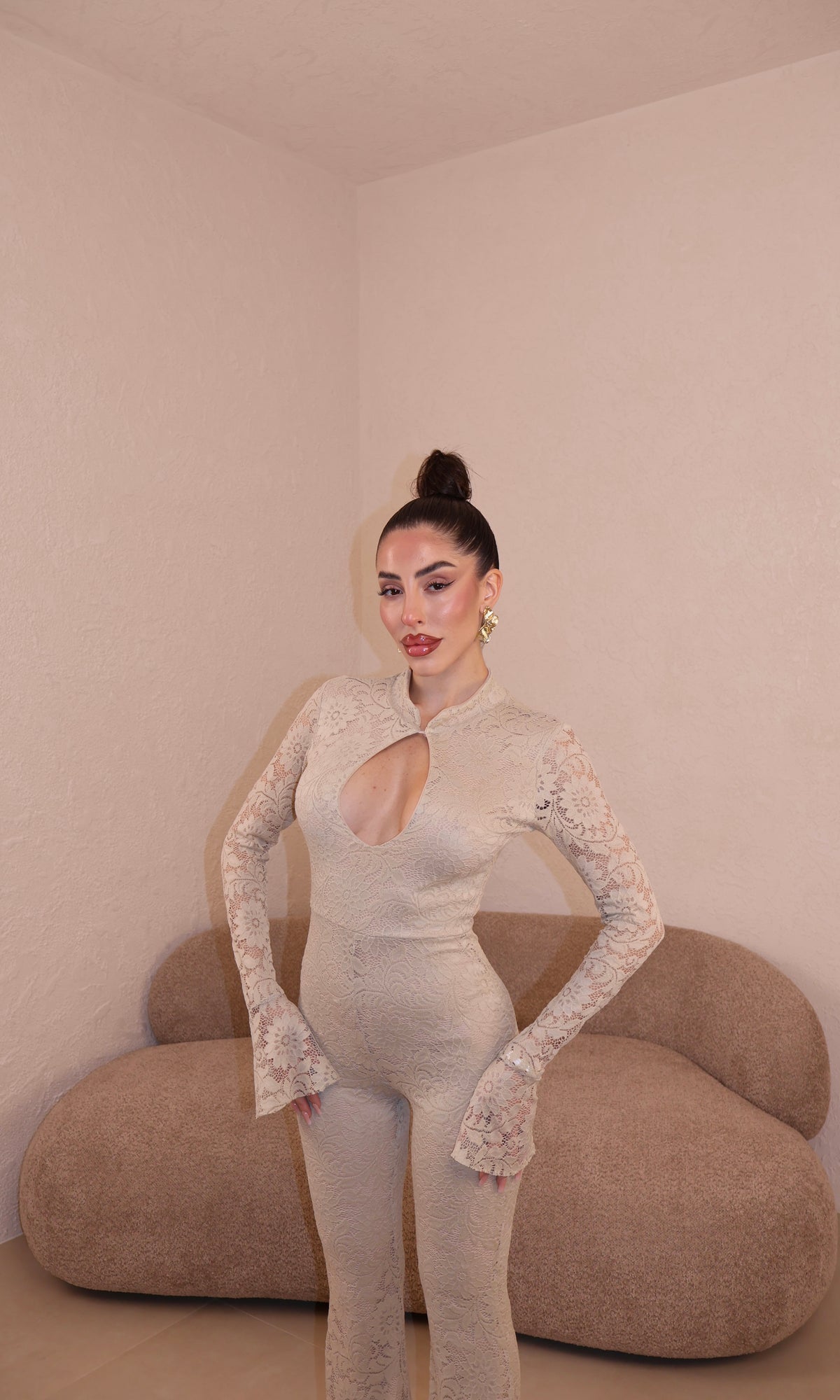 Jumpsuit in pizzo con apertura frontale. Taglia unica.