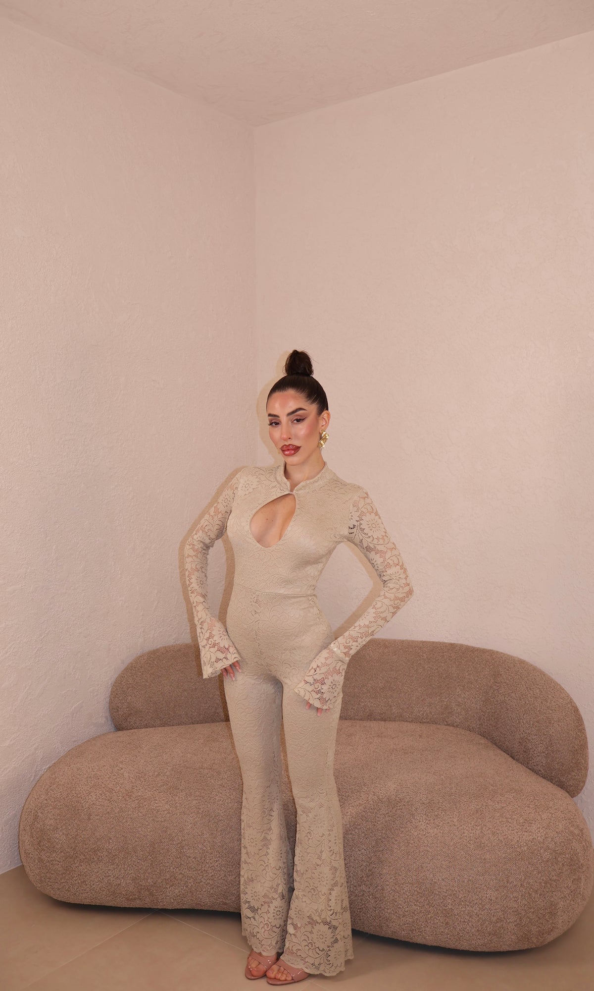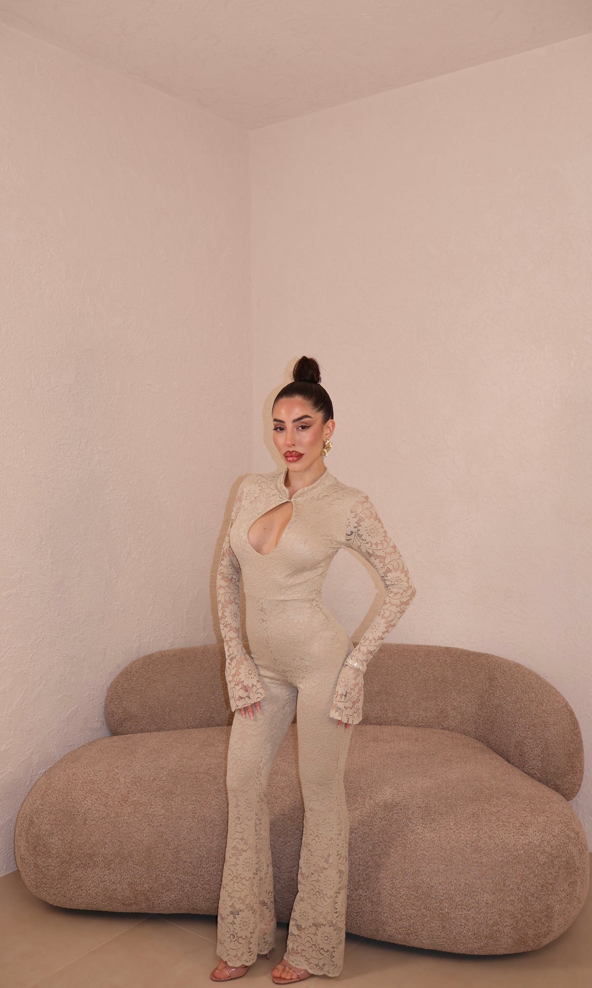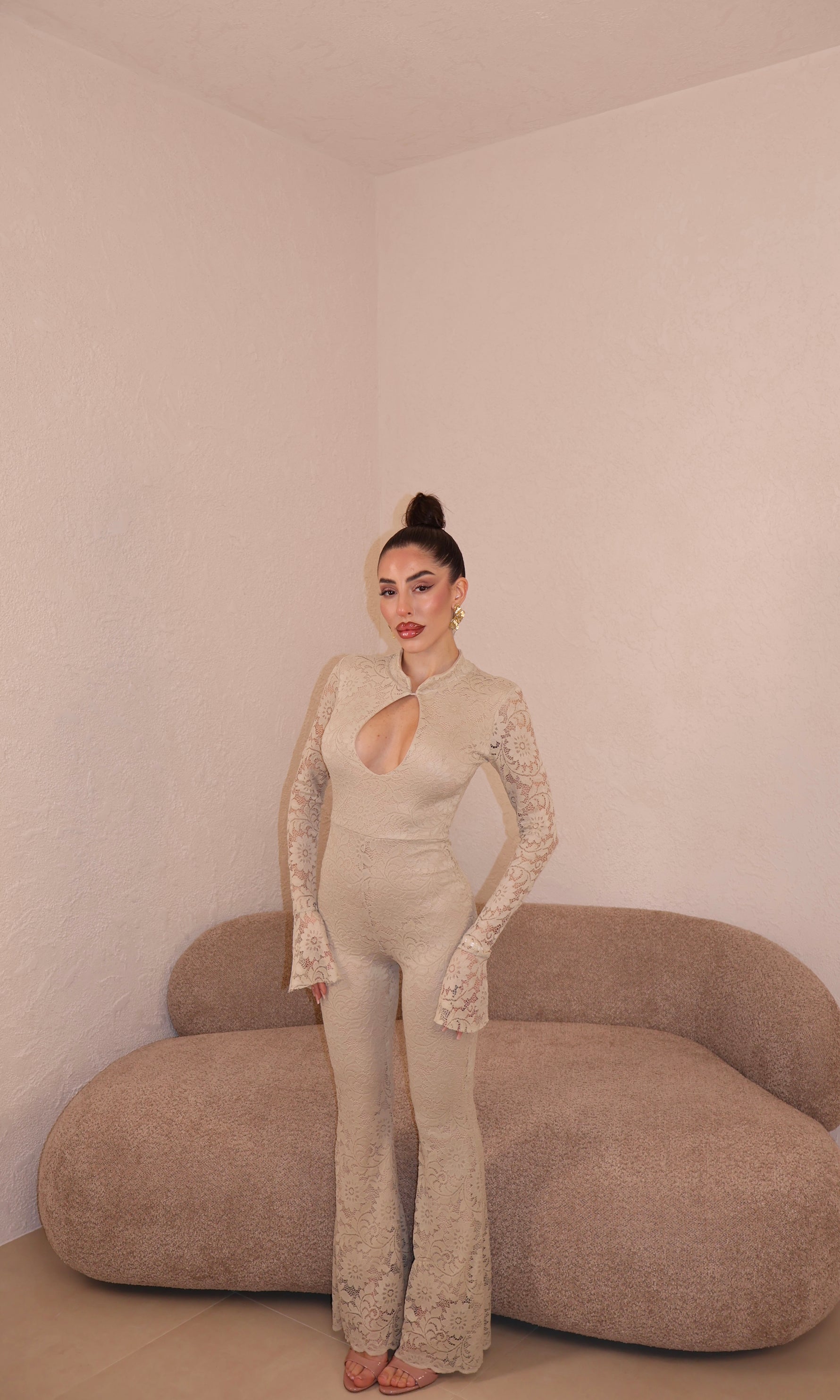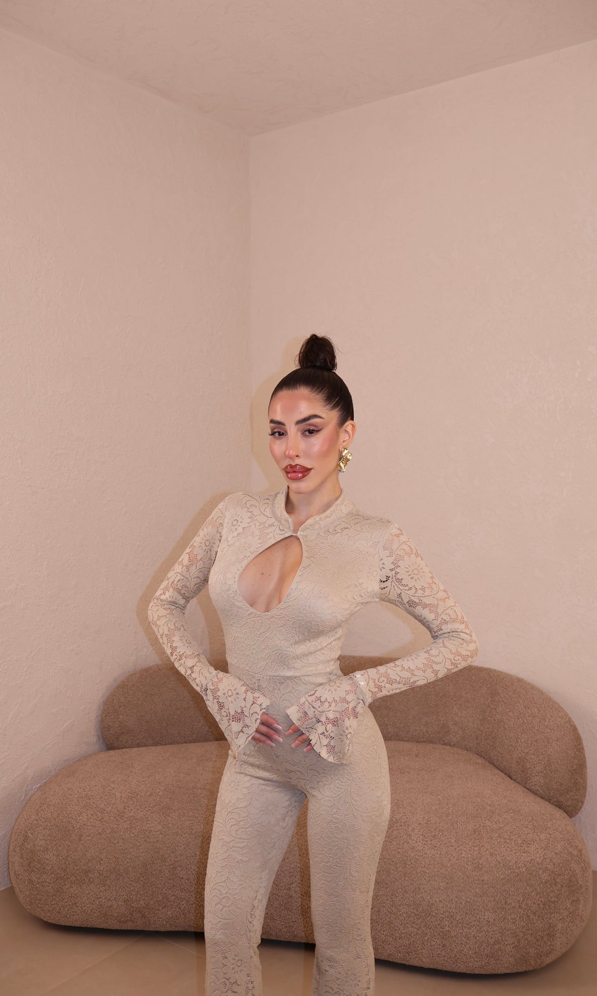 Jumpsuit in pizzo con apertura frontale. Taglia unica.