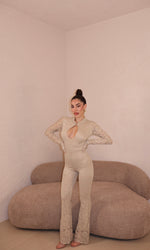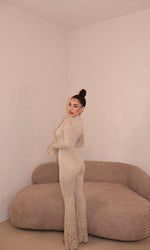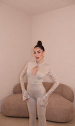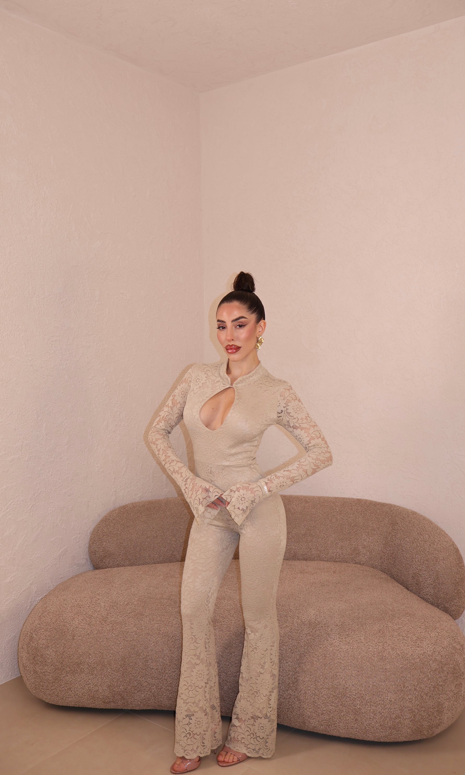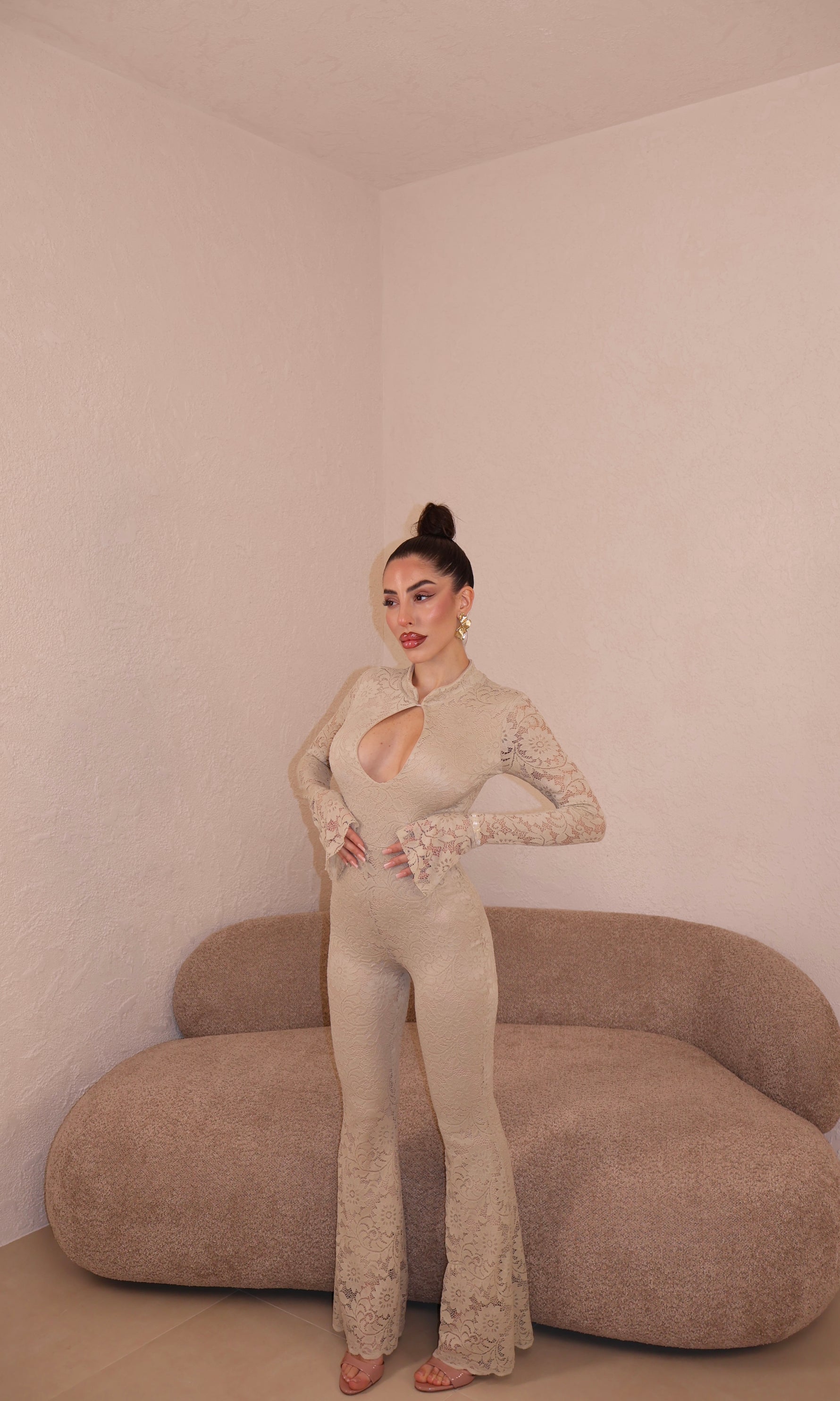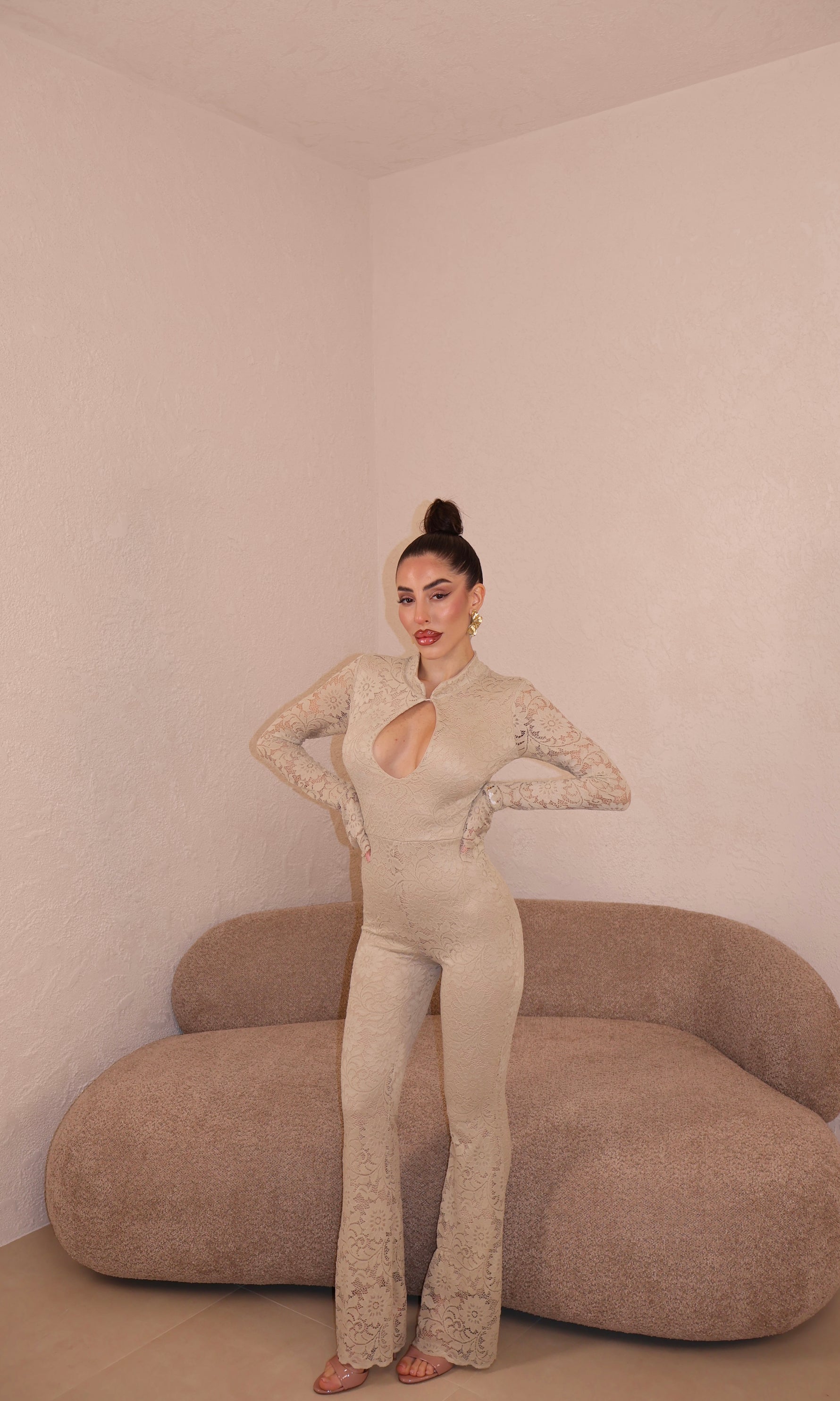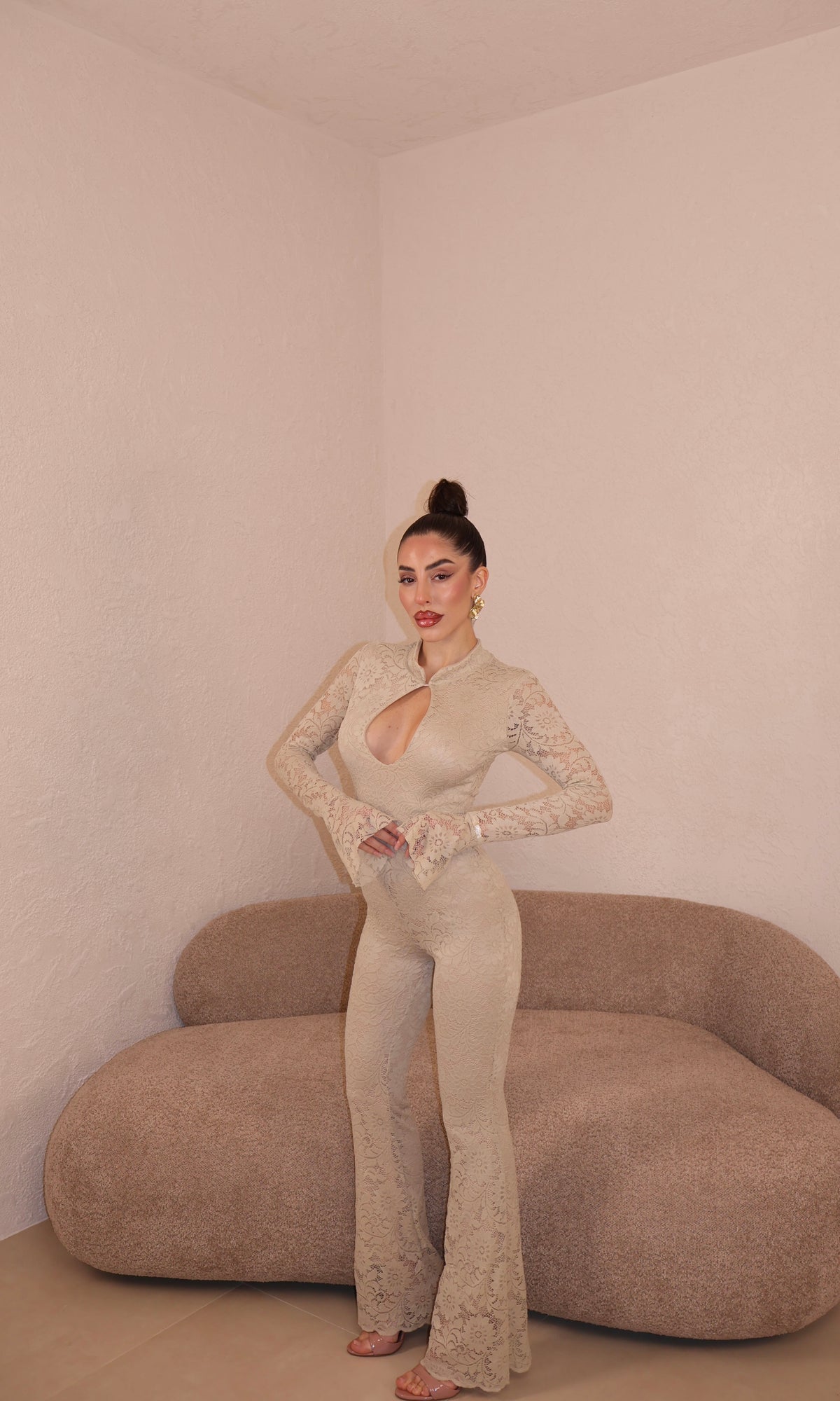 Jumpsuit in pizzo con apertura frontale. Taglia unica.