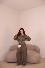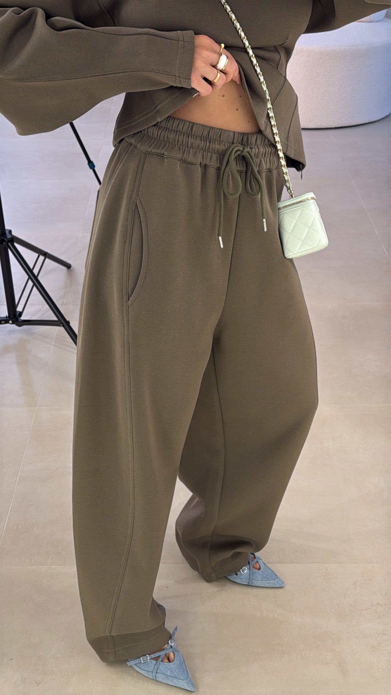 Pantatura modello balloon con elastico in vita e laccetti regolabili. La modella indossa taglia S/M.