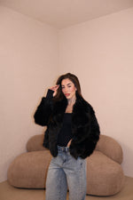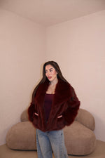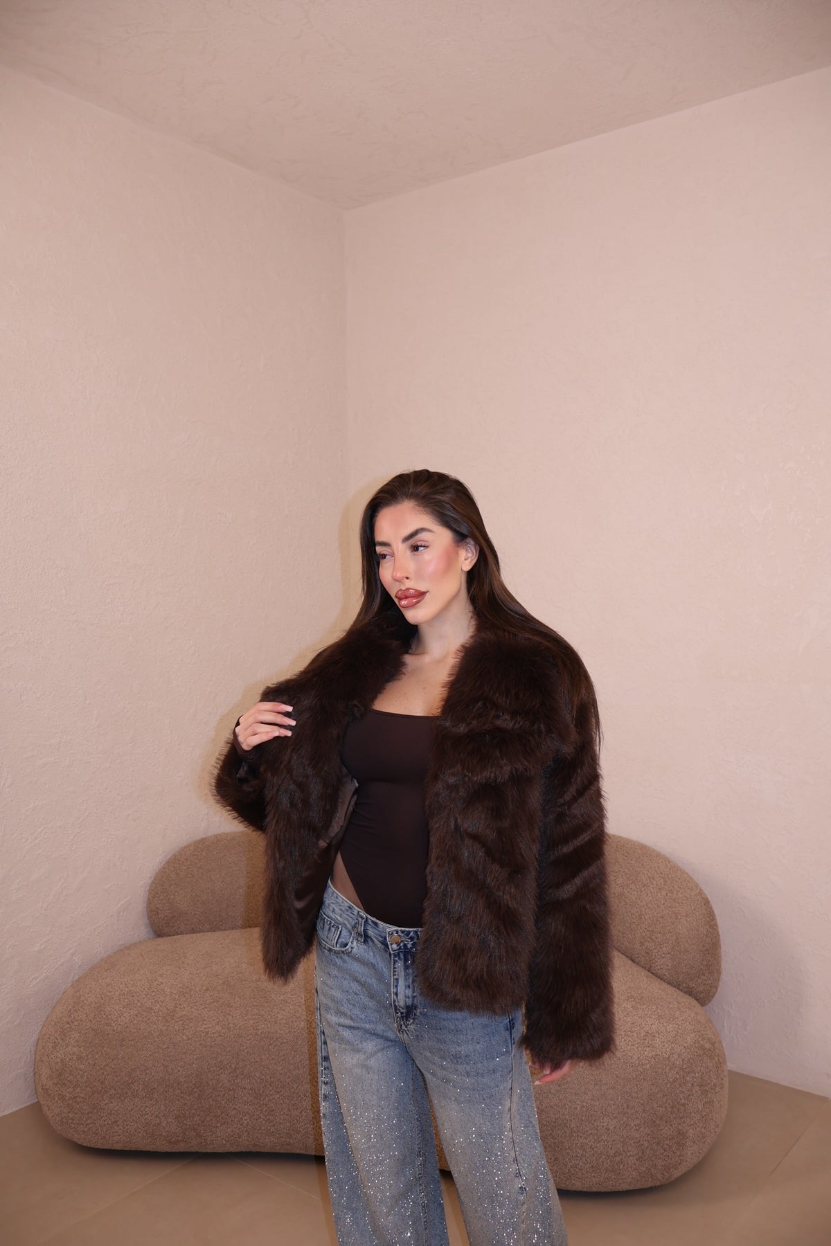 Pelliccia corta con collo a revers. Tasche laterali. Fodera interna a tono. Taglia unica.