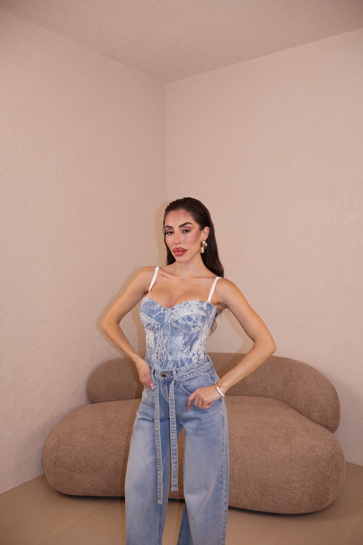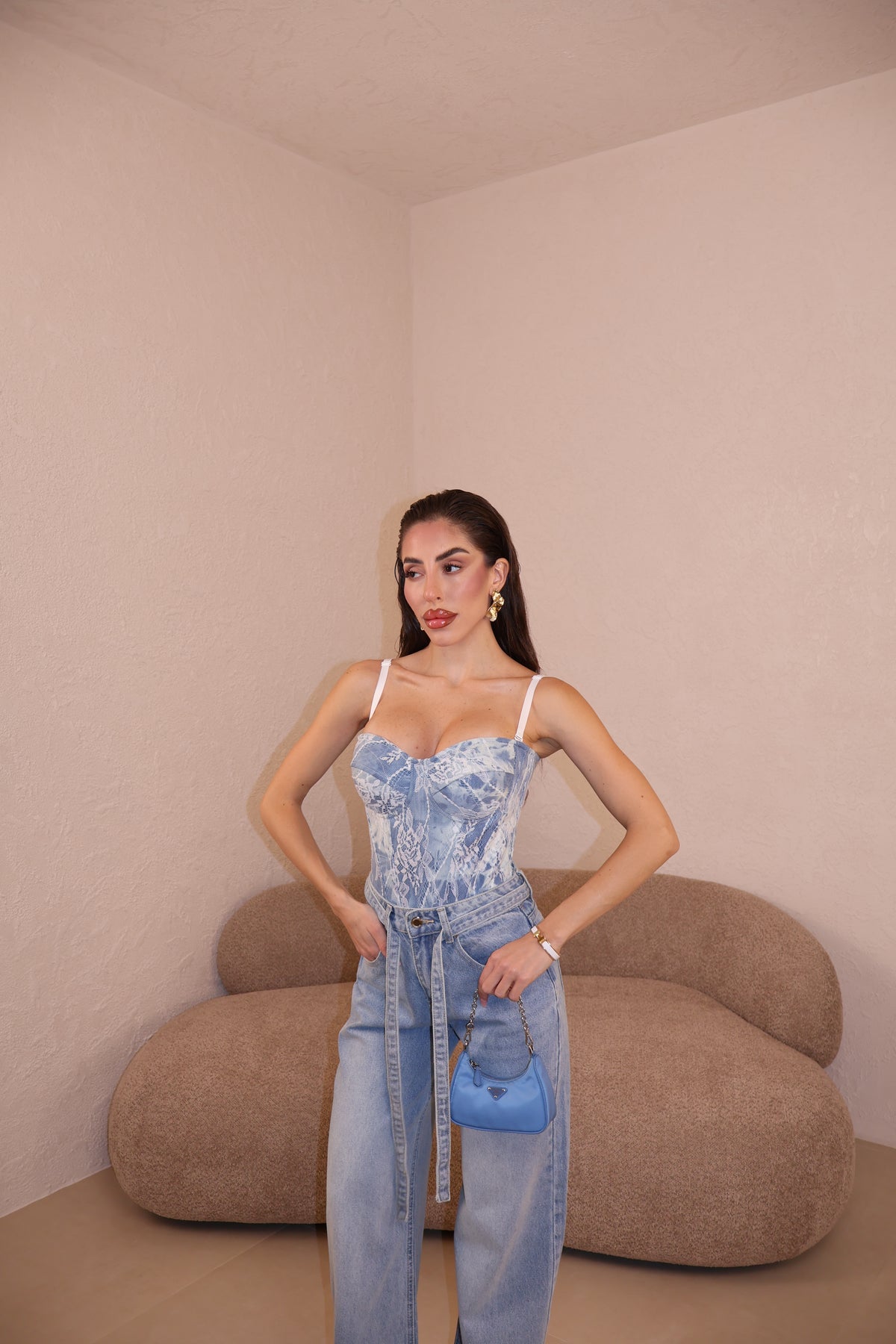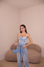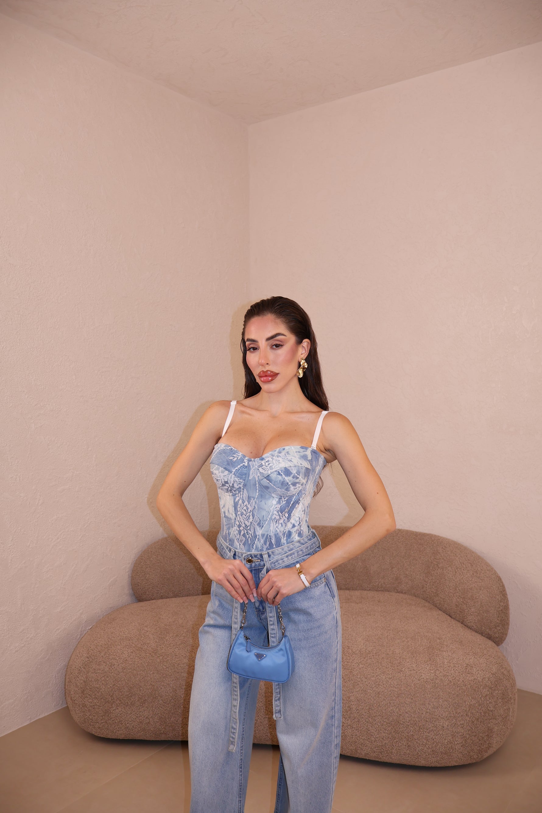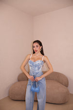 Corsetto in denim con dettagli in pizzo. Bretelle regolabili. Coppe prefromate e imbottite. Taglia unica.