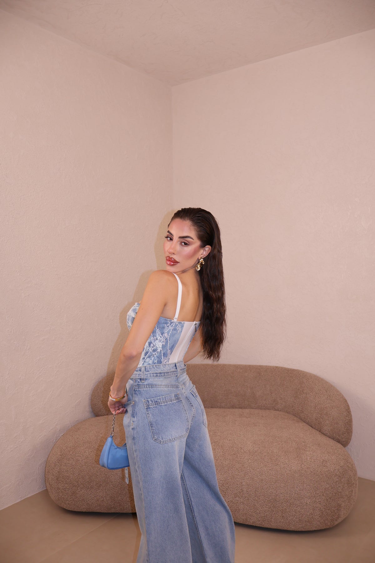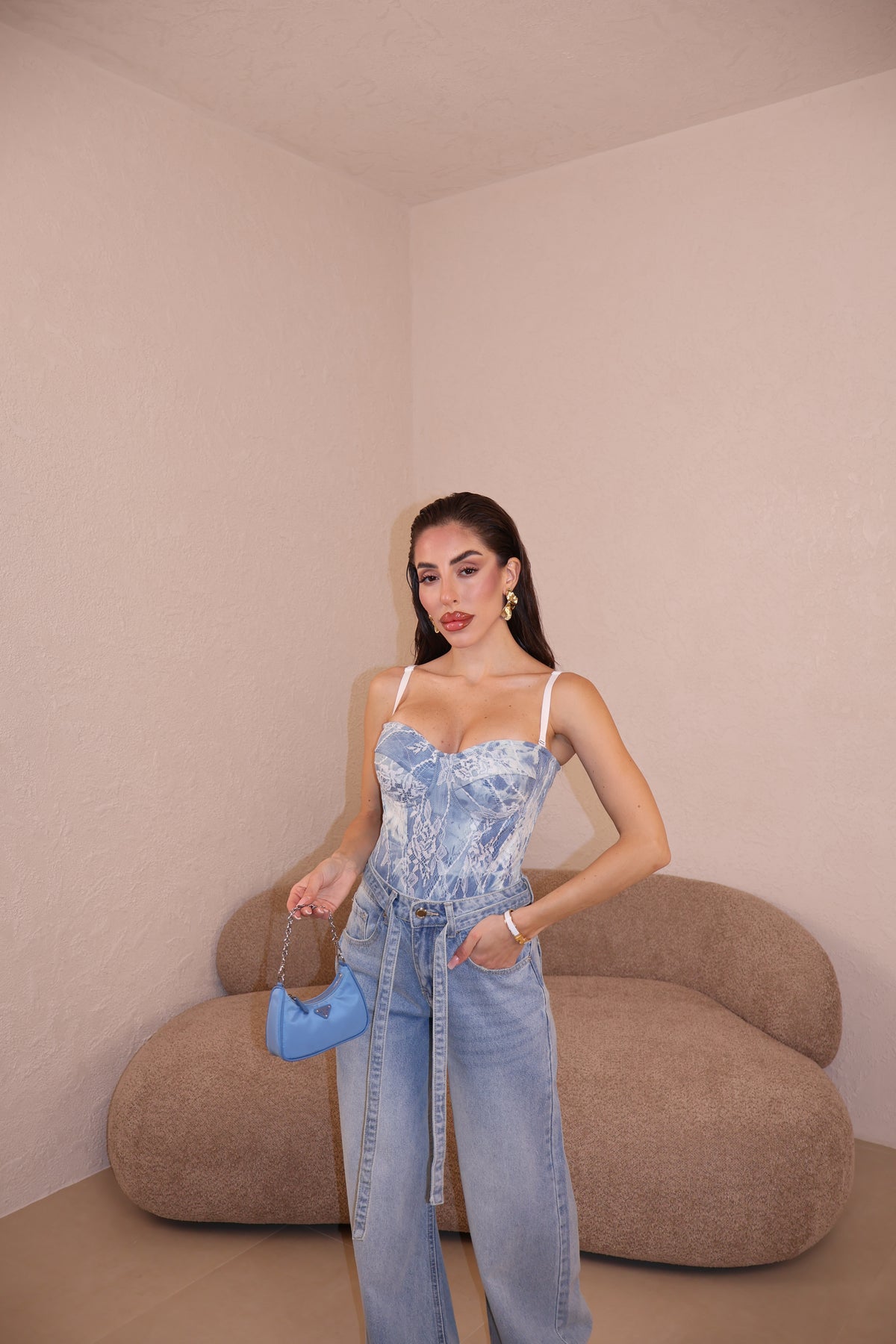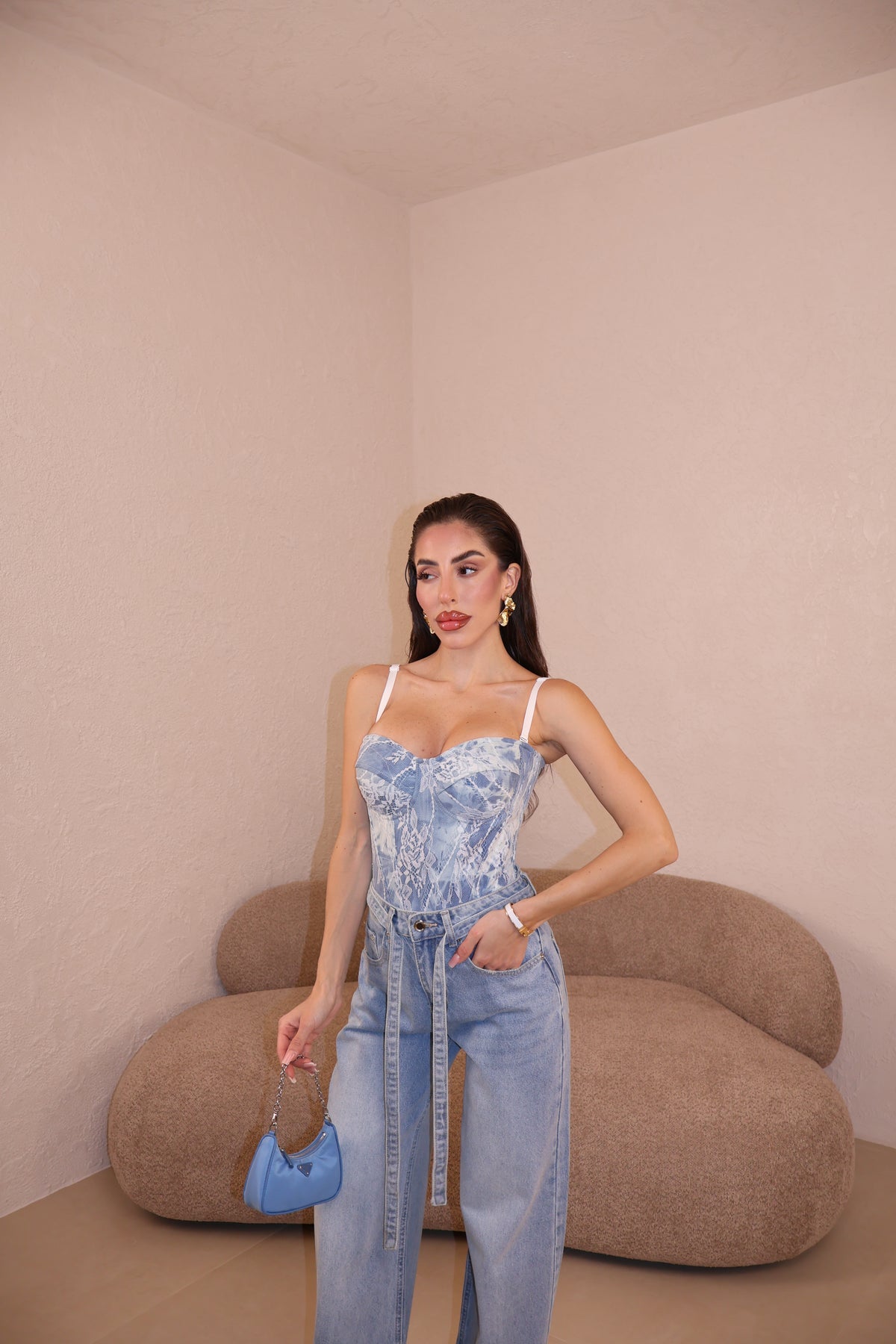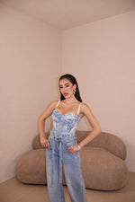 Corsetto in denim con dettagli in pizzo. Bretelle regolabili. Coppe prefromate e imbottite. Taglia unica.