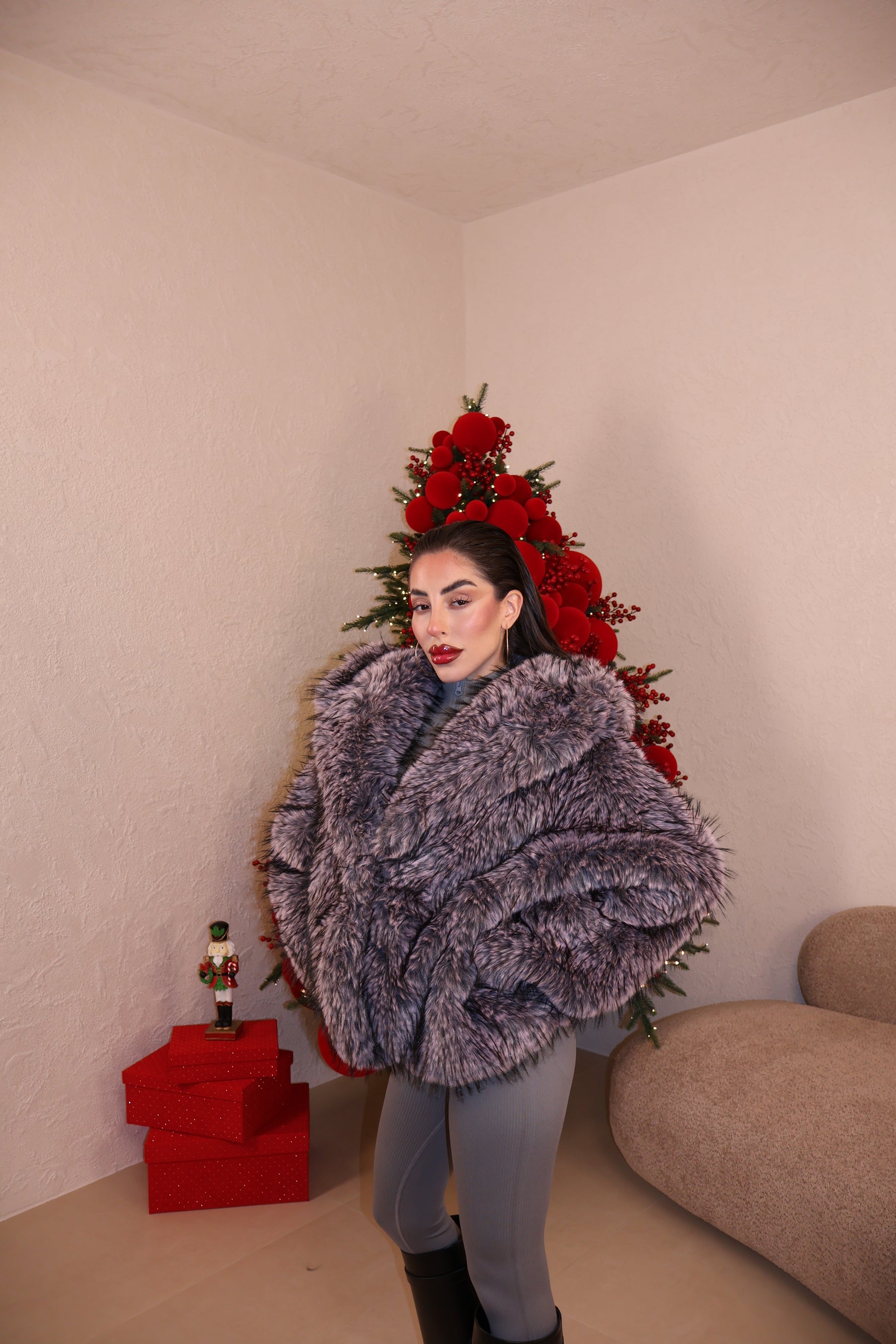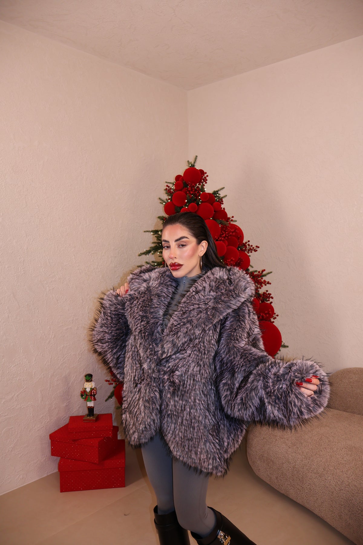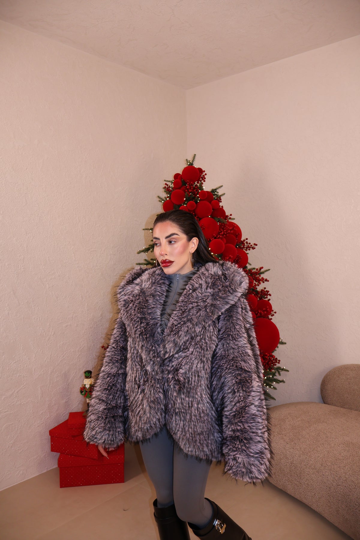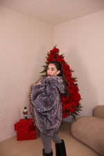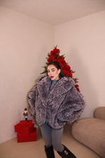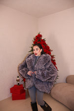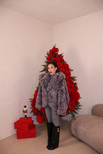 Pelliccia over con collo a revers,cappuccio e tasche. Sfumature interne a constrasto. Taglia unica.