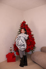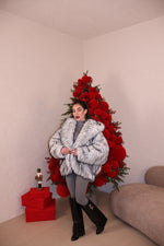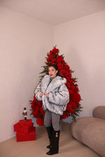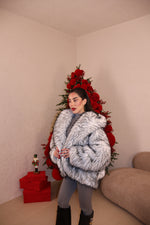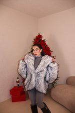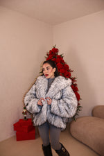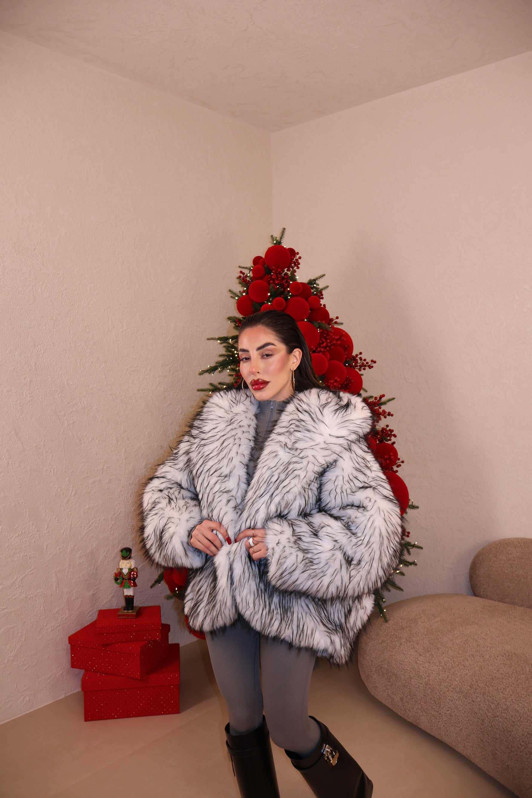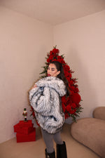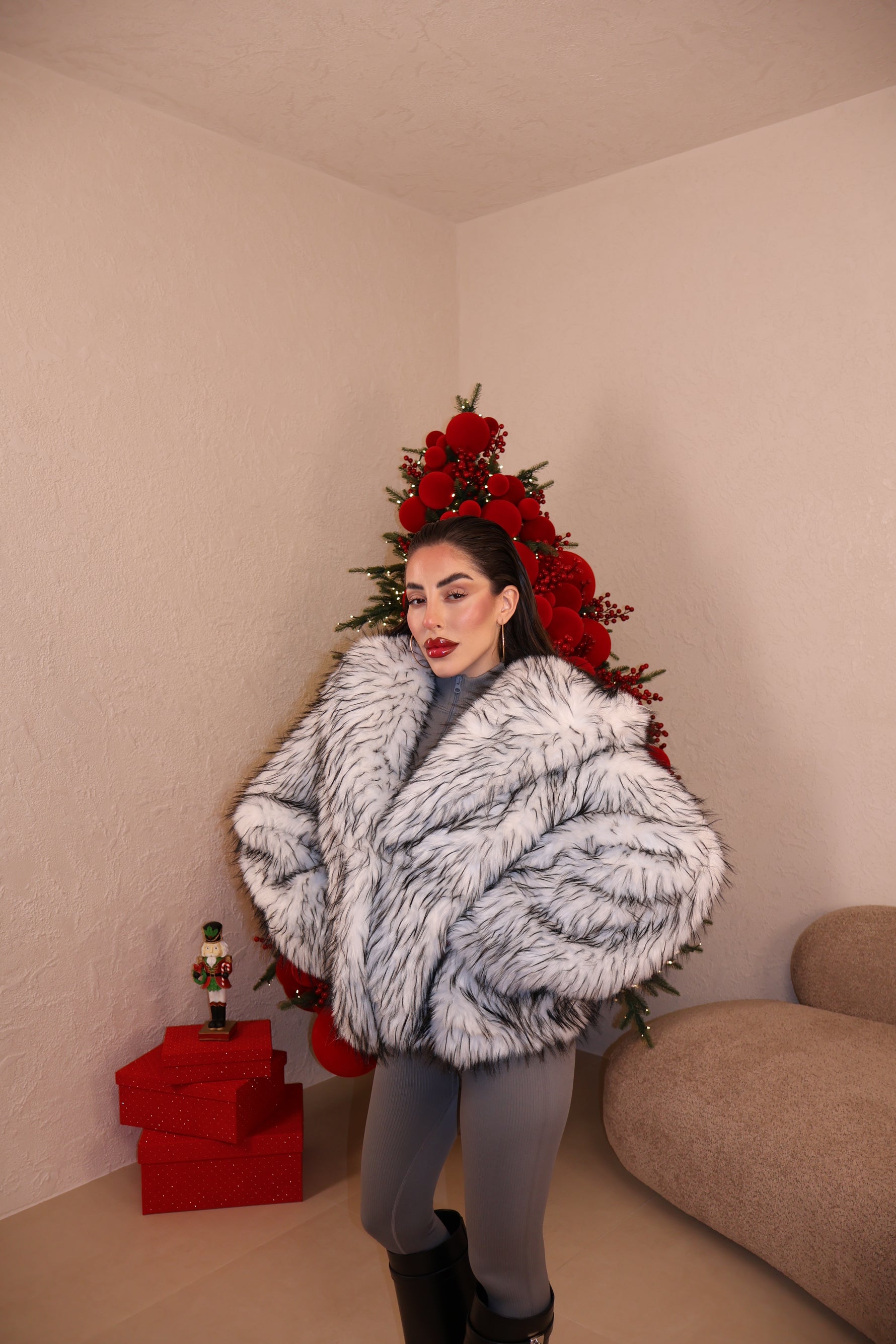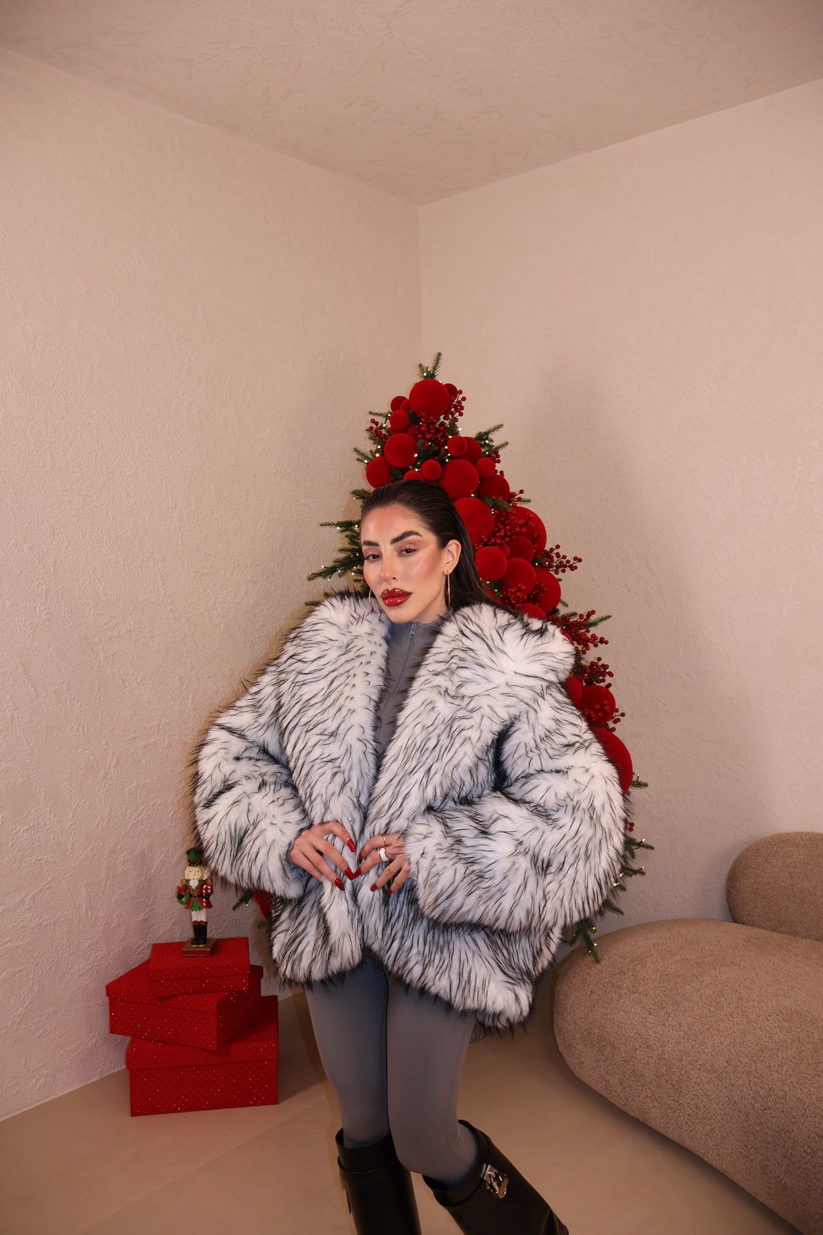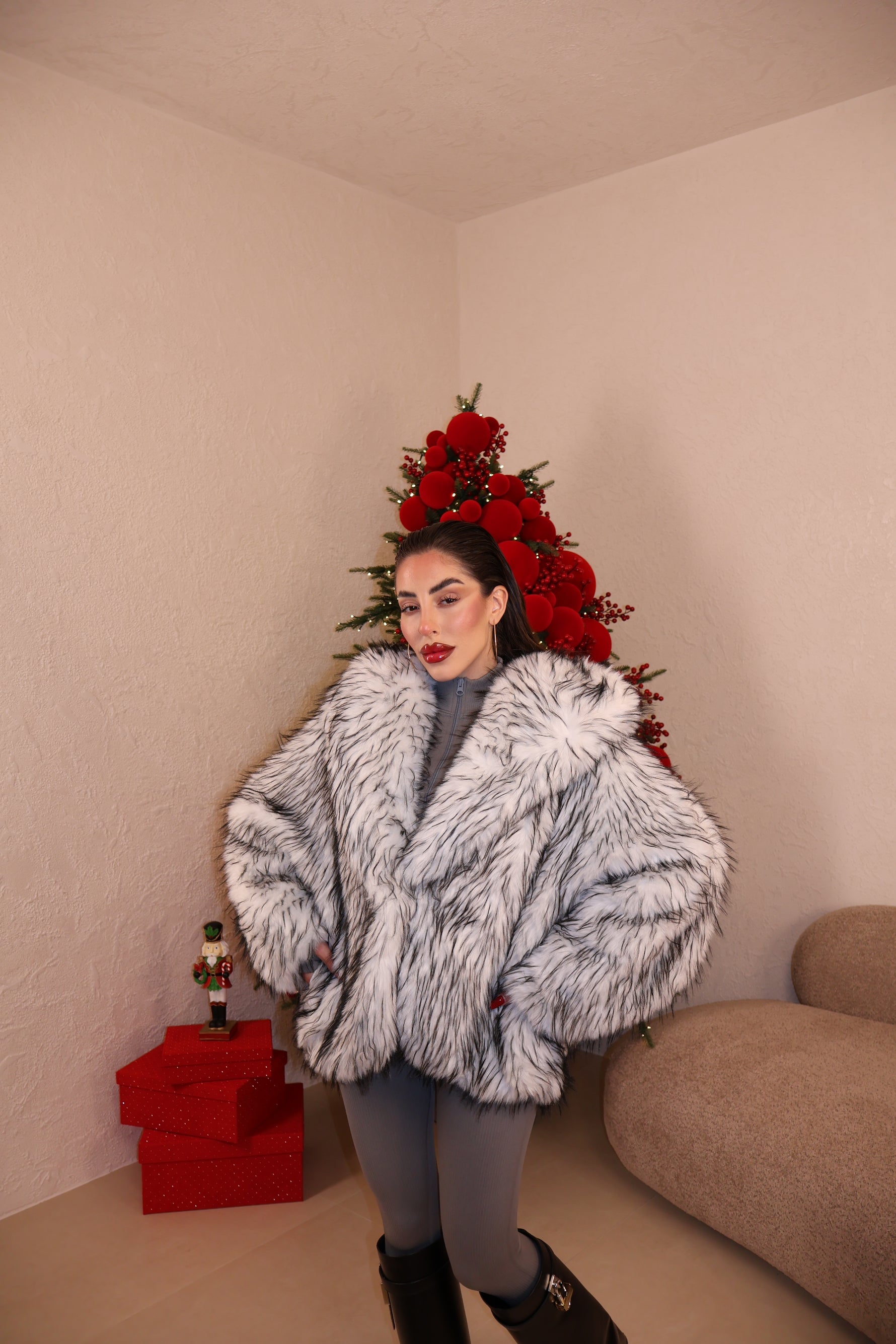 Pelliccia over con collo a revers,cappuccio e tasche. Sfumature interne a constrasto. Taglia unica.