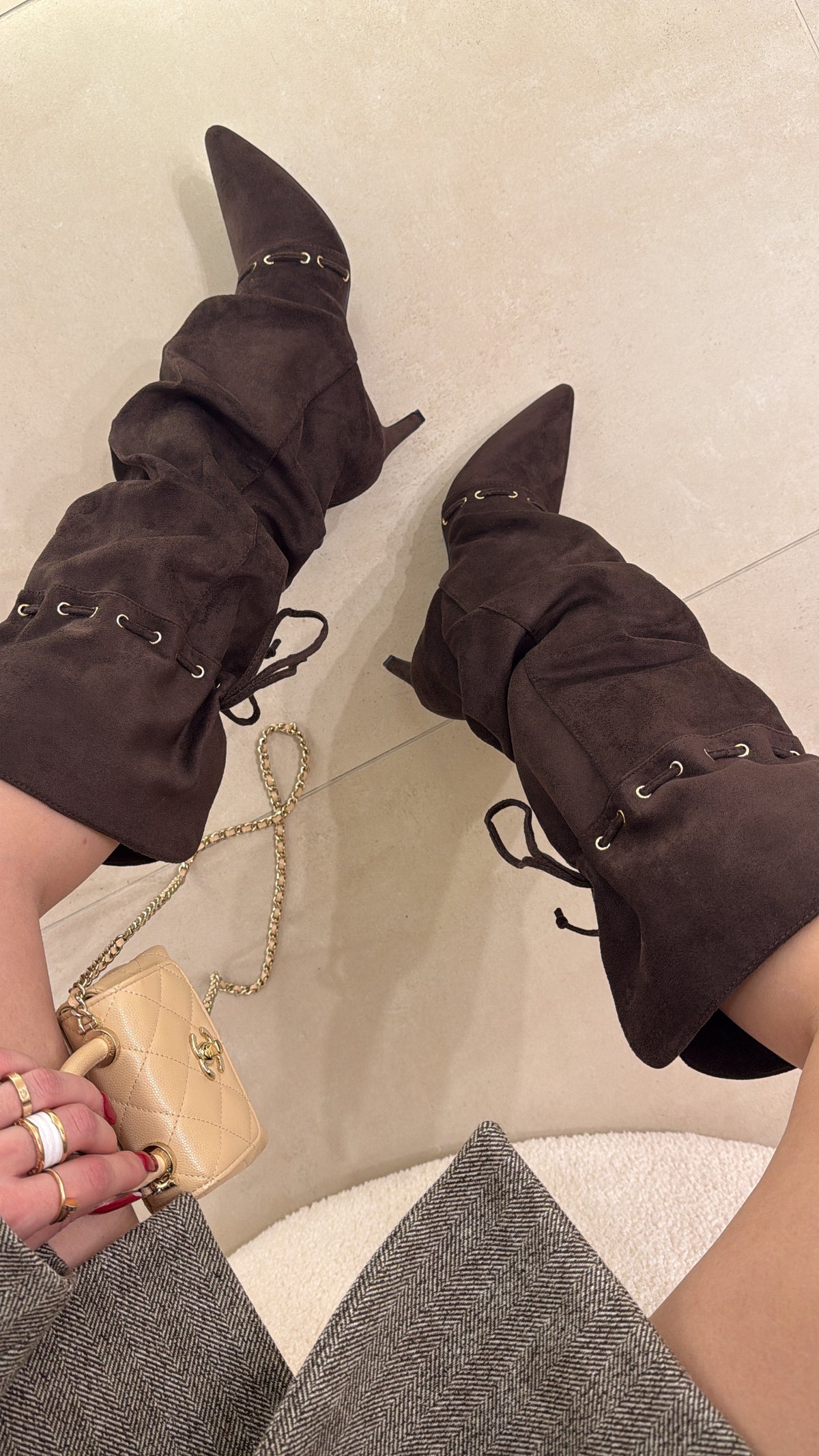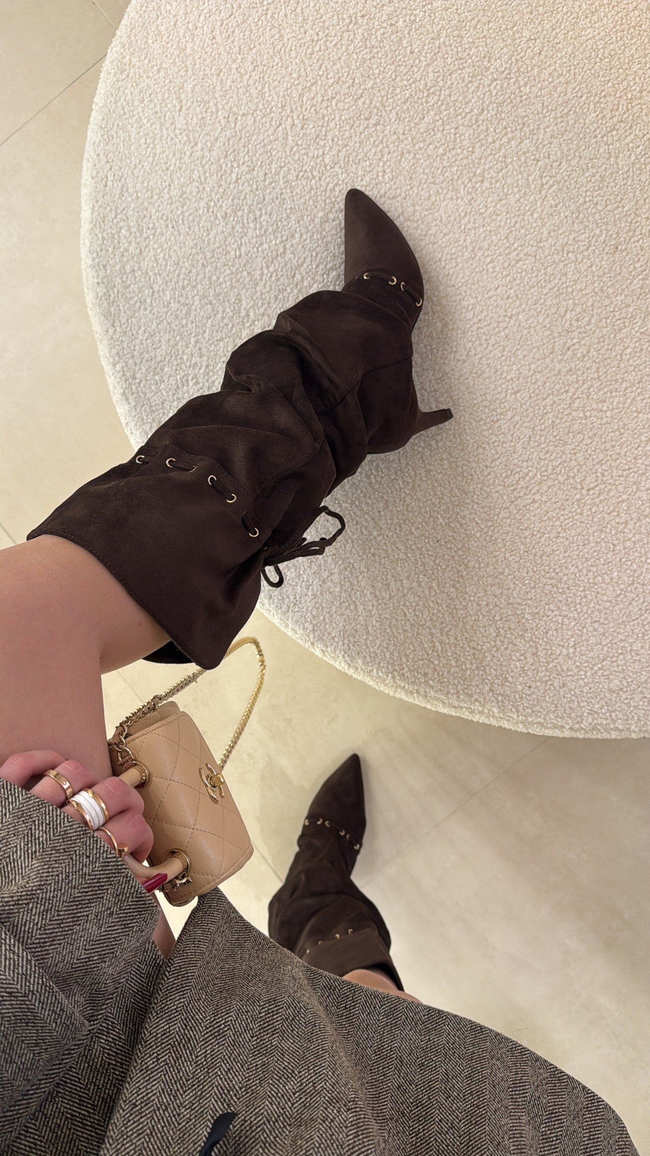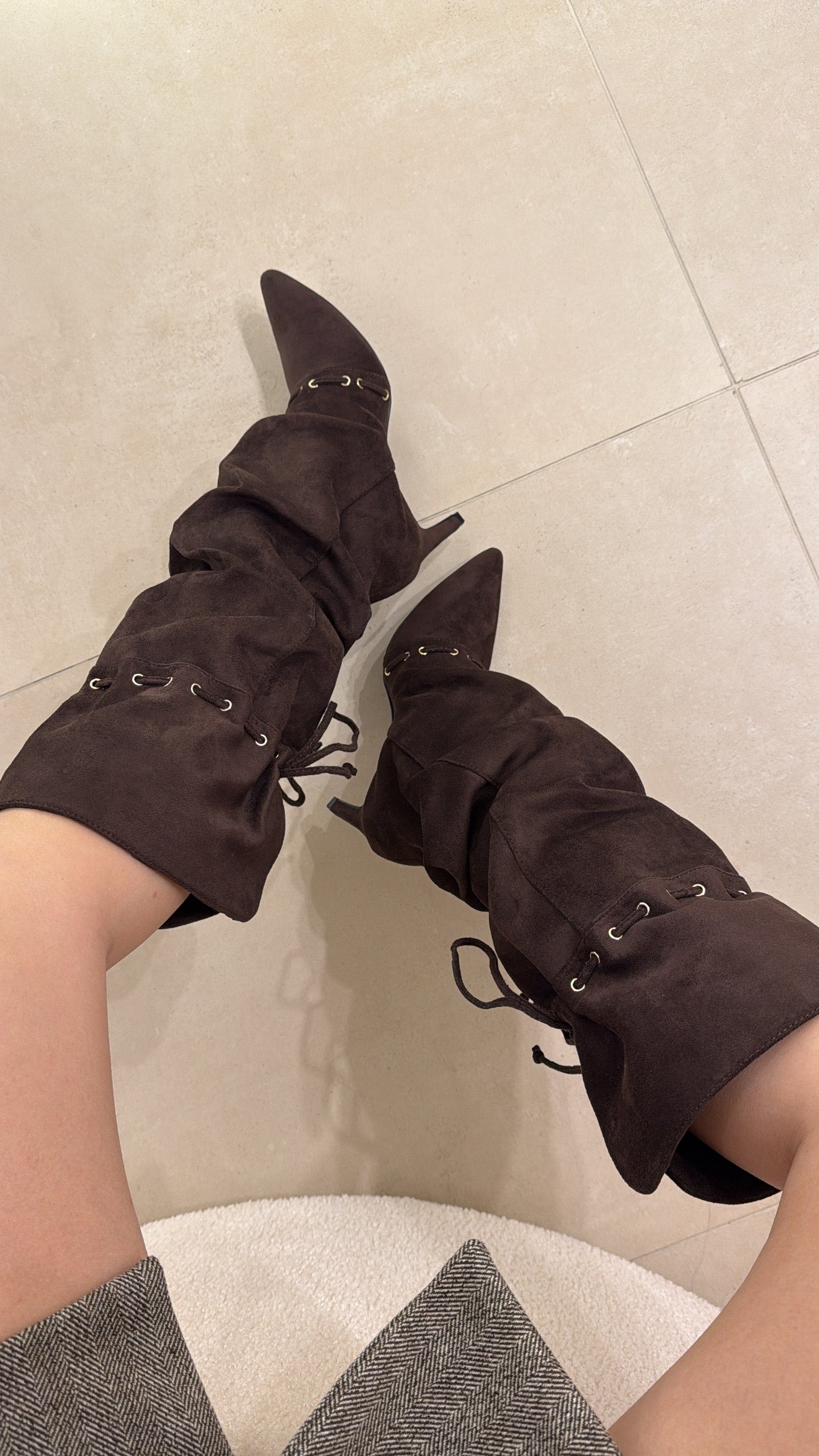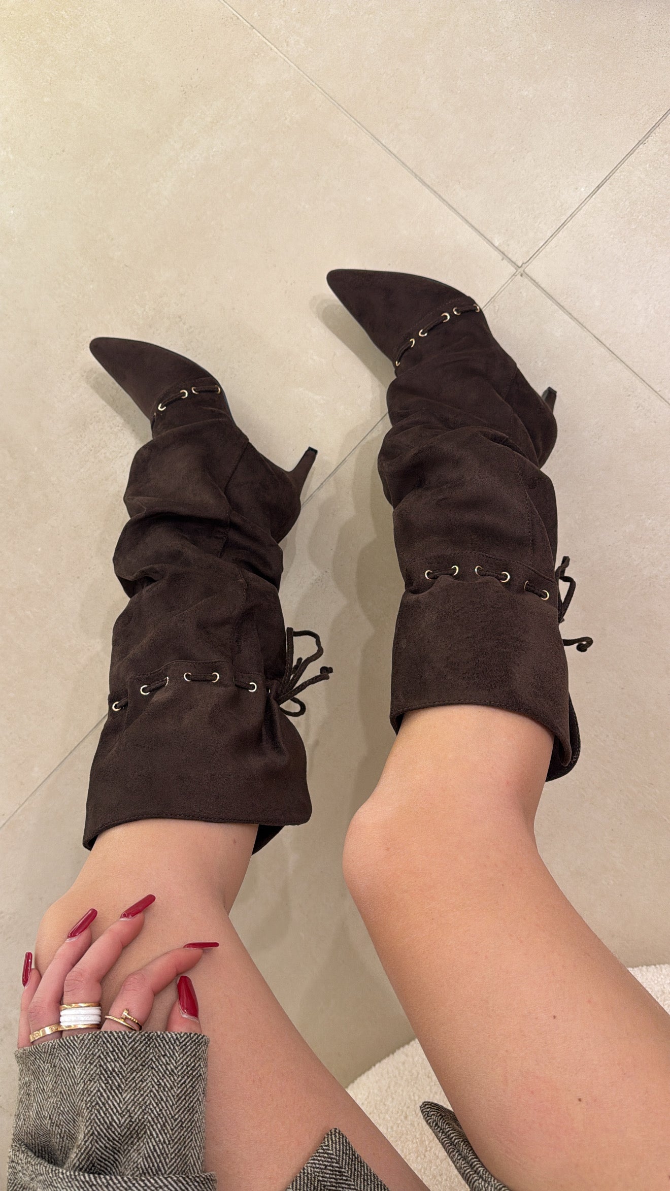 Stivale in ecocamoscio con tacco da 10cm. Dettaglio gambale arricciato. Calzata facile e regolare. Modello a punta.