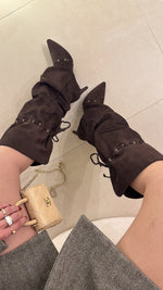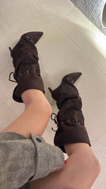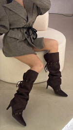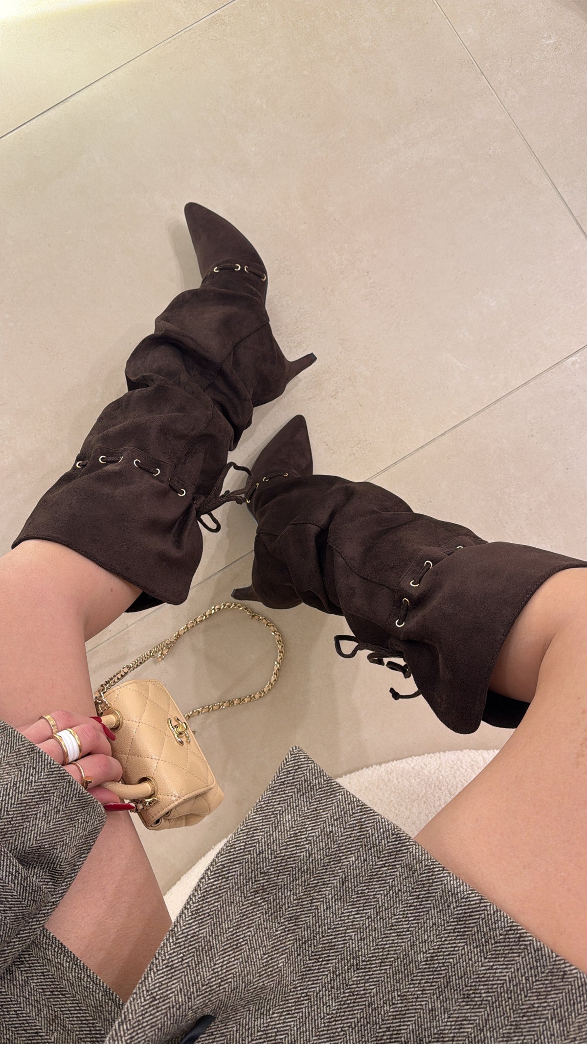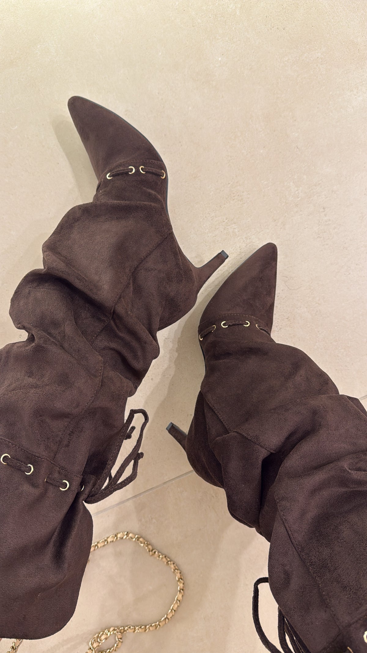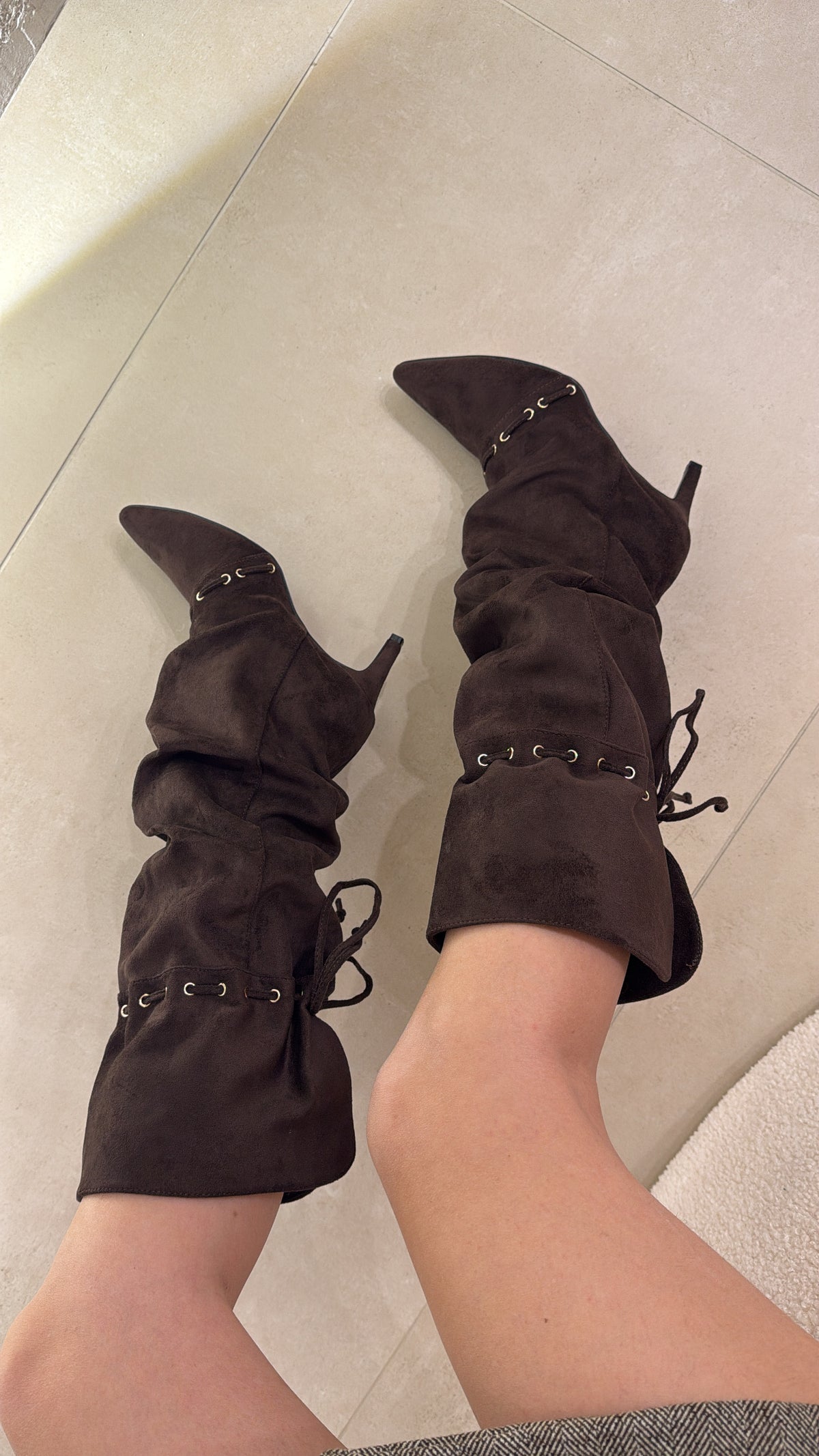 Stivale in ecocamoscio con tacco da 10cm. Dettaglio gambale arricciato. Calzata facile e regolare. Modello a punta.