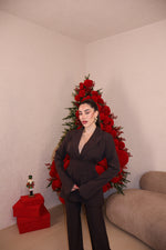 Prezzo unitario / perTailleur composto da pantalone vita alta con elastico sul retro e giacca con fascia in vita elasticizzata e cerniera laterale. Taglia unica.