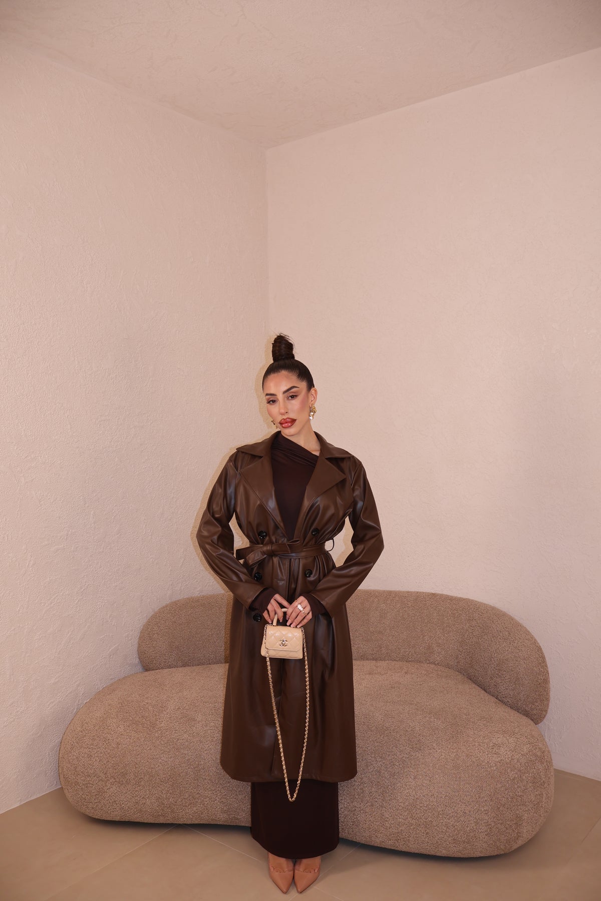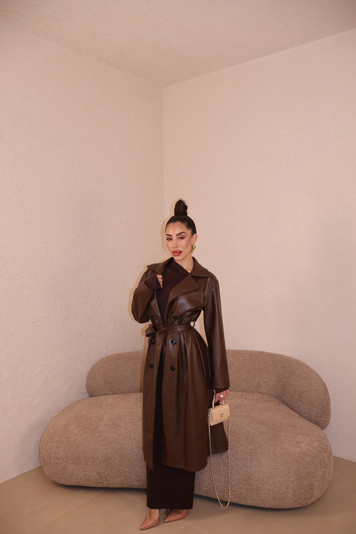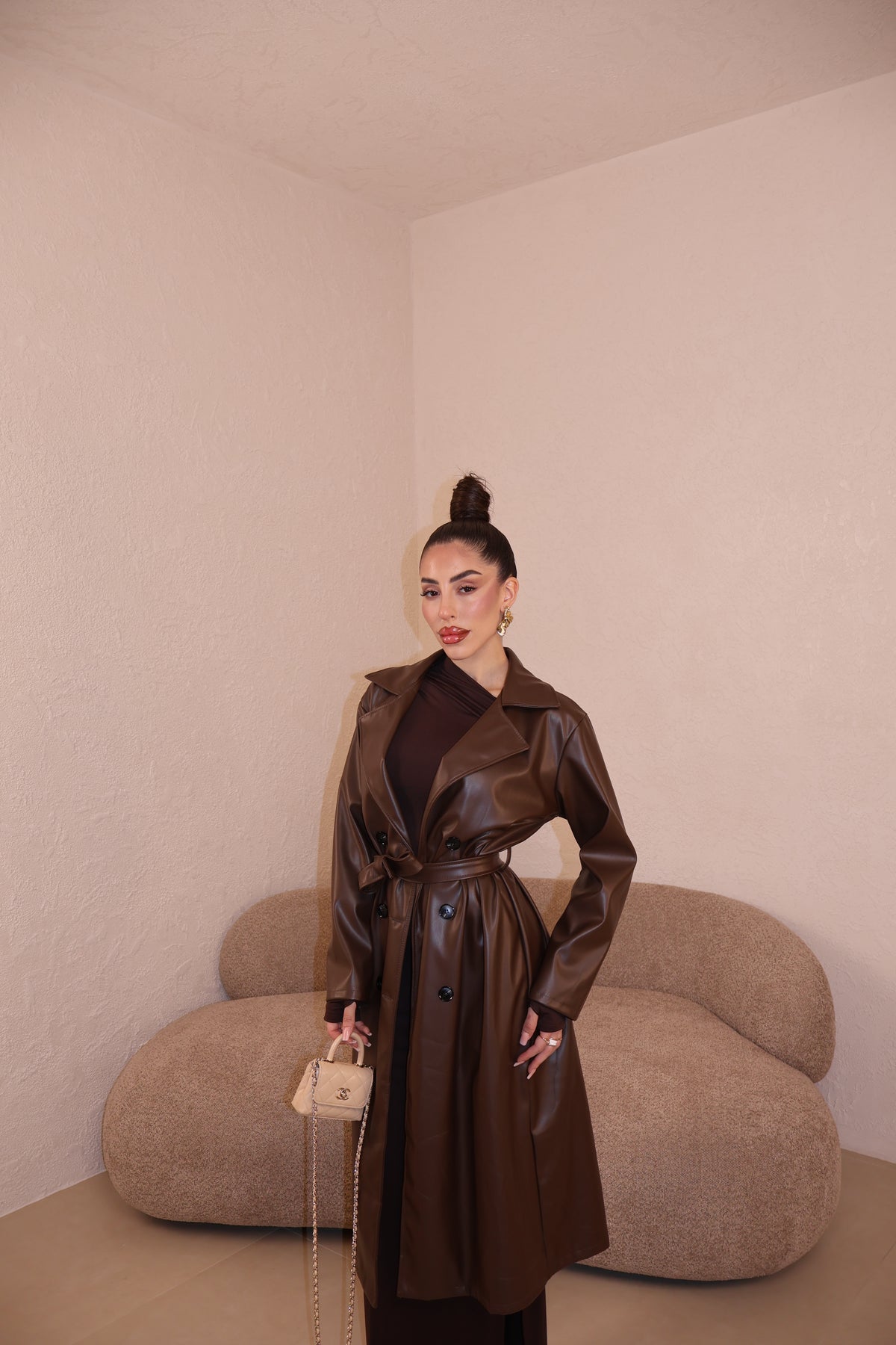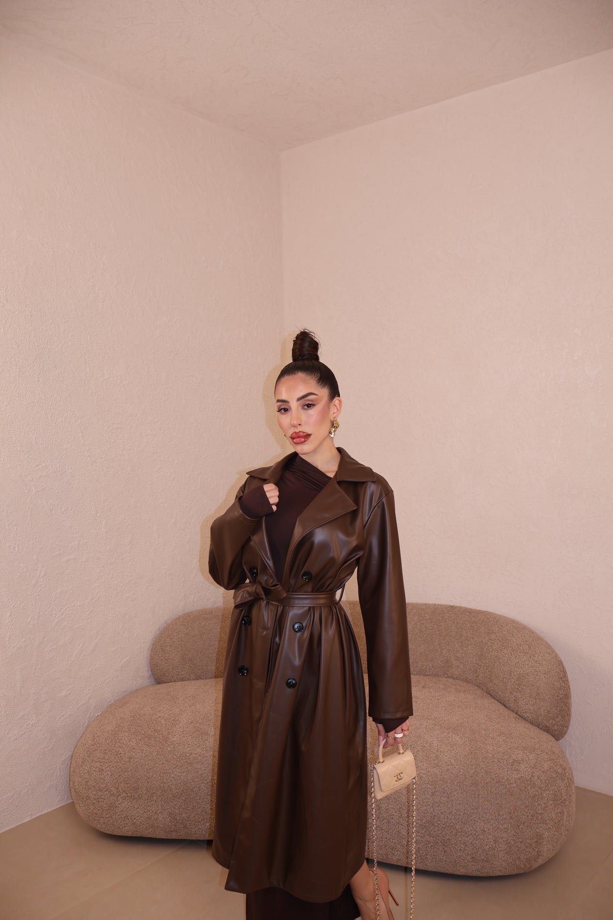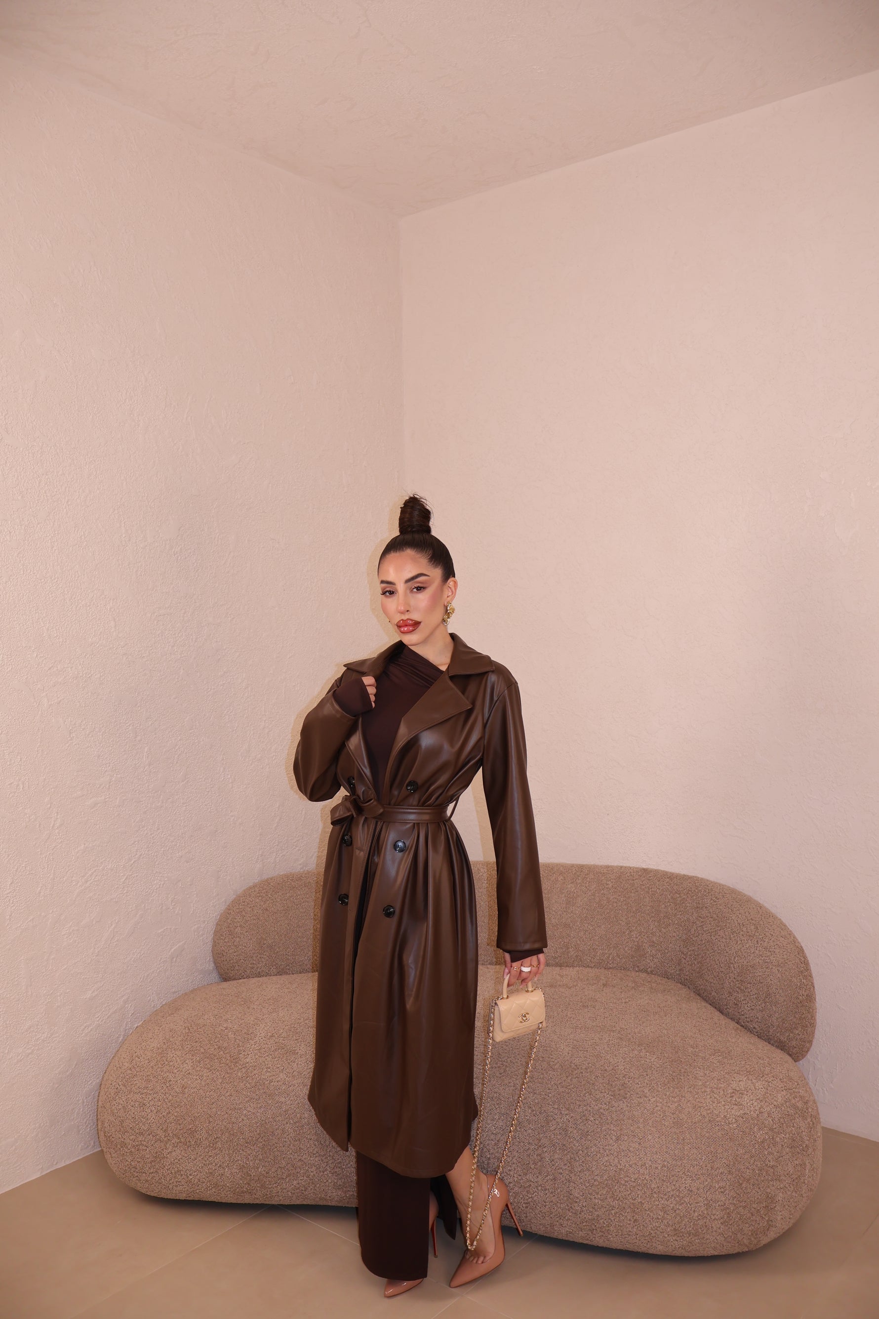 Trench in ecopelle con bottoni e cintura in vita. Taglia unica.