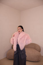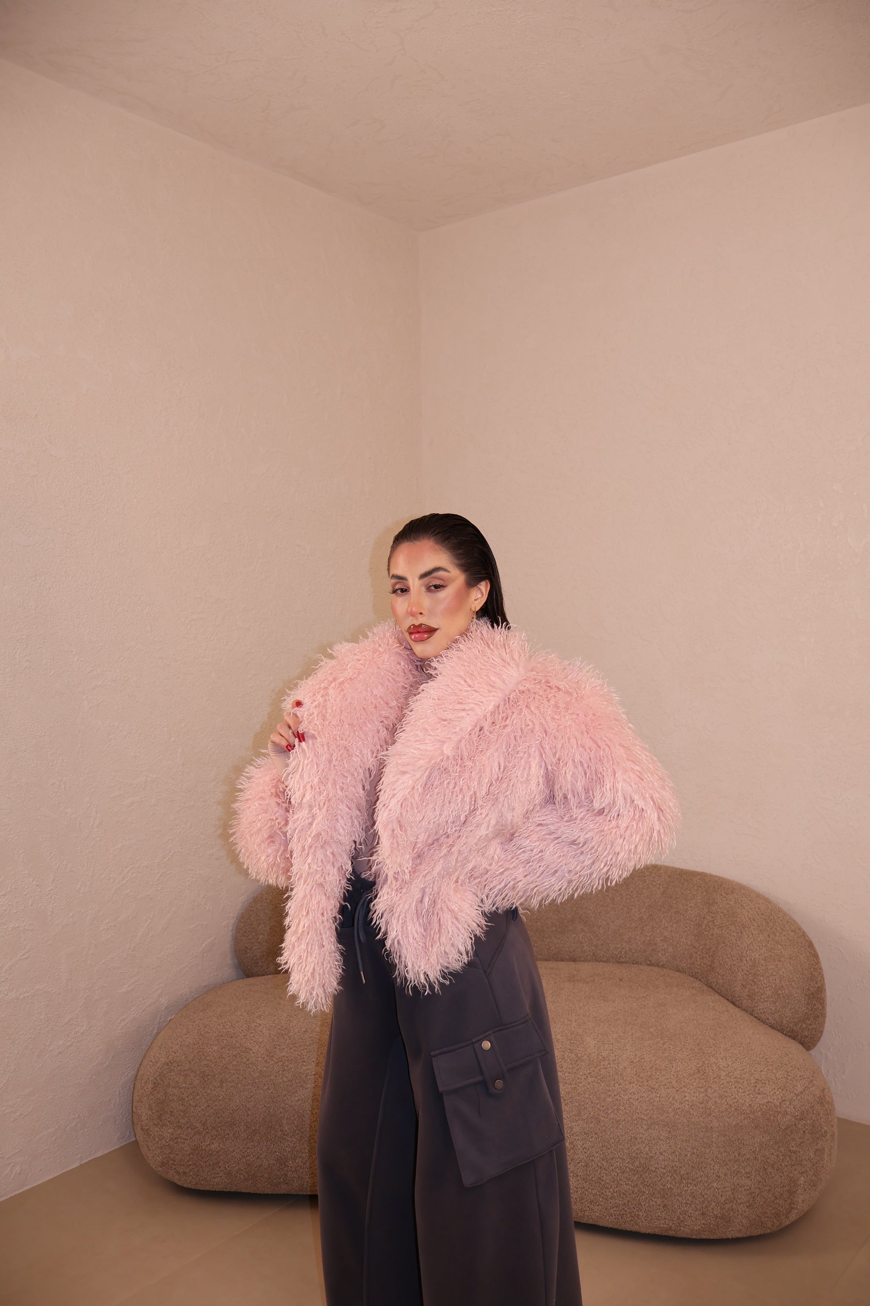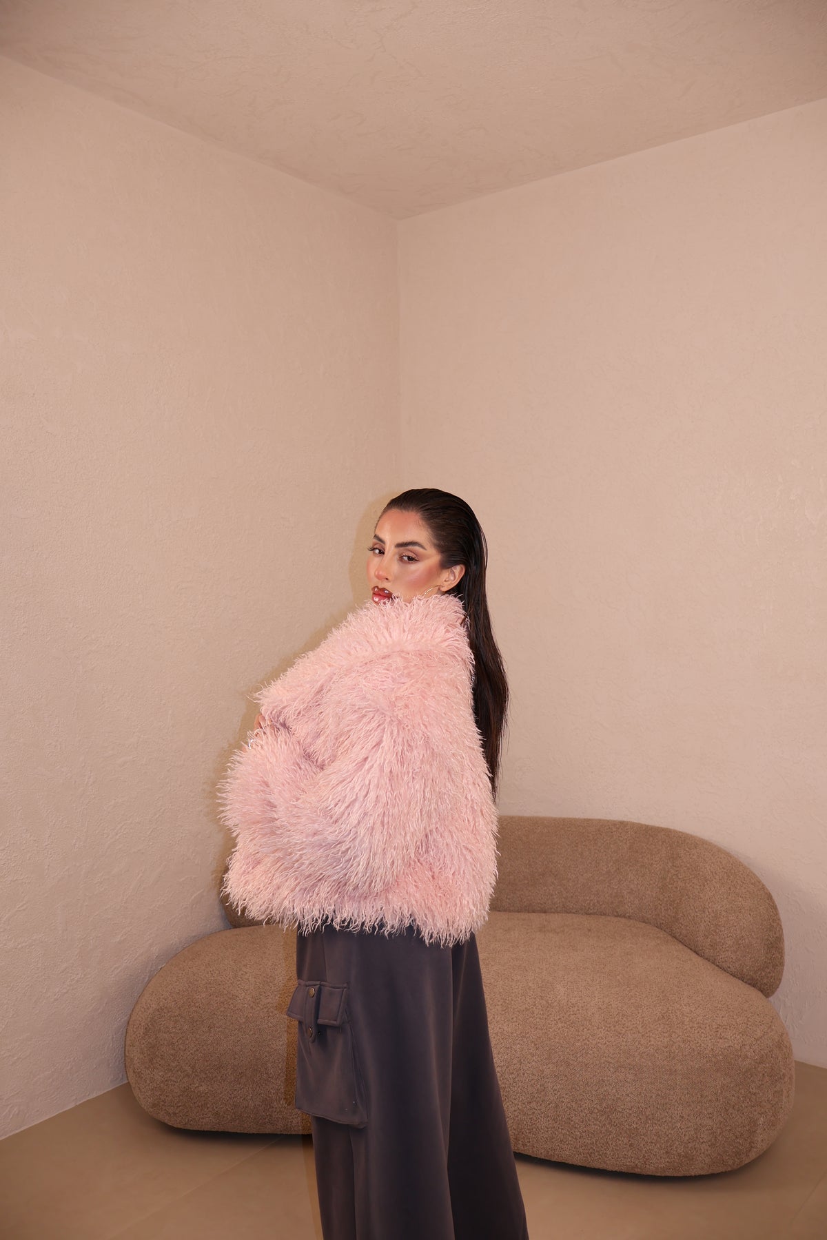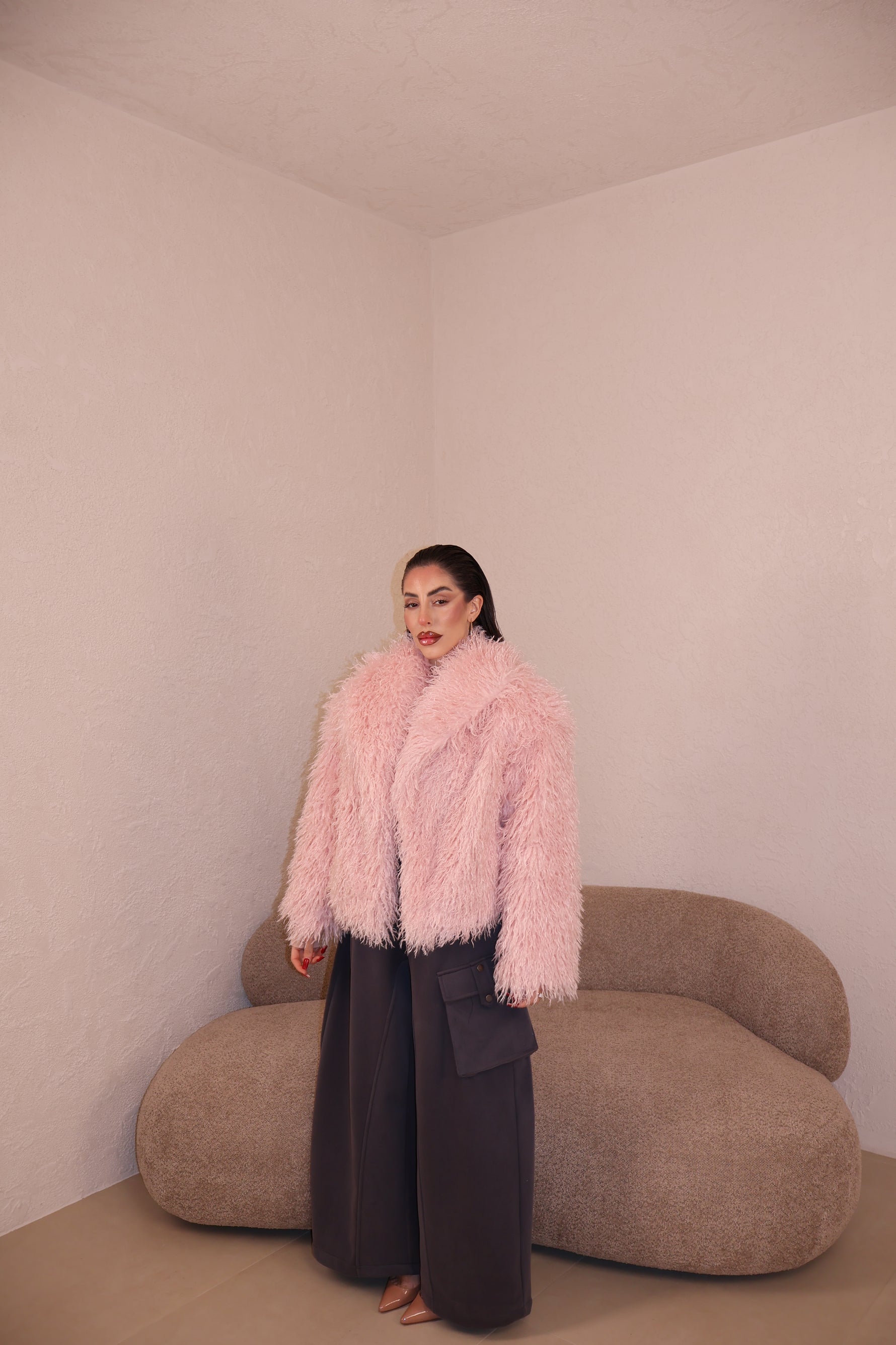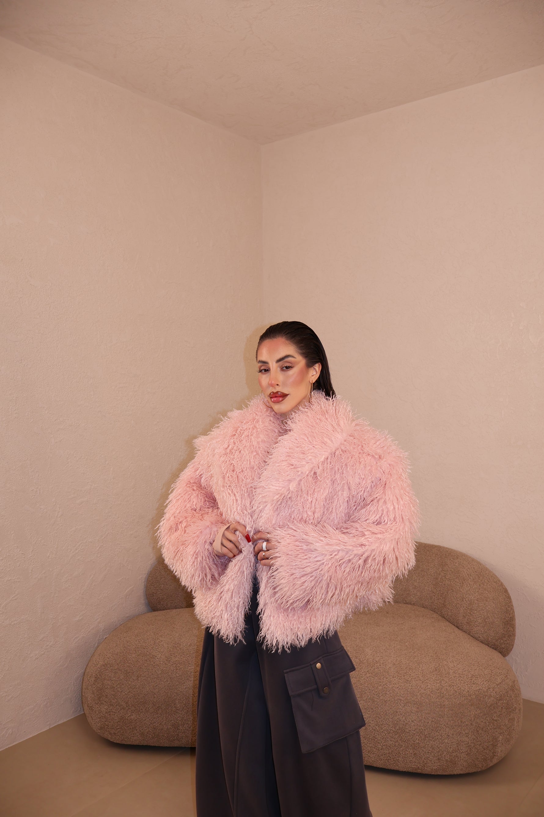 Pelliccia corta modello mongolia con collo a revers. Tasche laterali. Taglia unica.
