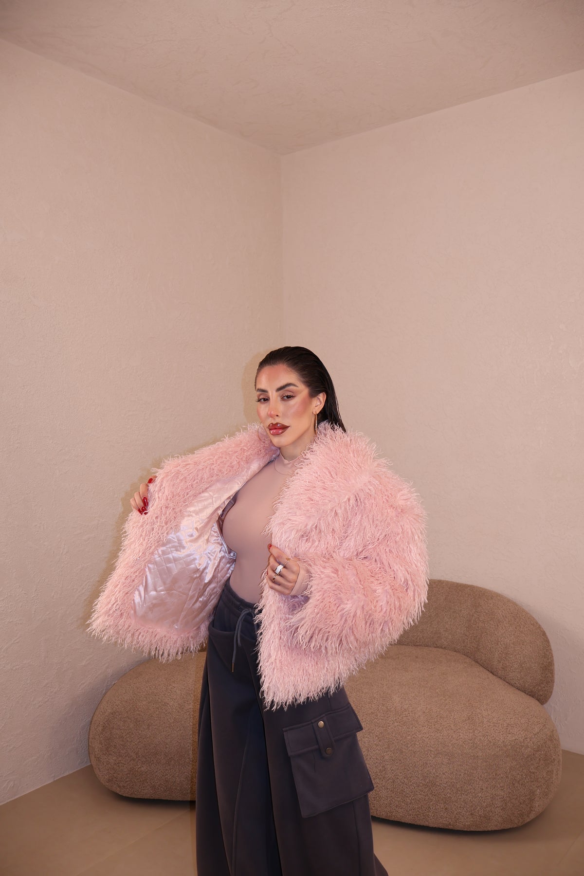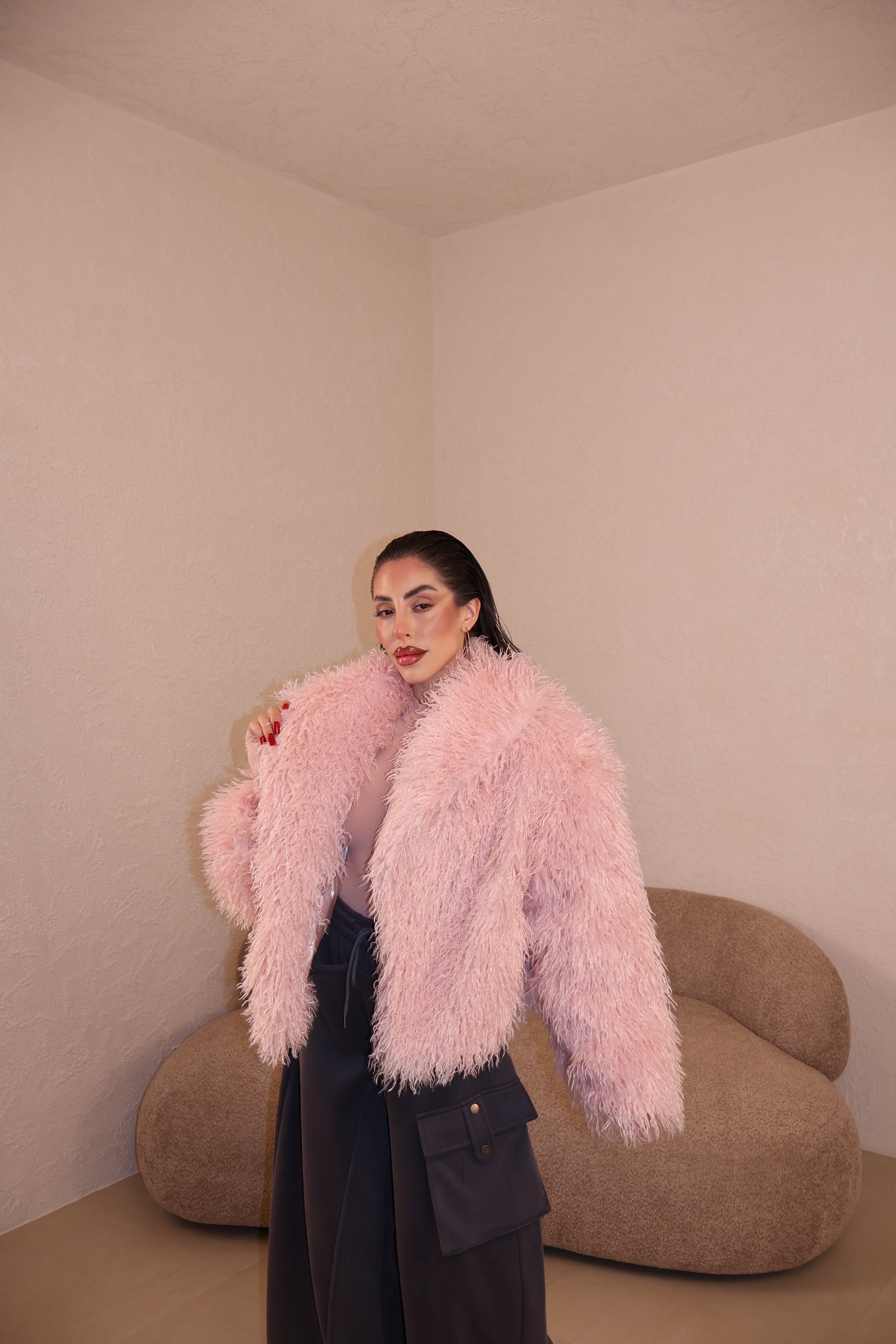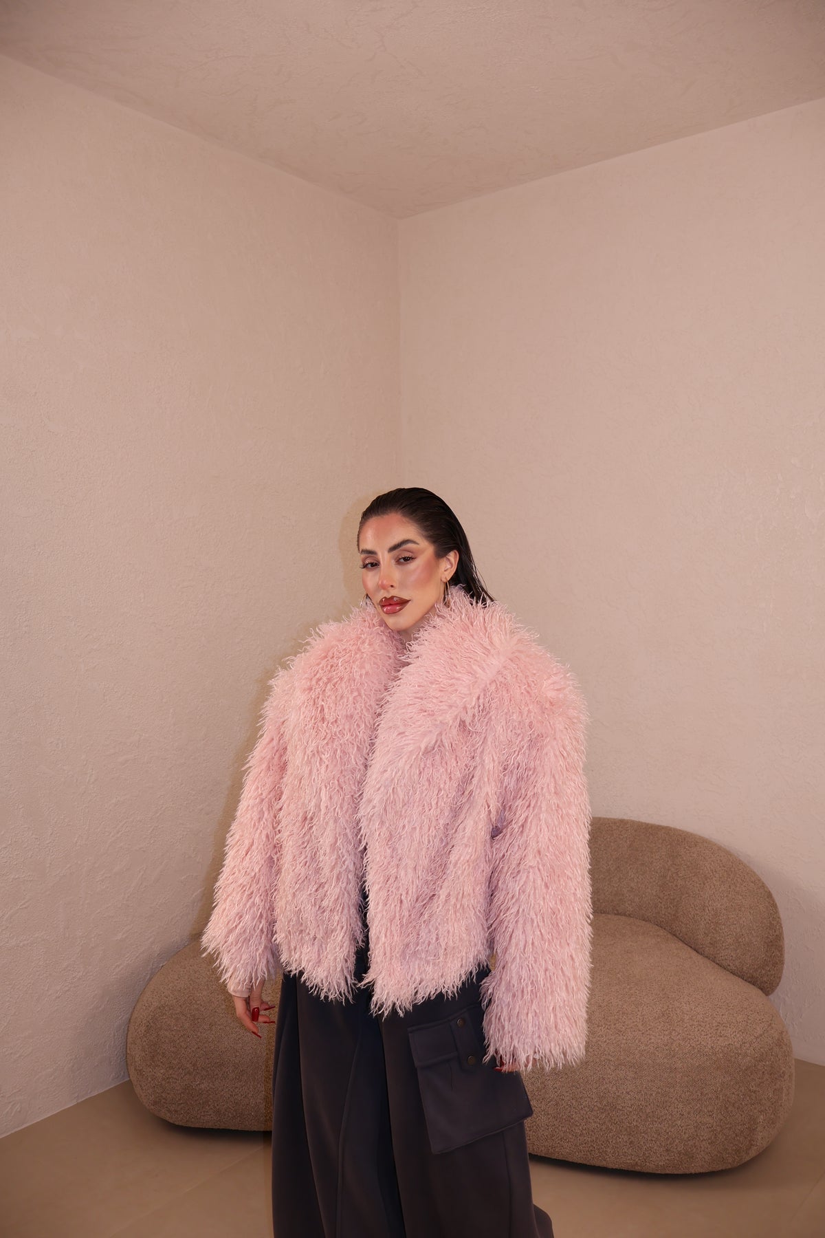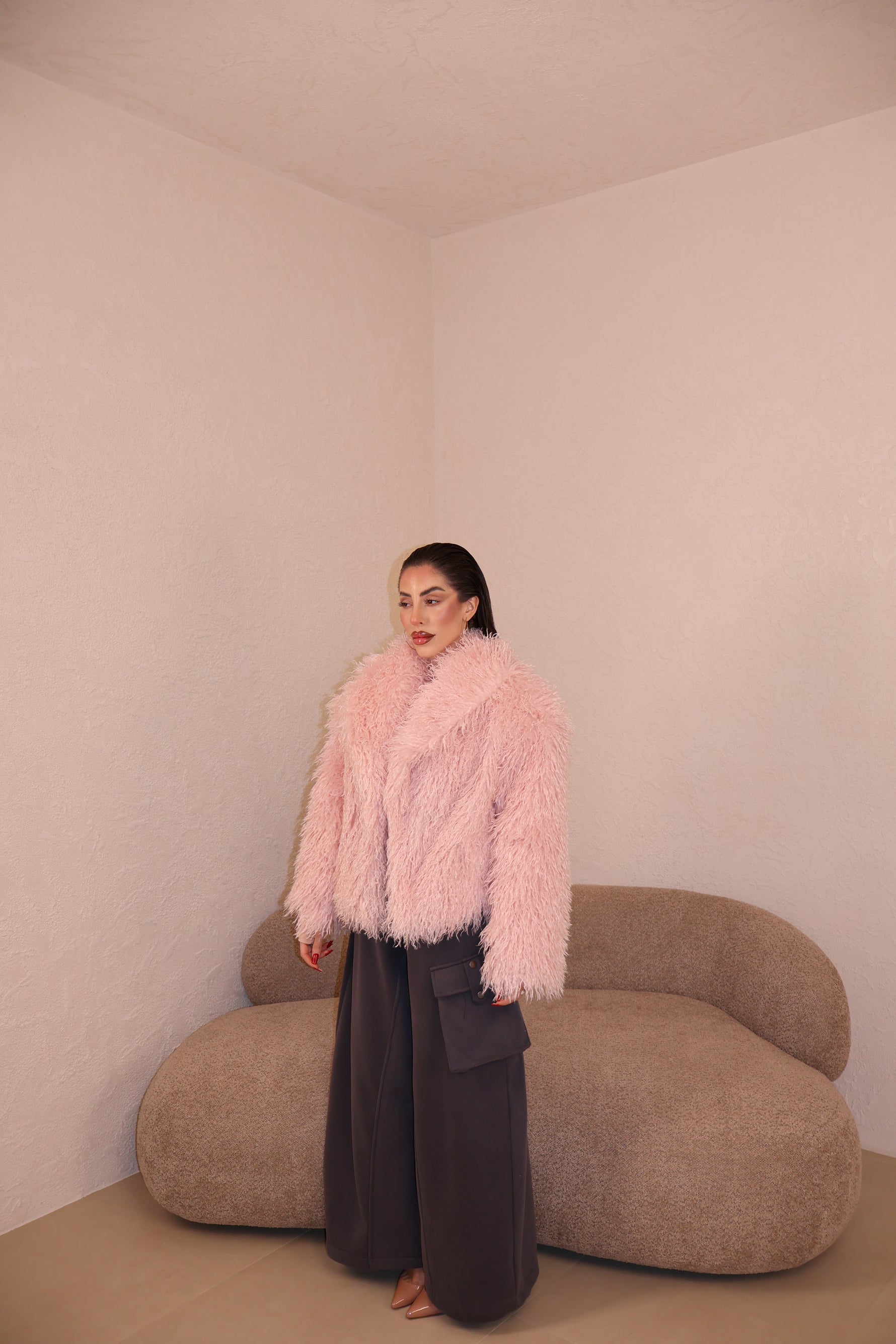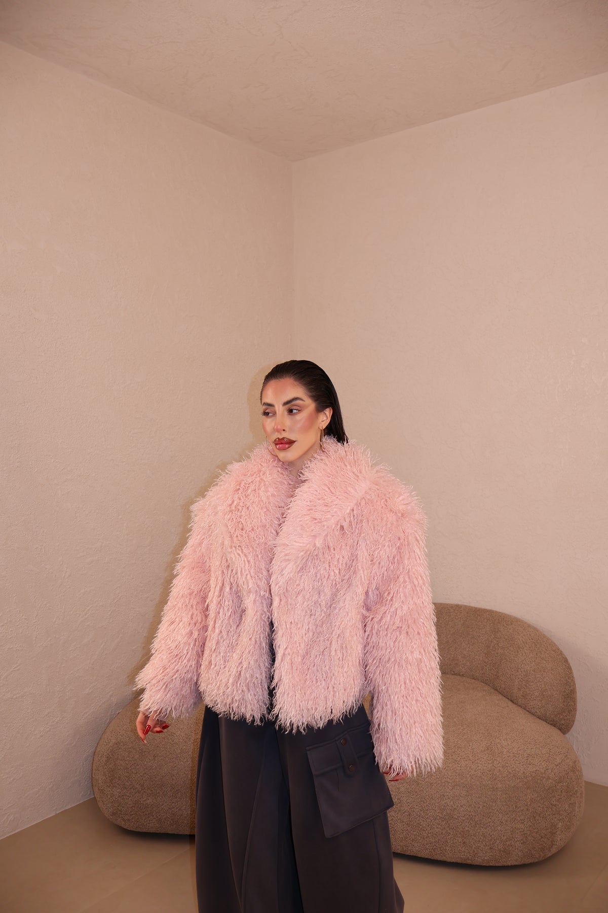 Pelliccia corta modello mongolia con collo a revers. Tasche laterali. Taglia unica.