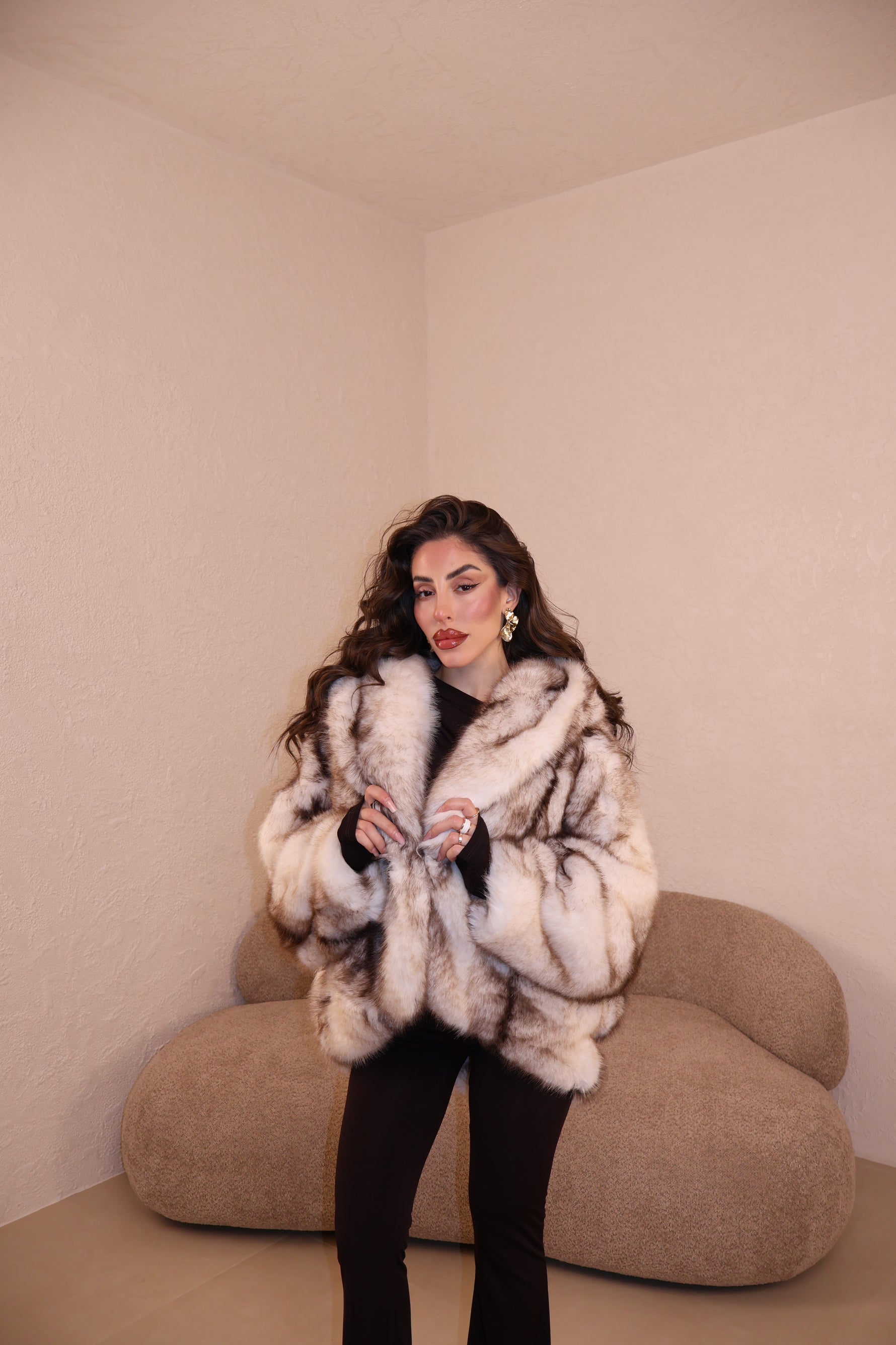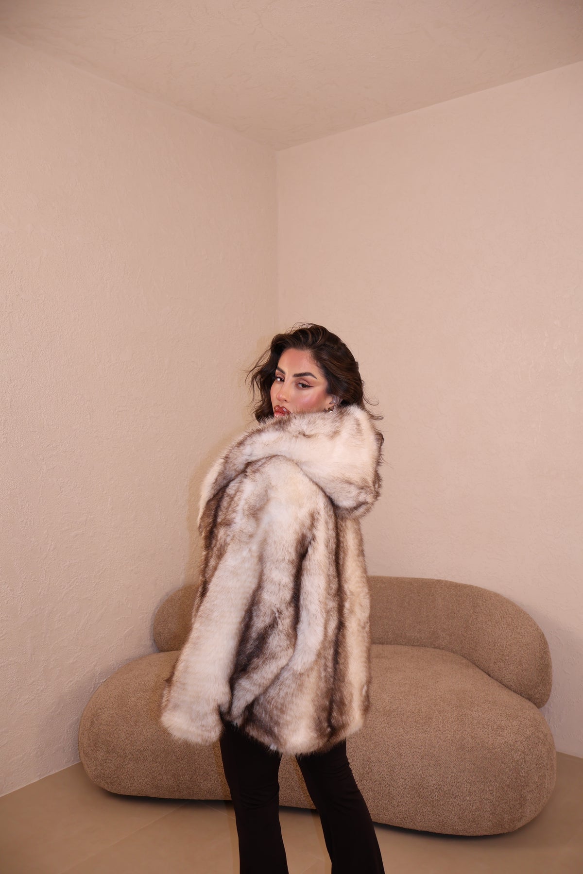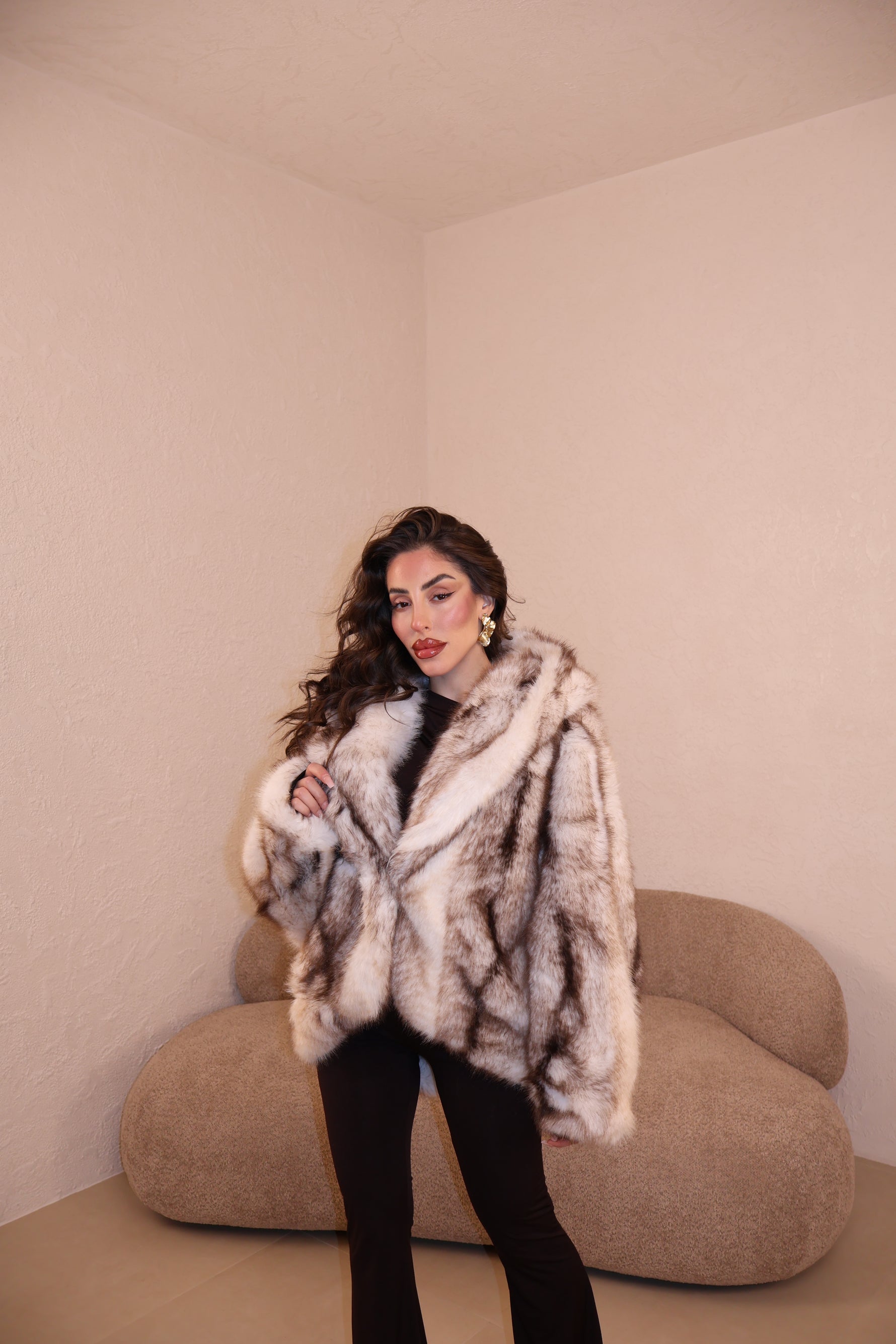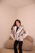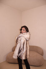 Pelliccia over con cappuccio e gancetti. Taglia unica.