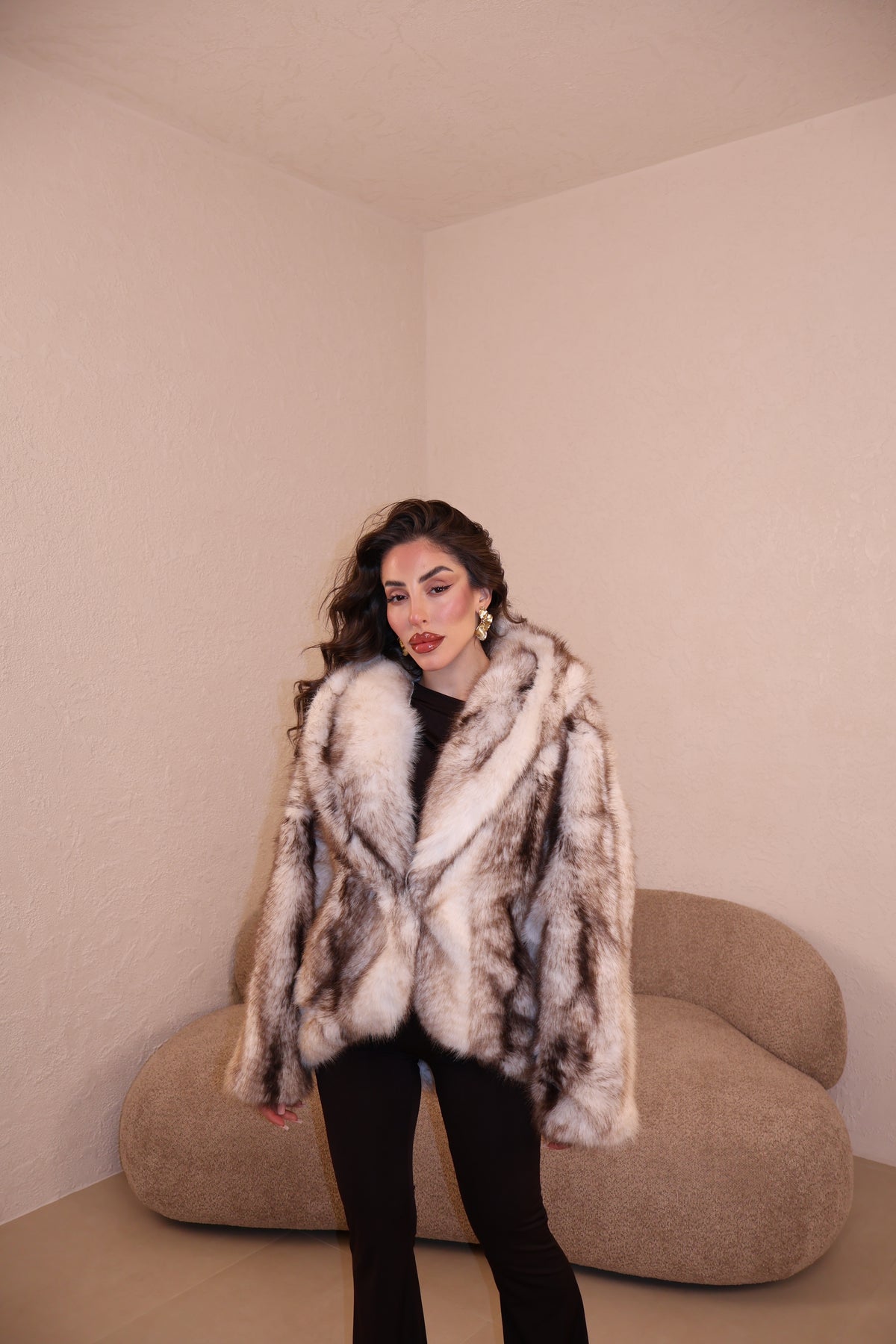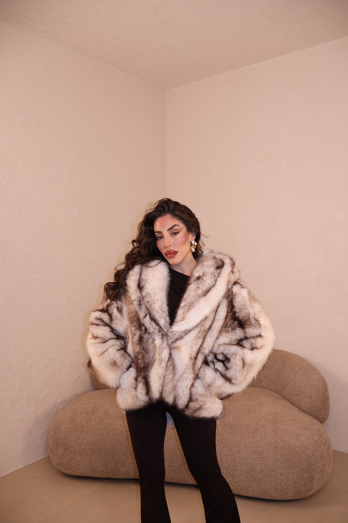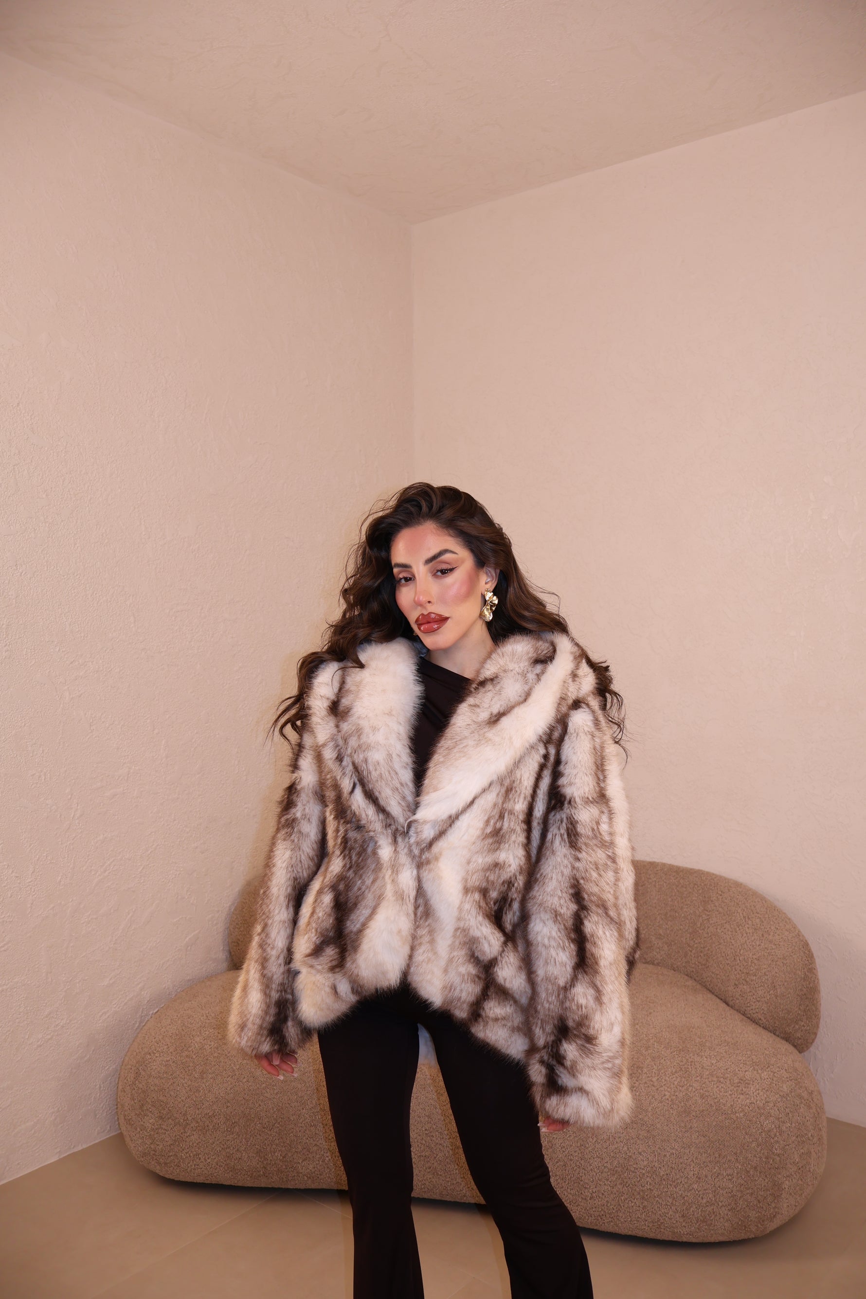 Pelliccia over con cappuccio e gancetti. Taglia unica.