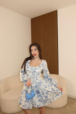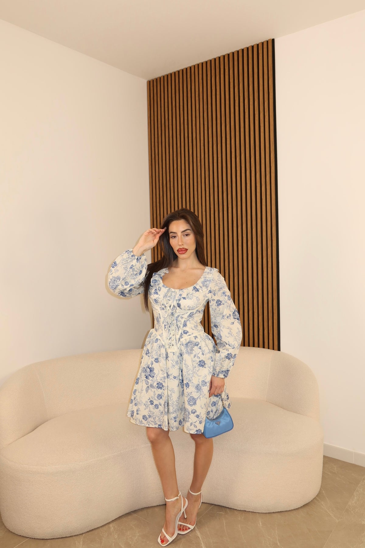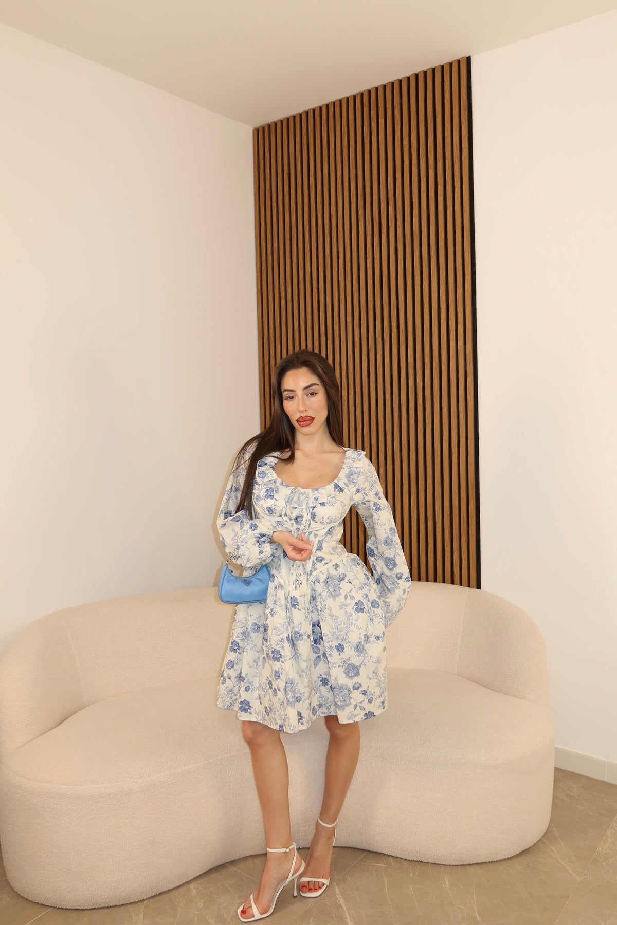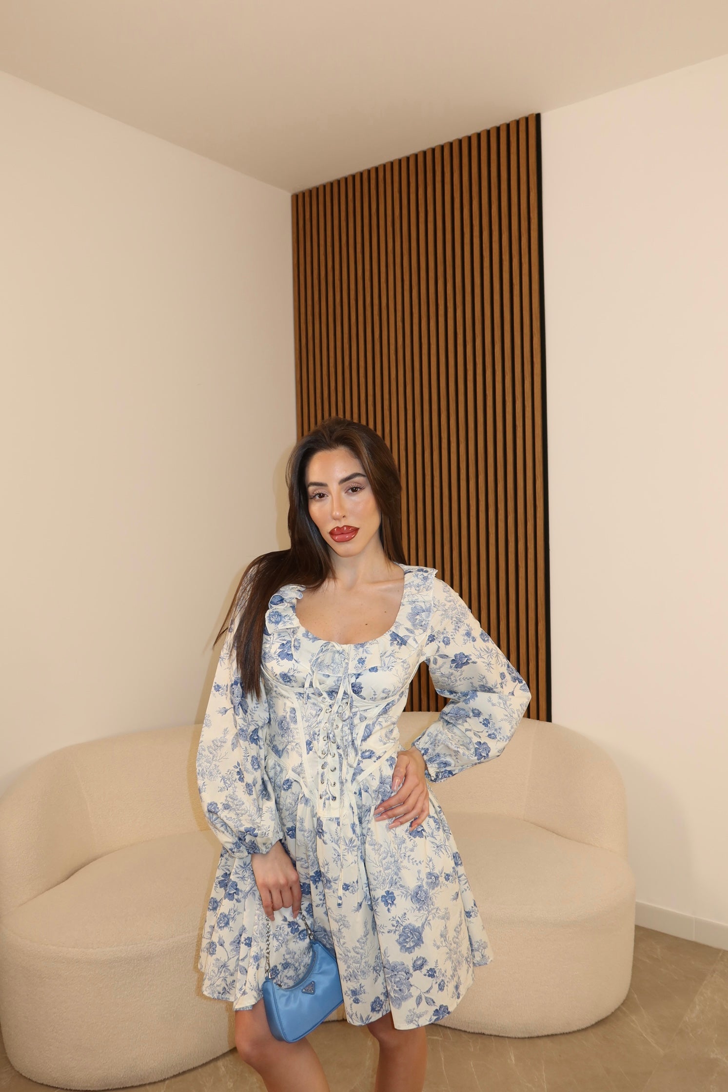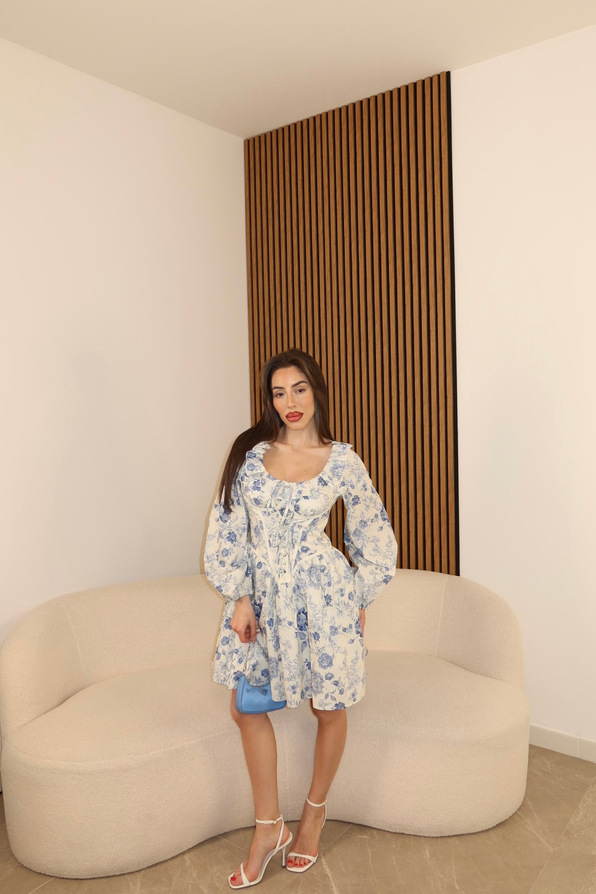 Abito corto in fantasia con laccetti e maniche a sbuffo.