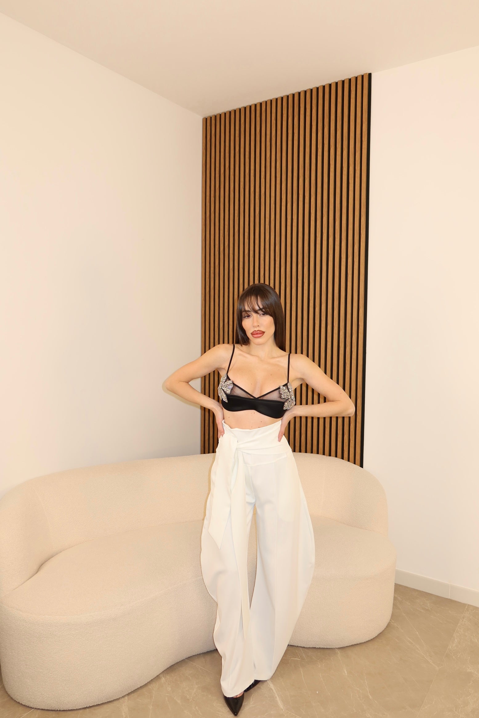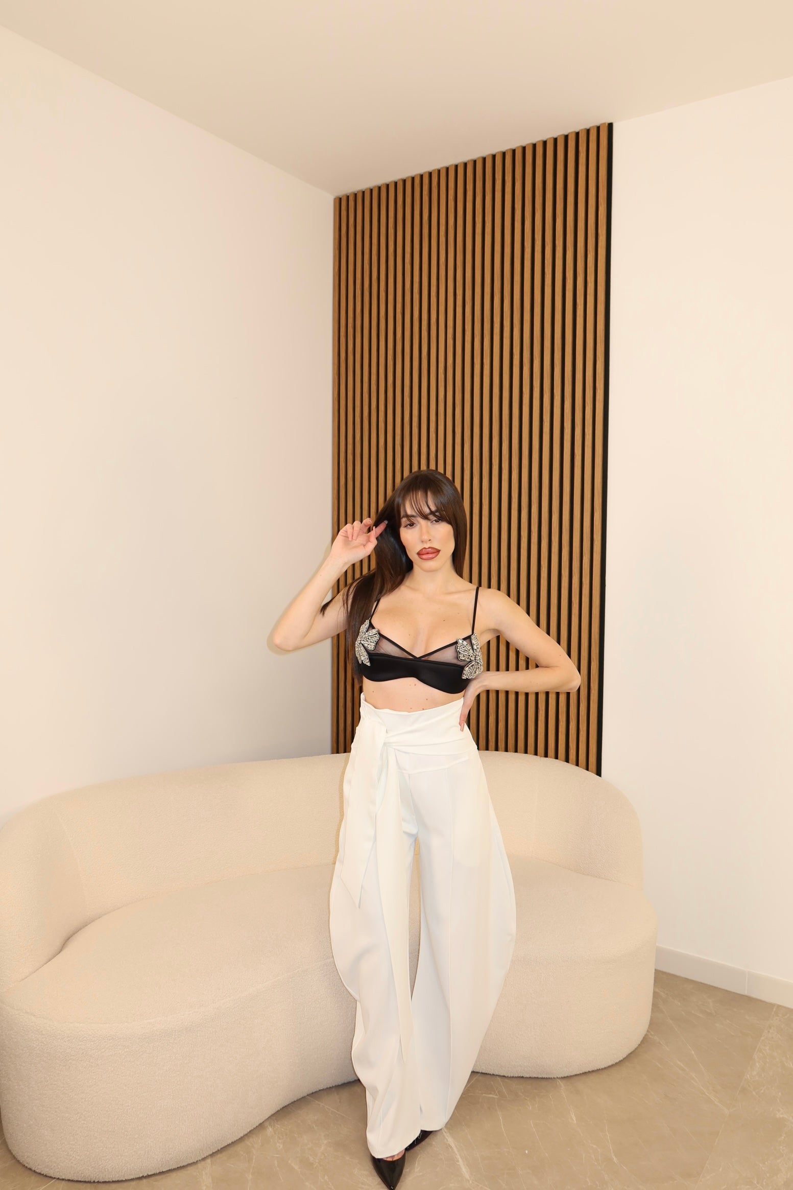 Il pantalone a palazzo ha passanti, l’elastico e piccoli spacchi lateralmente. Veste morbido/ leggermente largo. Con i tacchi è pazzesco. Grazie di tutto.❤️