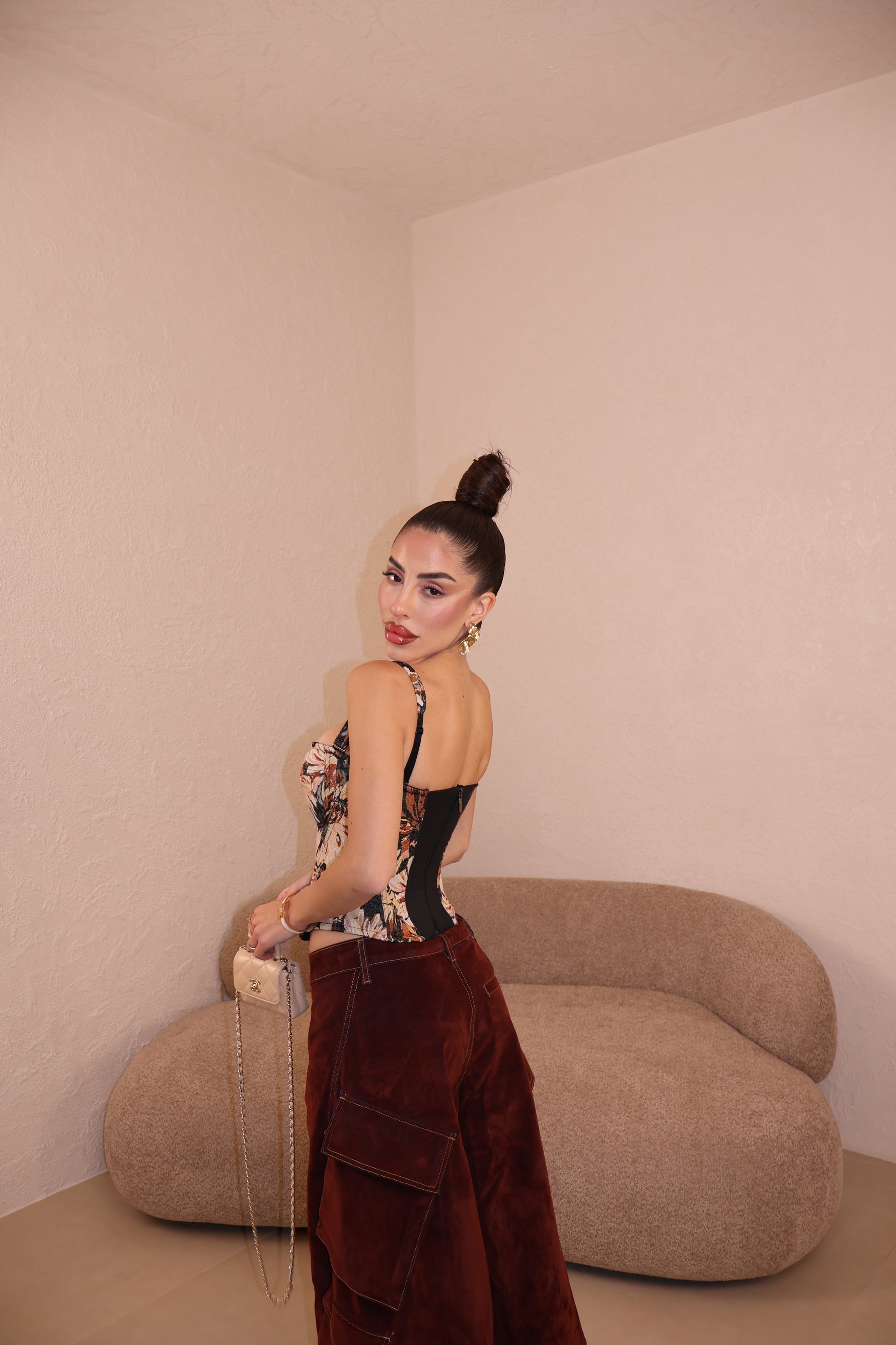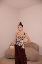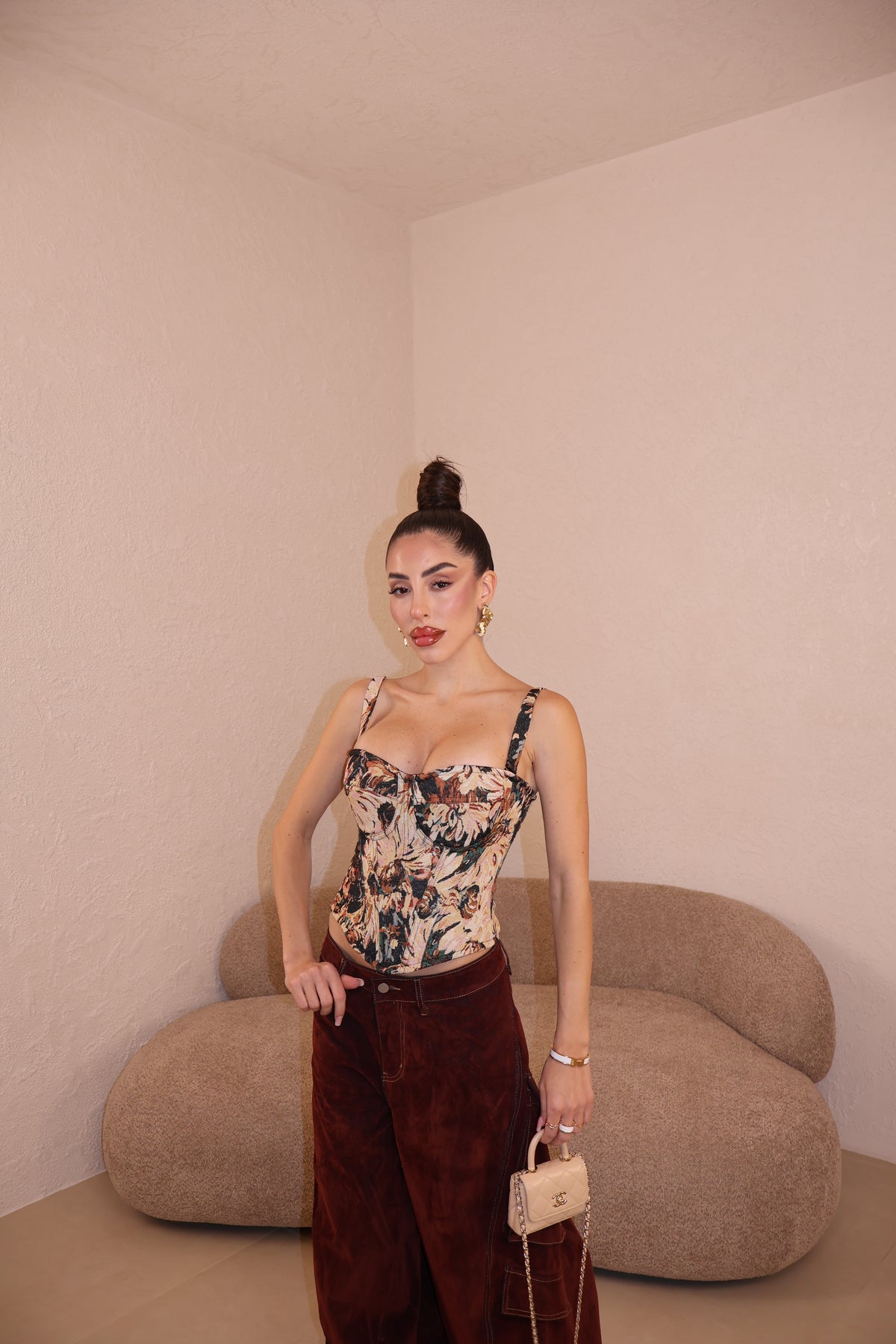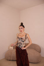 Corsetto nella fantasia floreale con bretelle regolabili,cerniera sul retro e coppe preformate ed imbottite. Taglia unica.
