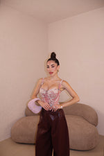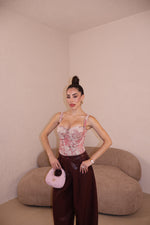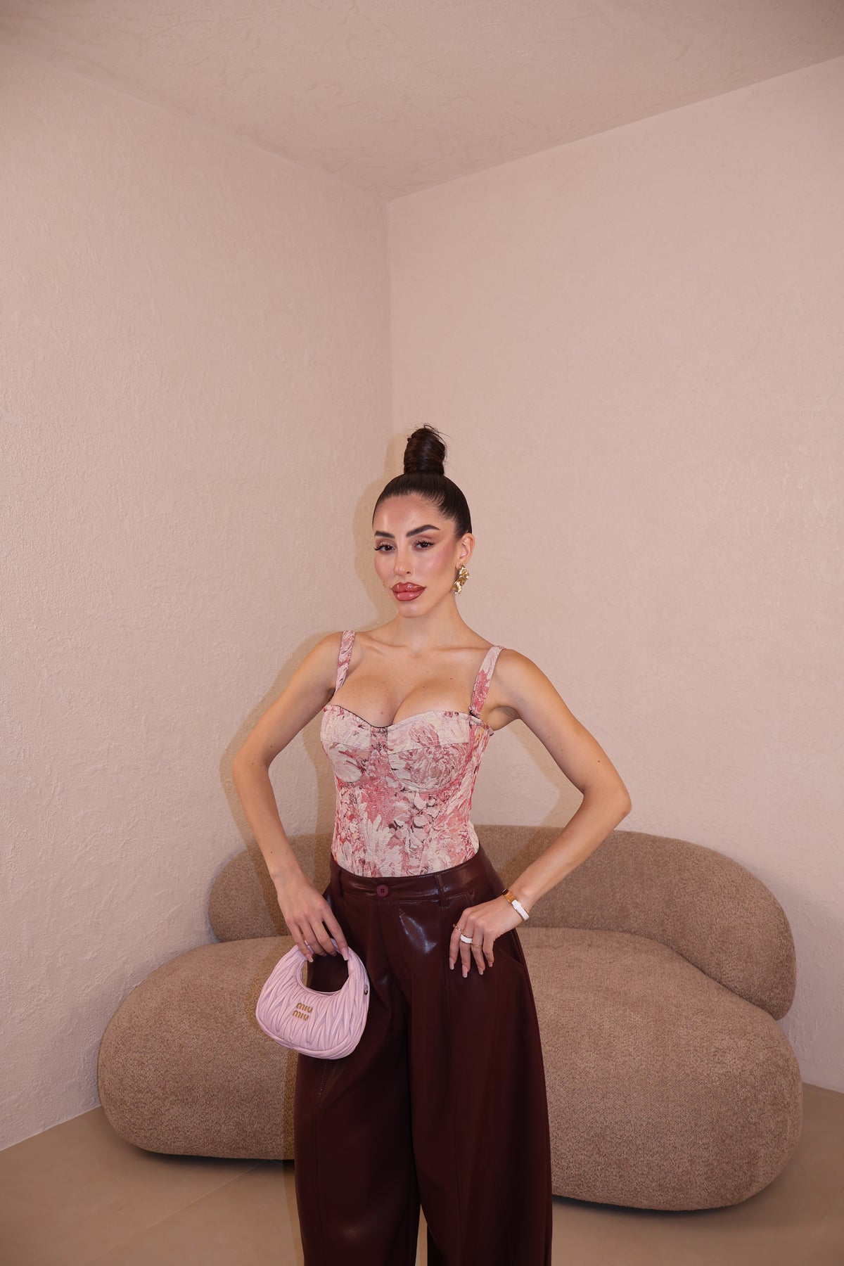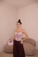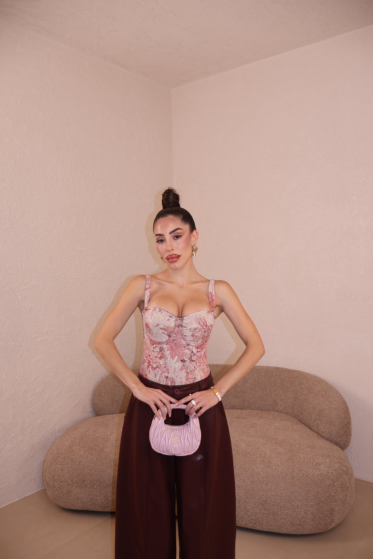 Corsetto nella fantasia floreale con bretelle regolabili,cerniera sul retro e coppe preformate ed imbottite. Taglia unica.