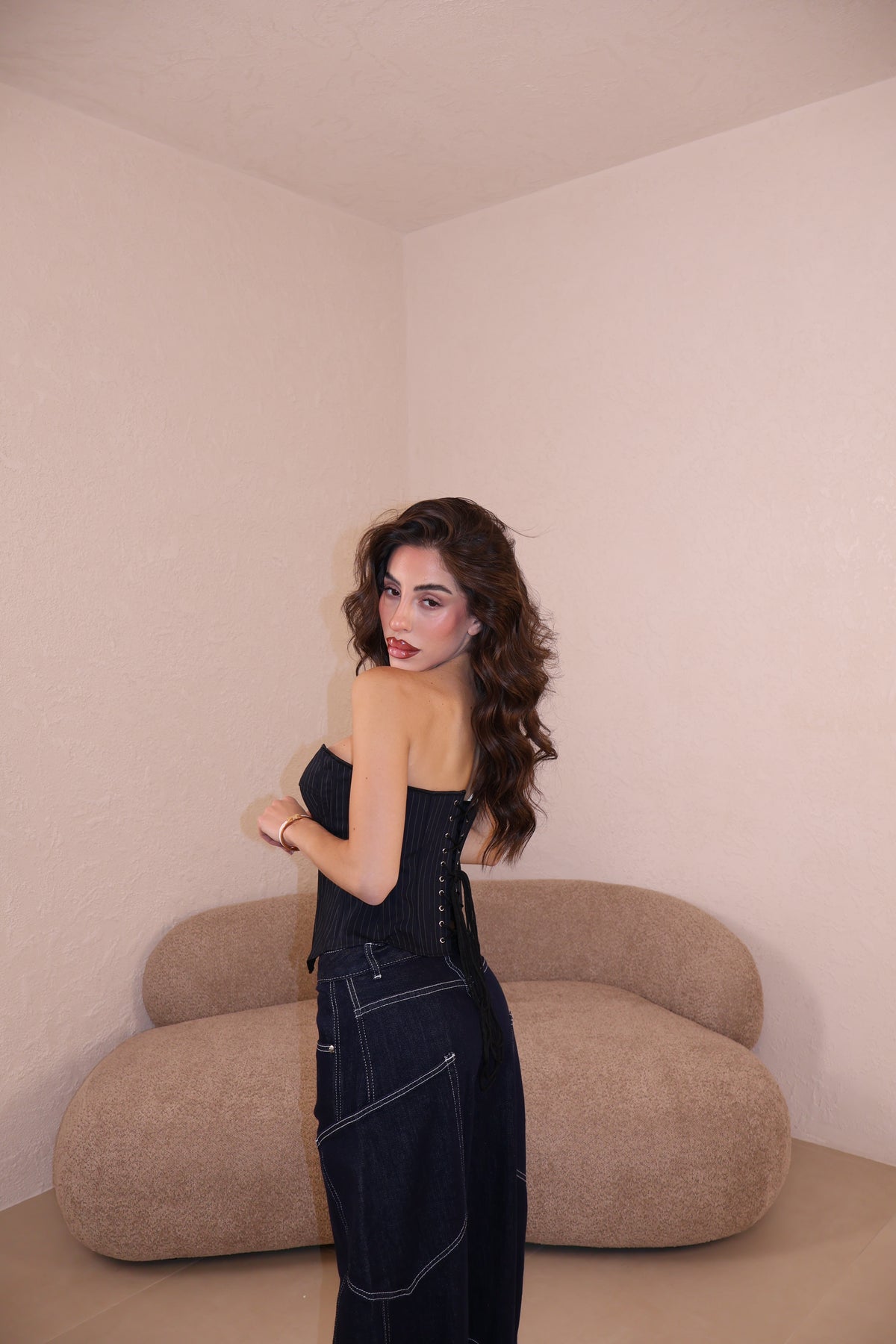 Corsetto gessato con cerniera laterale e laccetti regolabili sul retro. La modella indossa taglia S.