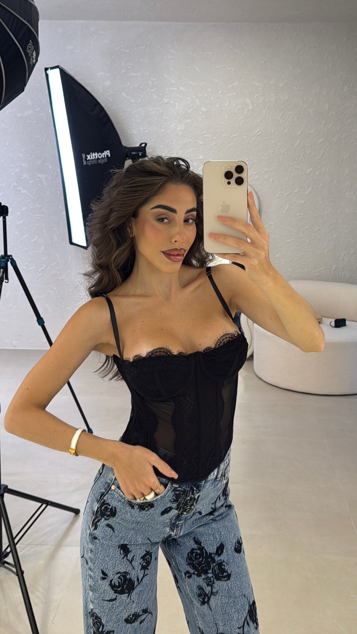 Corsetto in pizzo con bretelle regolabili e coppa preformata.