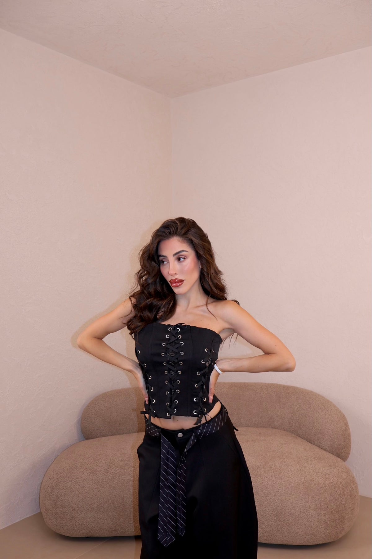 Corsetto con stringhe regolabili e cerniera sul retro. La modella indossa taglia S.