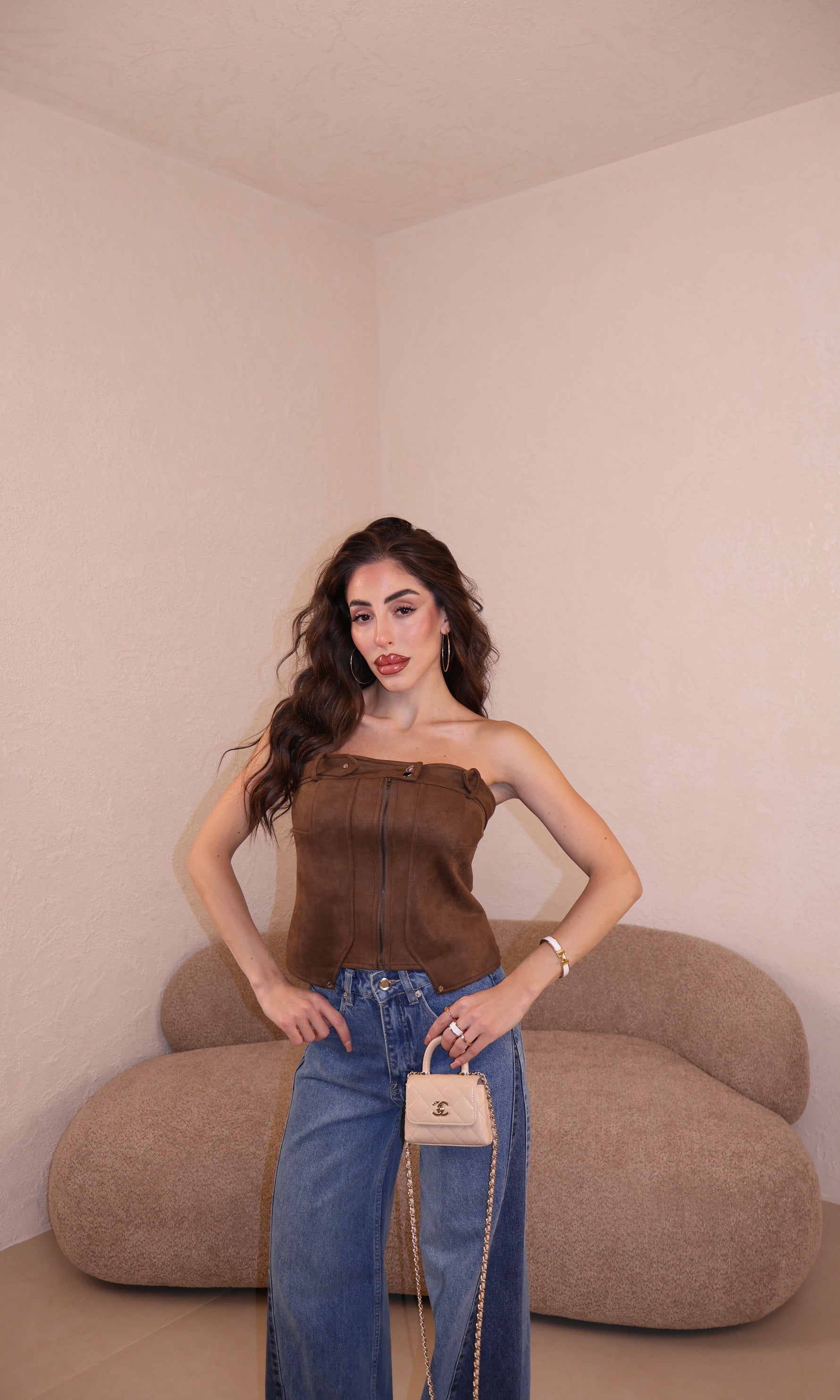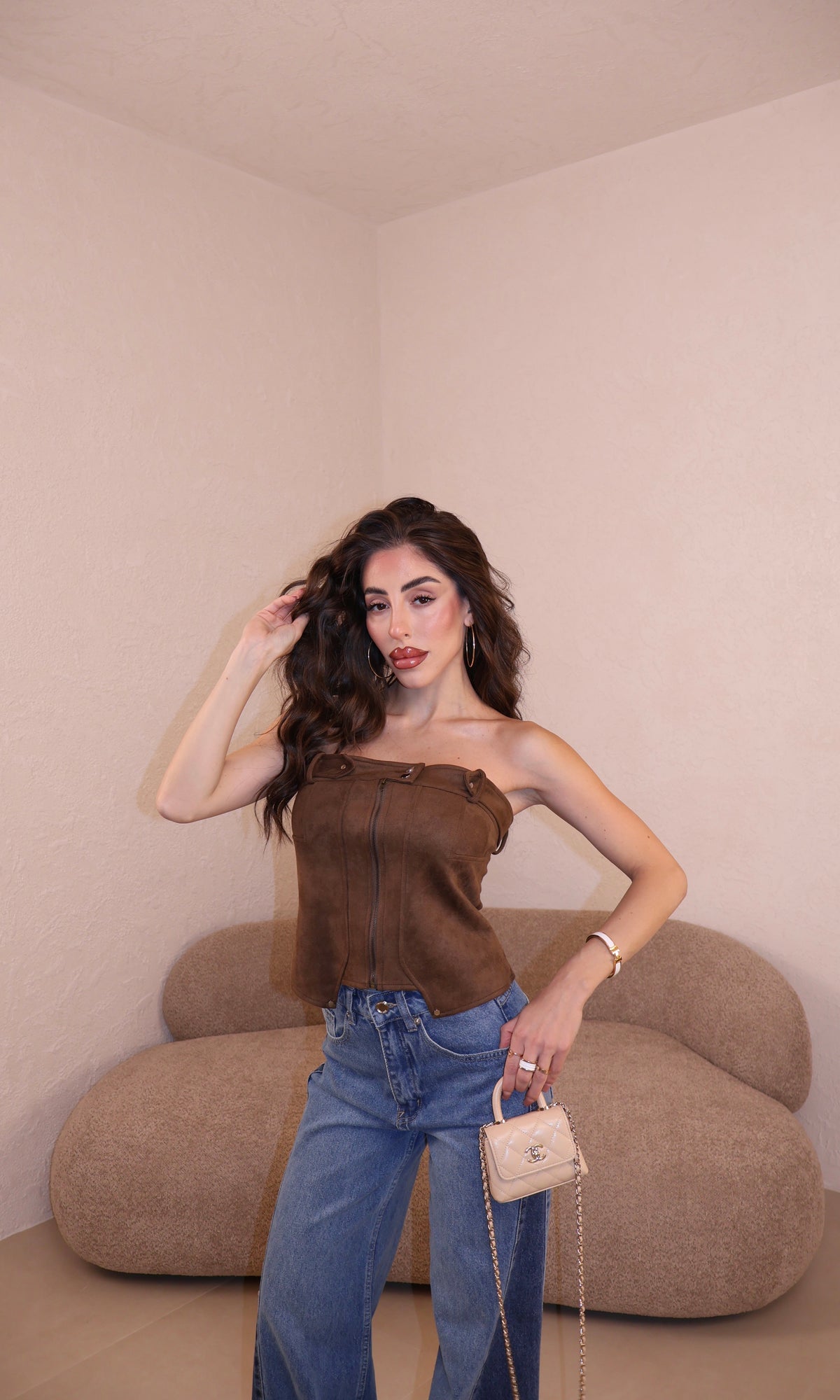 Corsetto in ecocamoscio con cerniera frontale. La modella indossa taglia S.