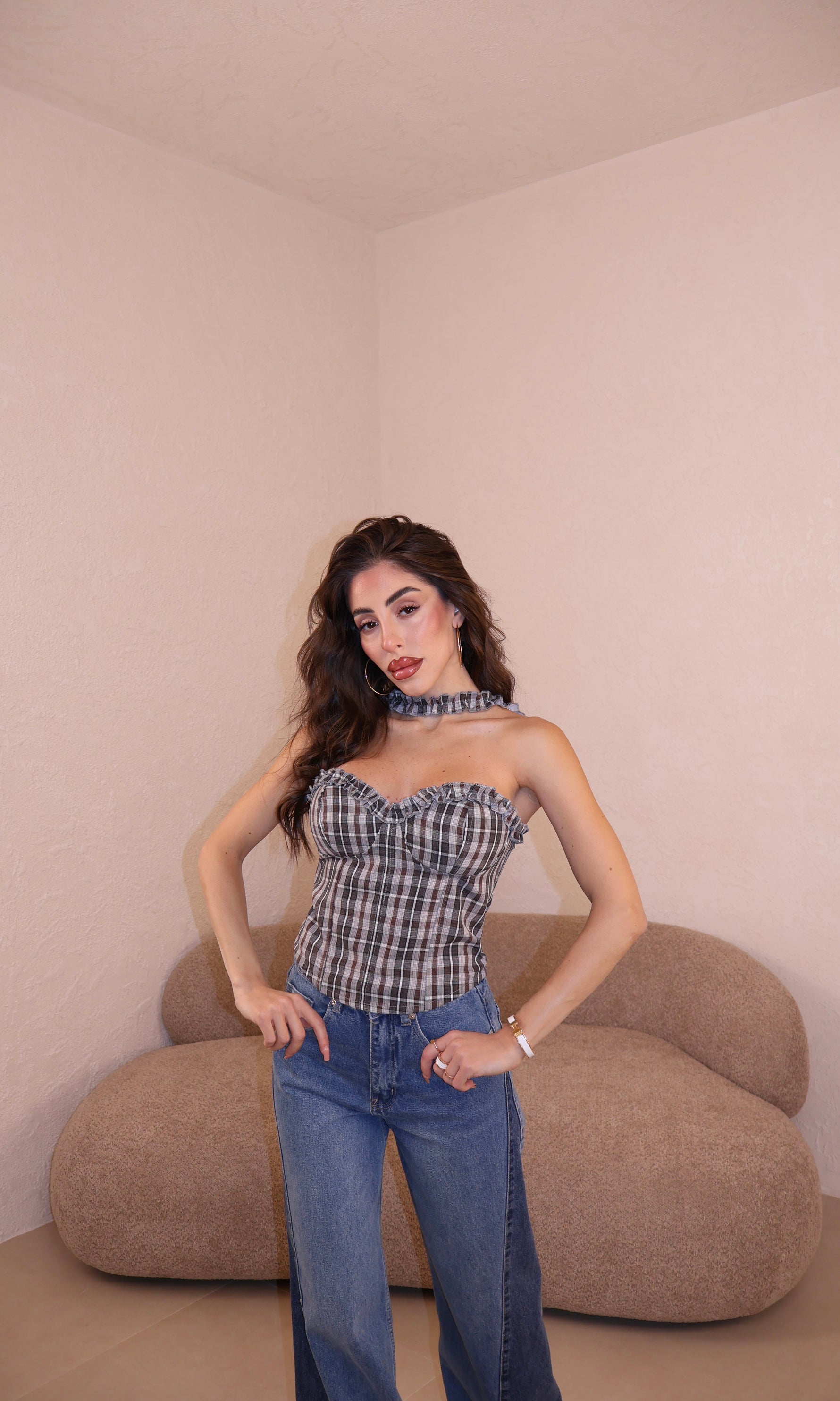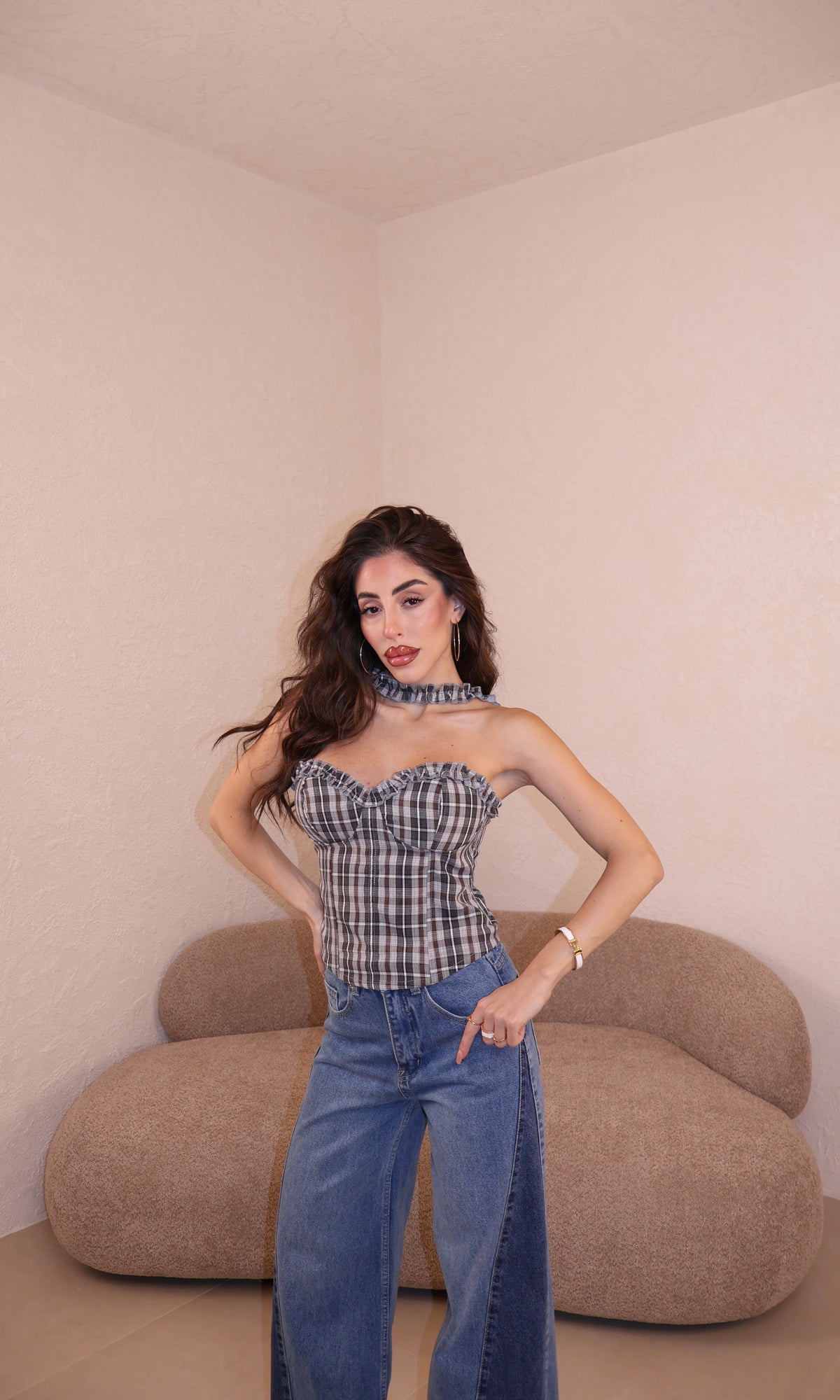 Corsetto nella fantasia a quadretti con collarino. La modella indossa taglia S/M.