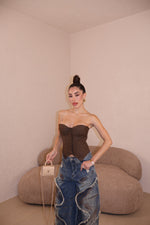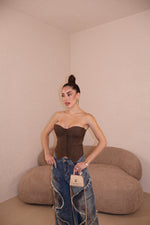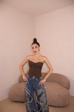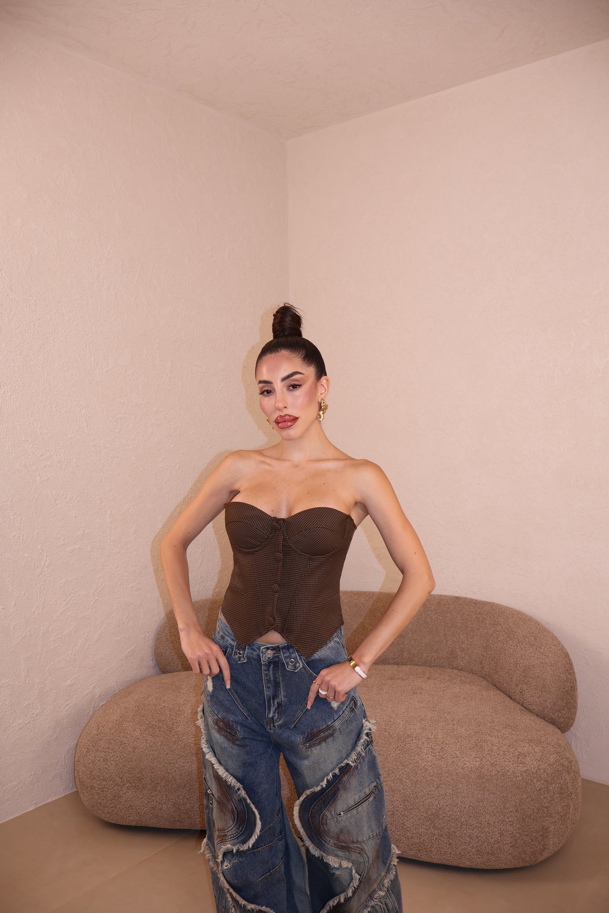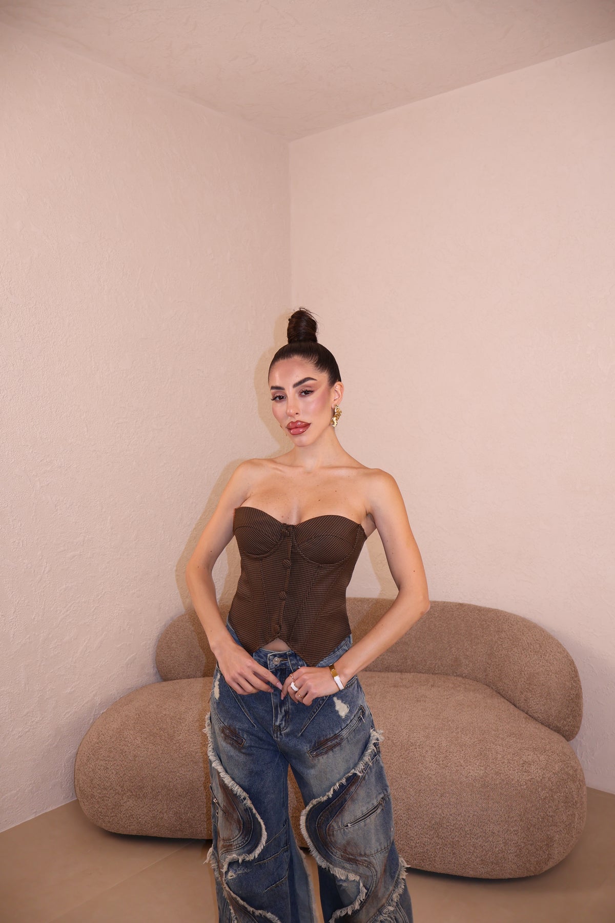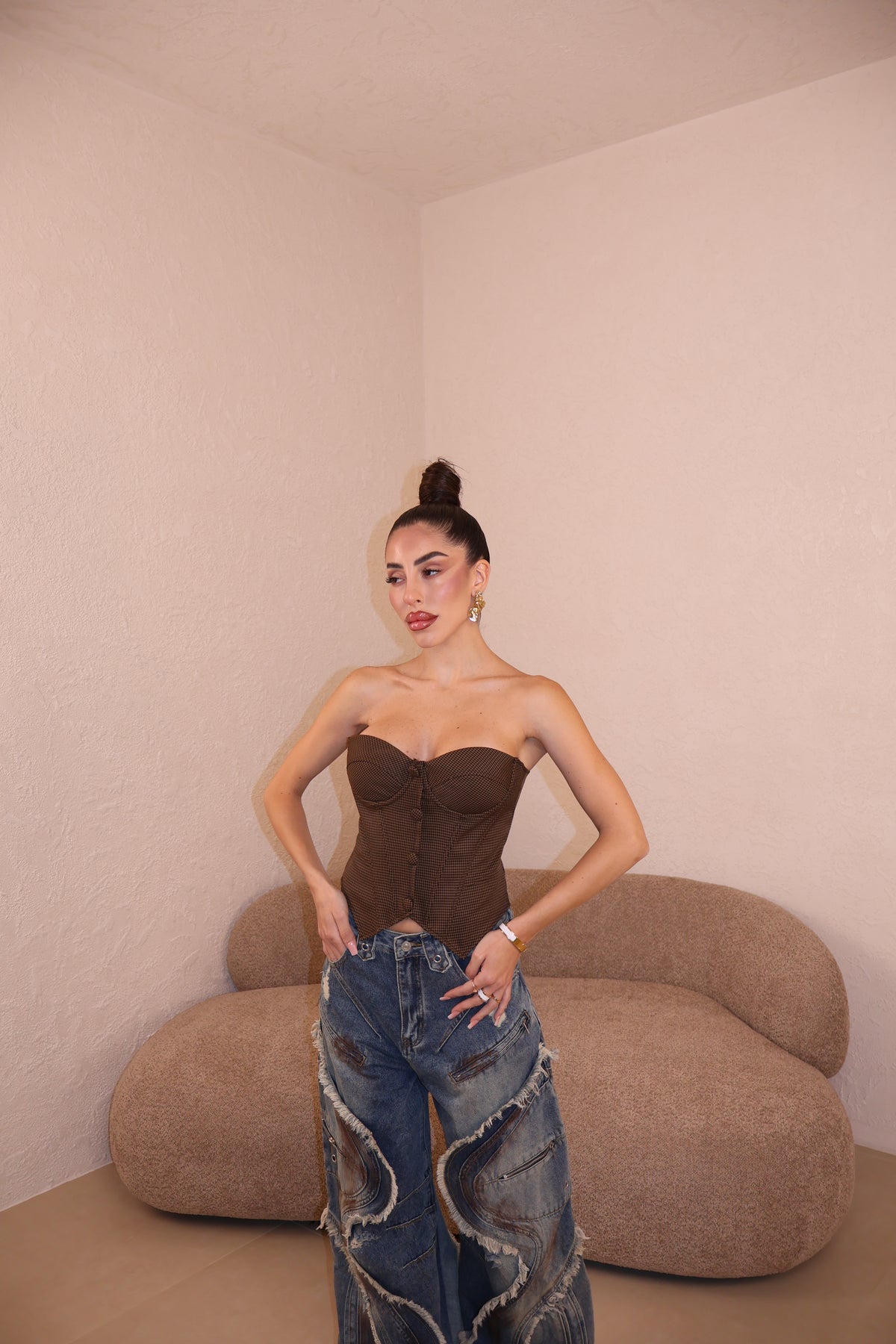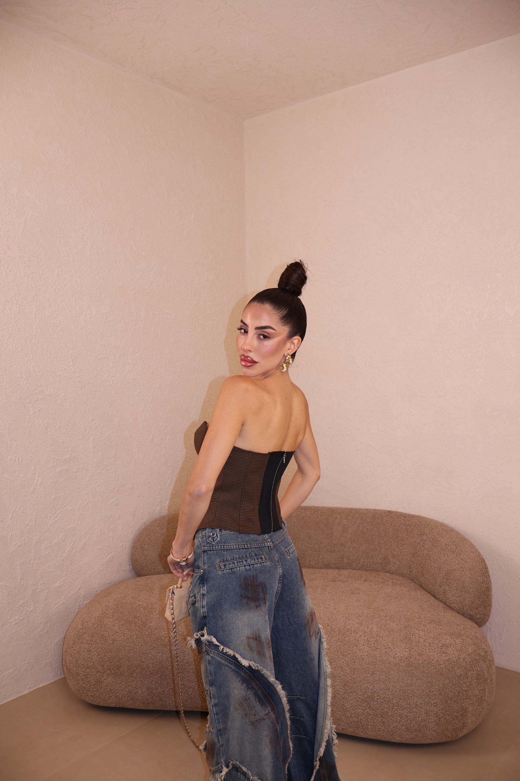 Corsetto a quadri vichy con cerniera ed elastico sul retro. Coppe preformate. La modella indossa taglia S/M.