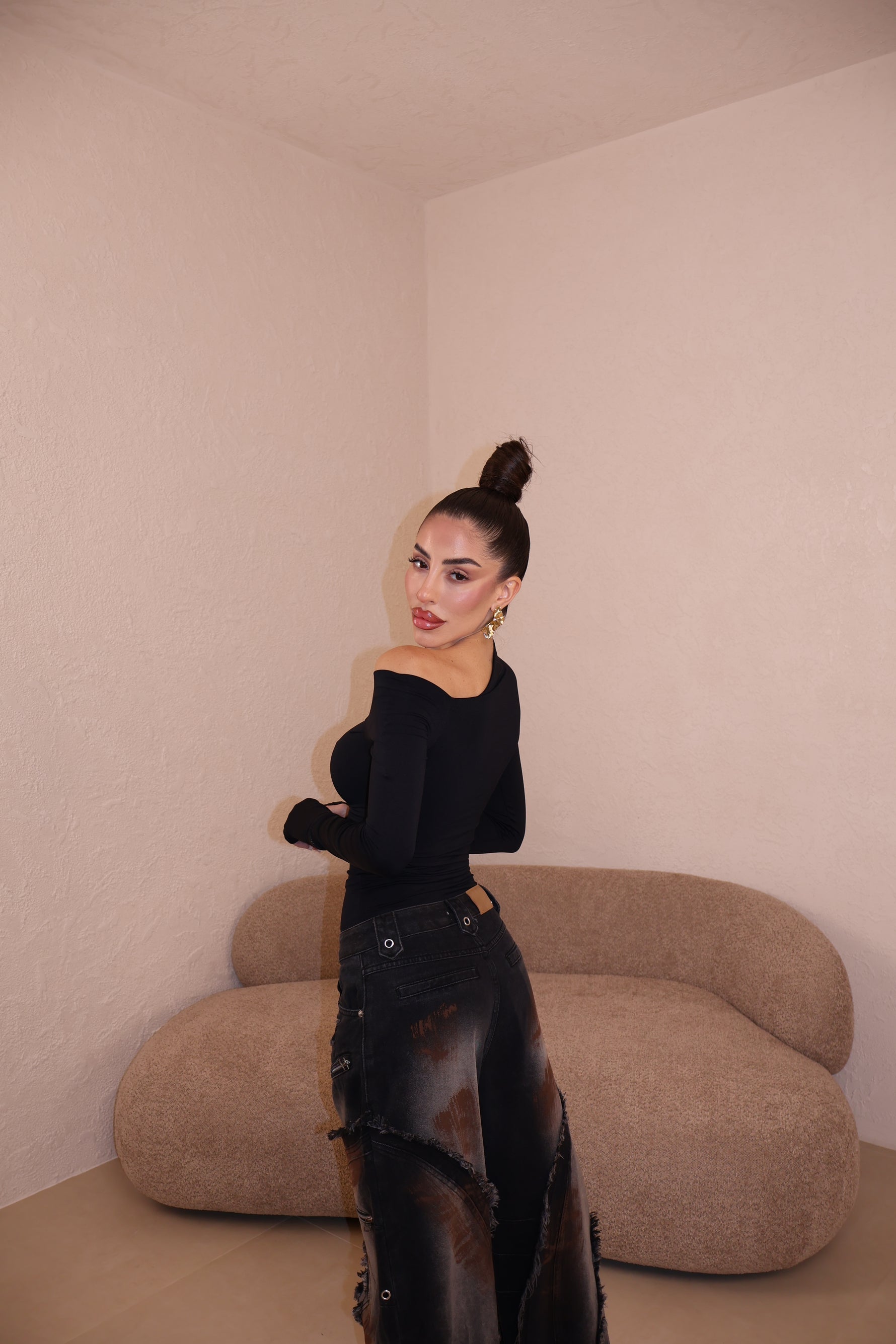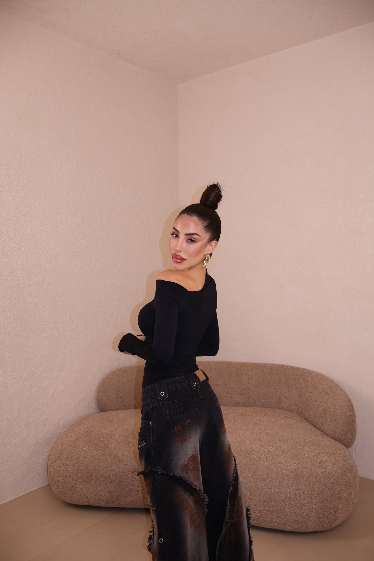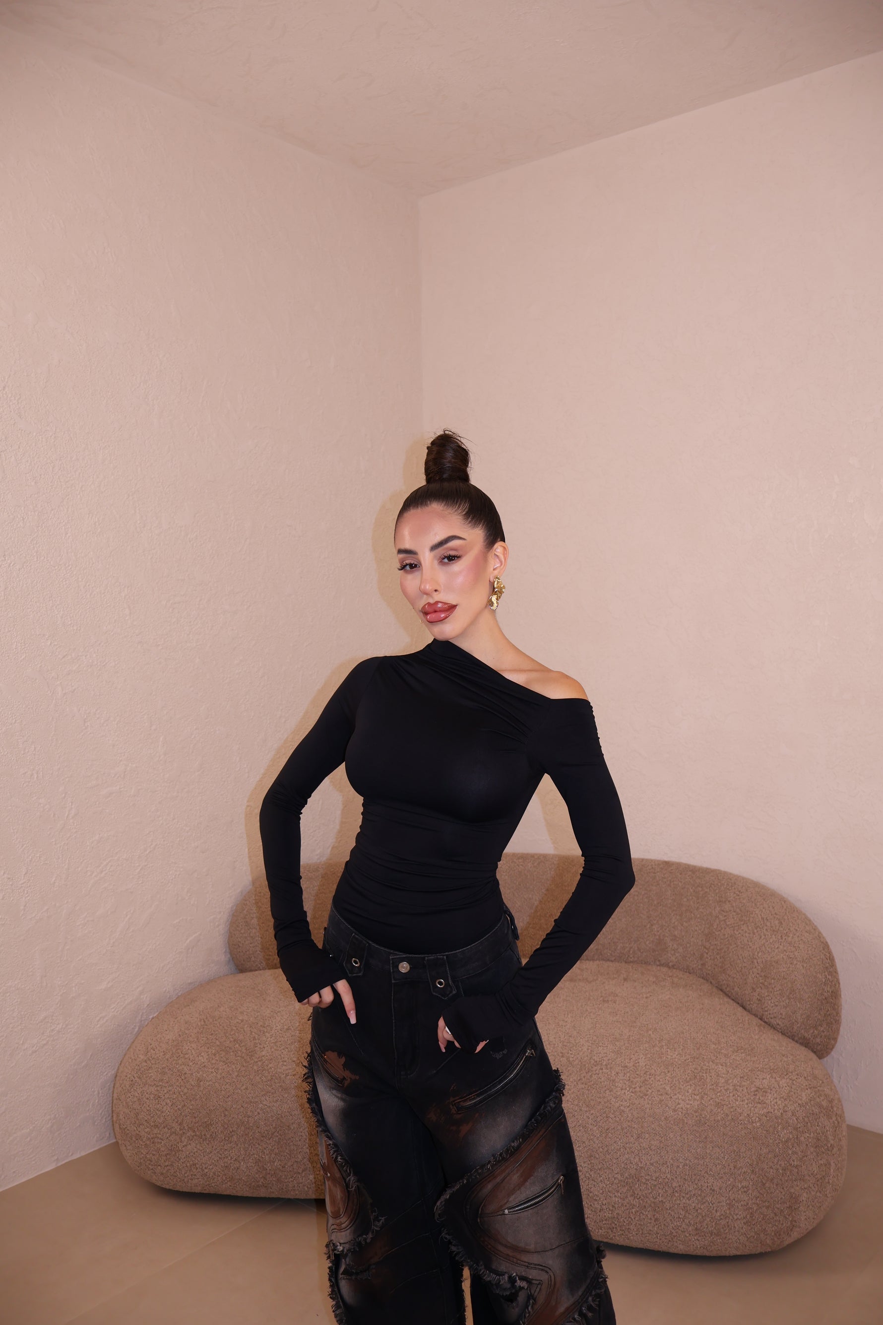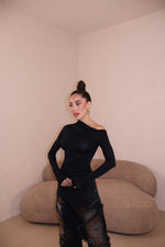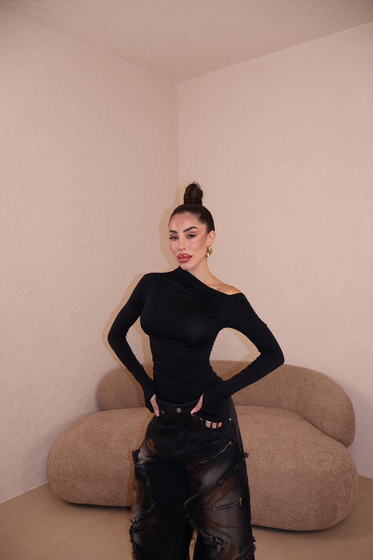 Maglia monospalla in licra elasticizzata con maniche a guanto. Taglia unica.