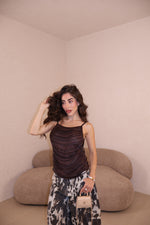 Top velato con fili in ecopelle, bretelle regolabili e schiena scoperta. La modella indossa taglia S/M.
