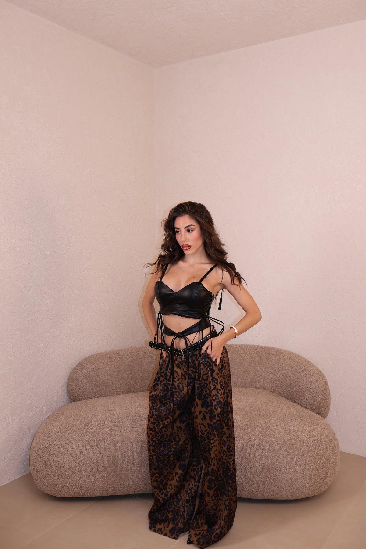 Top corto in similpelle con stringhe laterali, bretelle regolabili, laccetti in vita e cerniera sul retro. La modella indossa S.