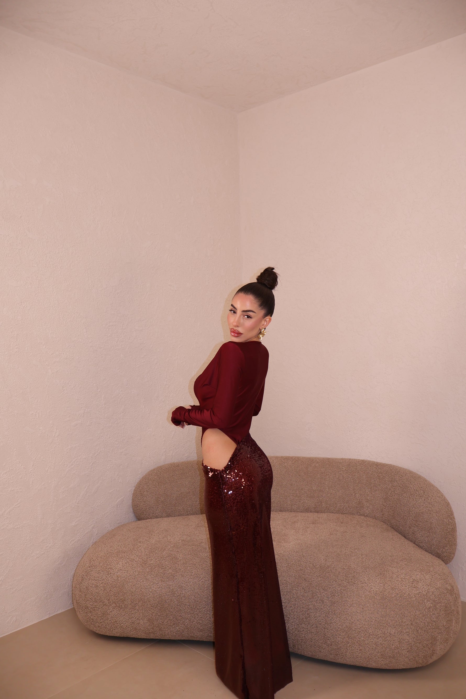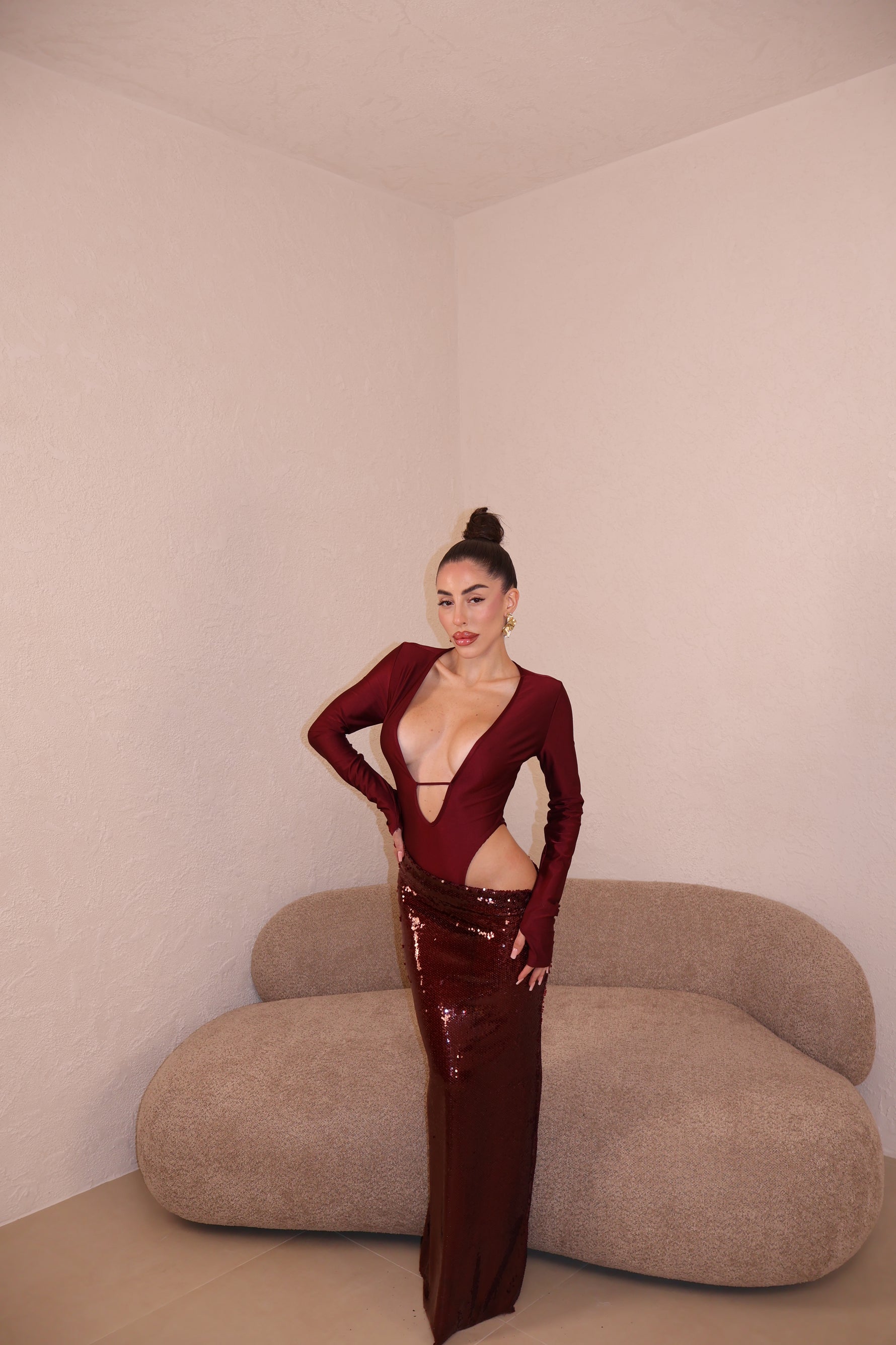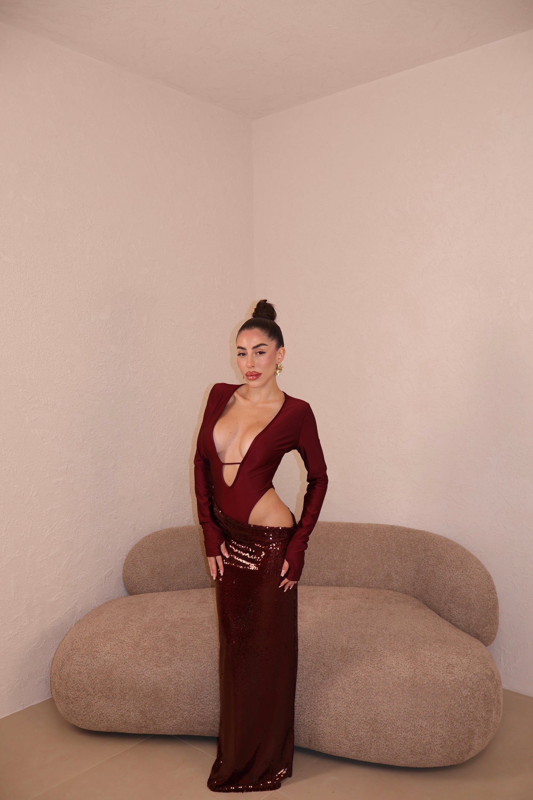 Abito lungo composto da body e gonna in paillettes uniti. Taglia unica.