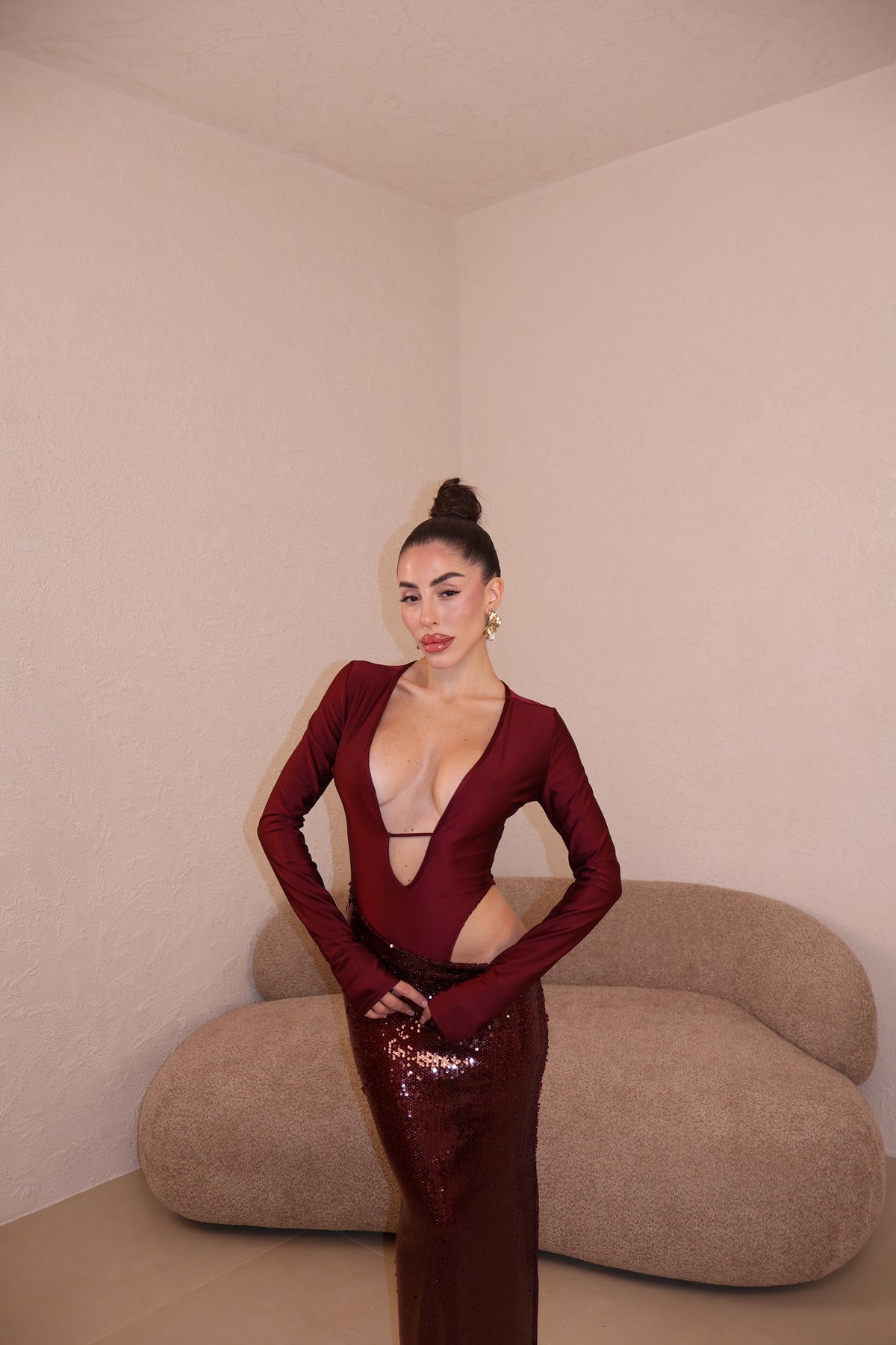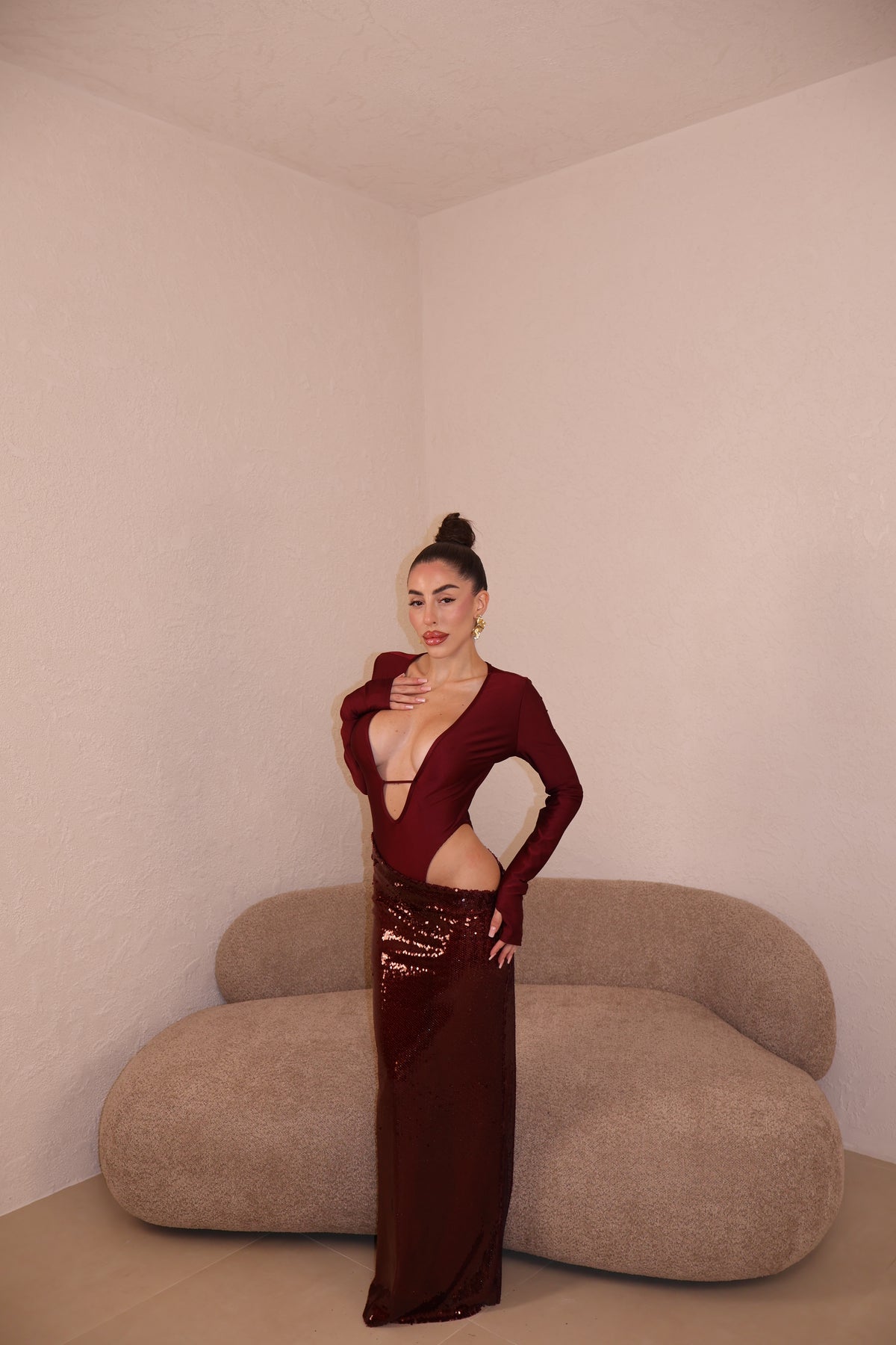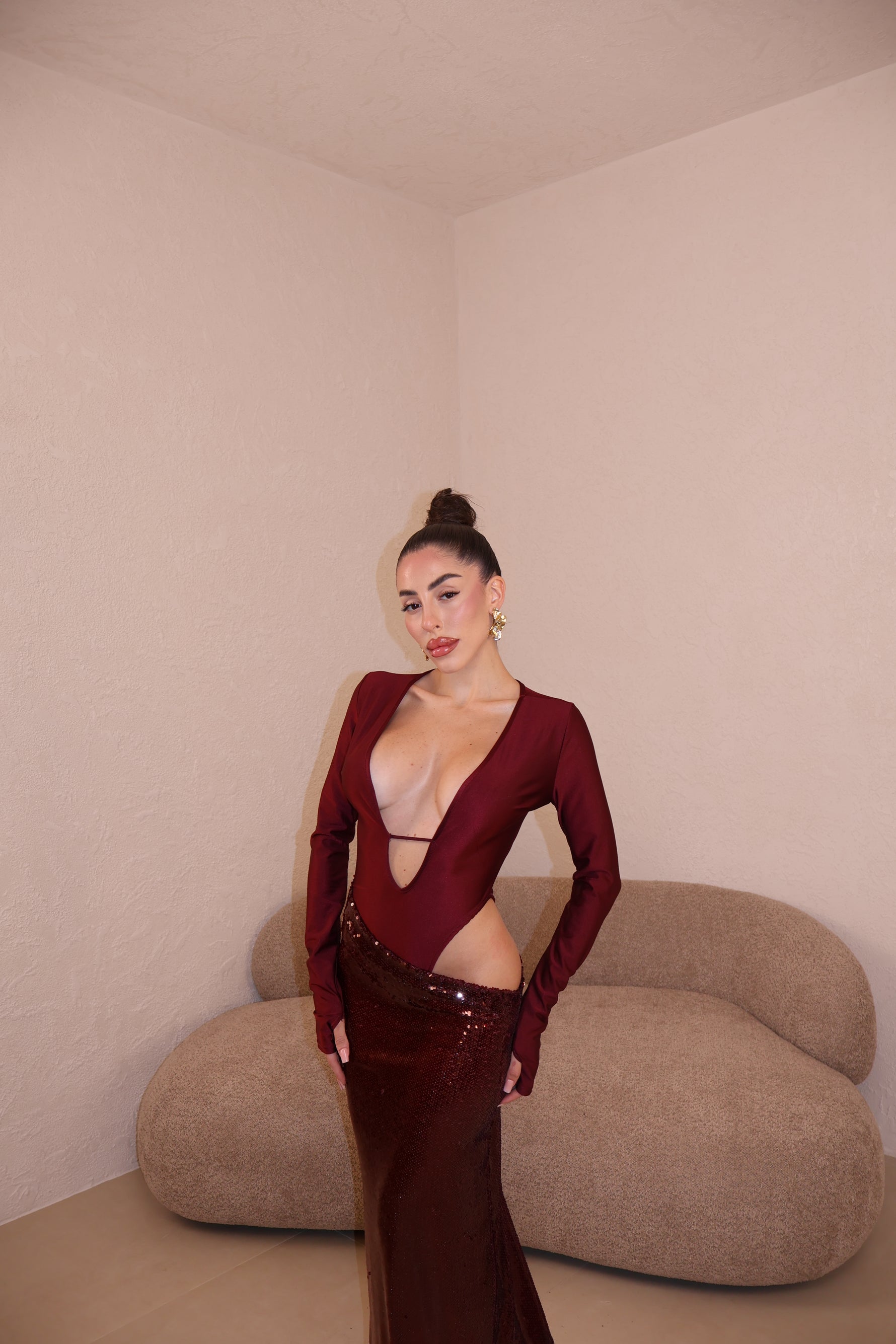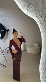 Abito lungo composto da body e gonna in paillettes uniti. Taglia unica.
