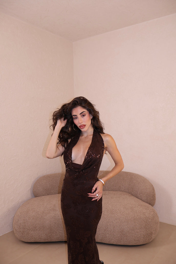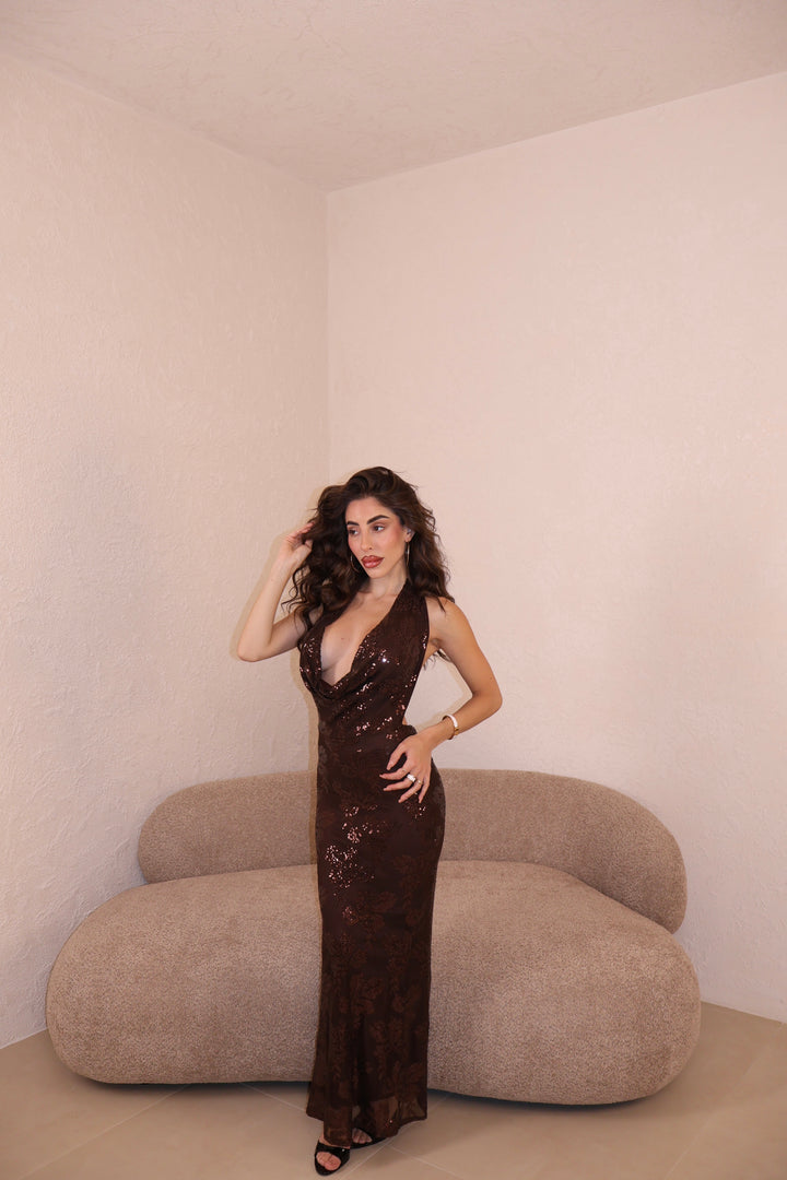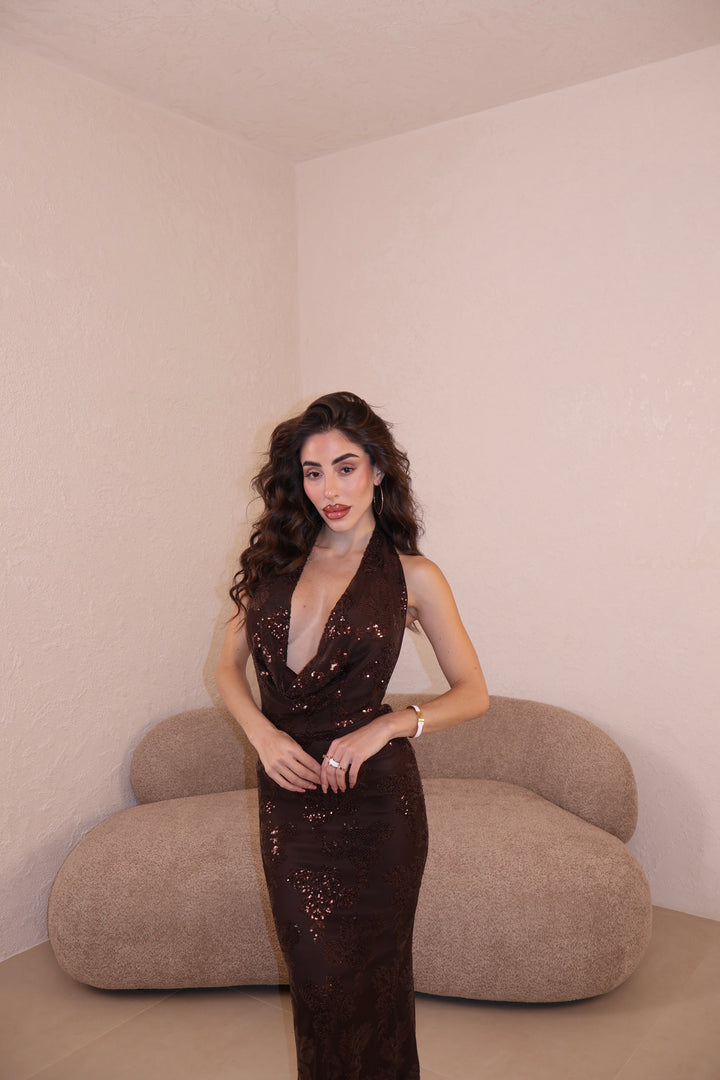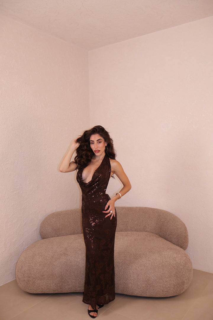 Abito lungo con scollo morbido e dettagli in paillettes. Taglia unica.